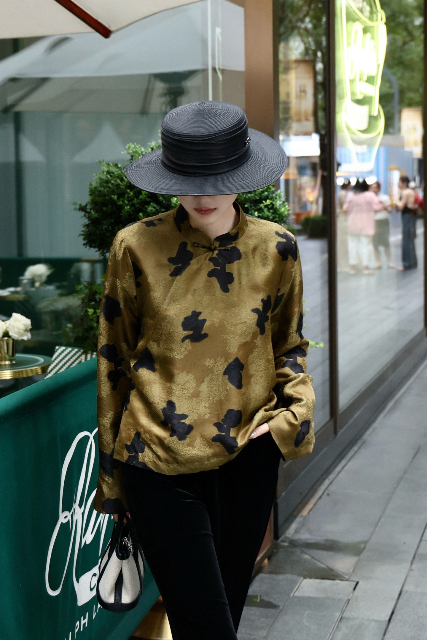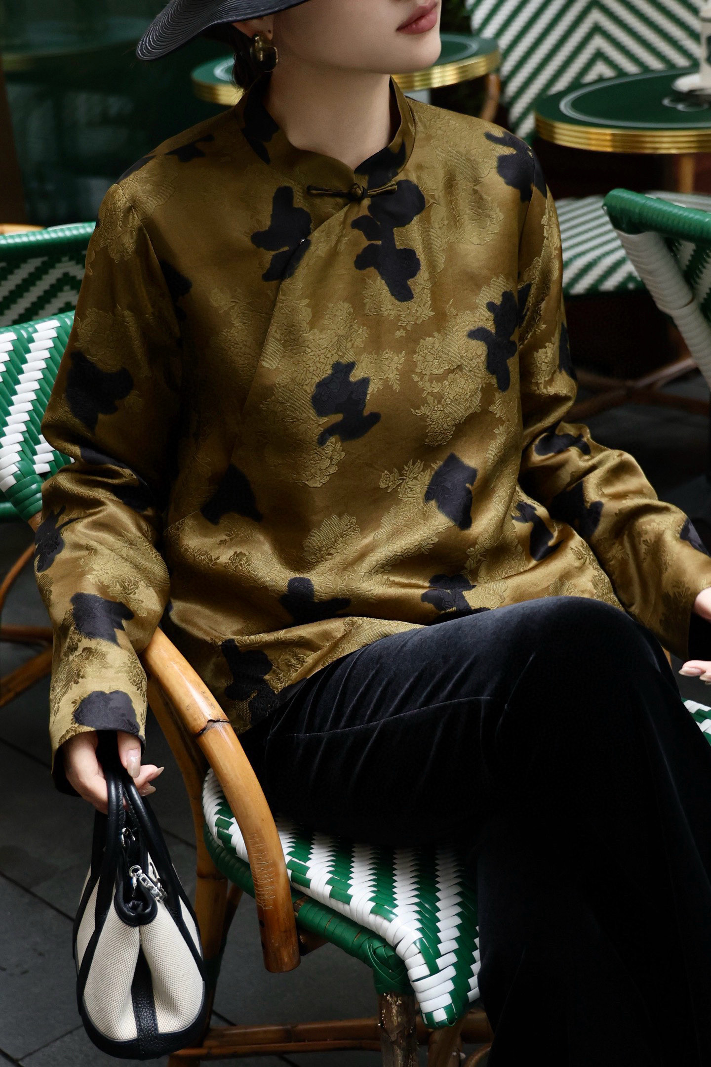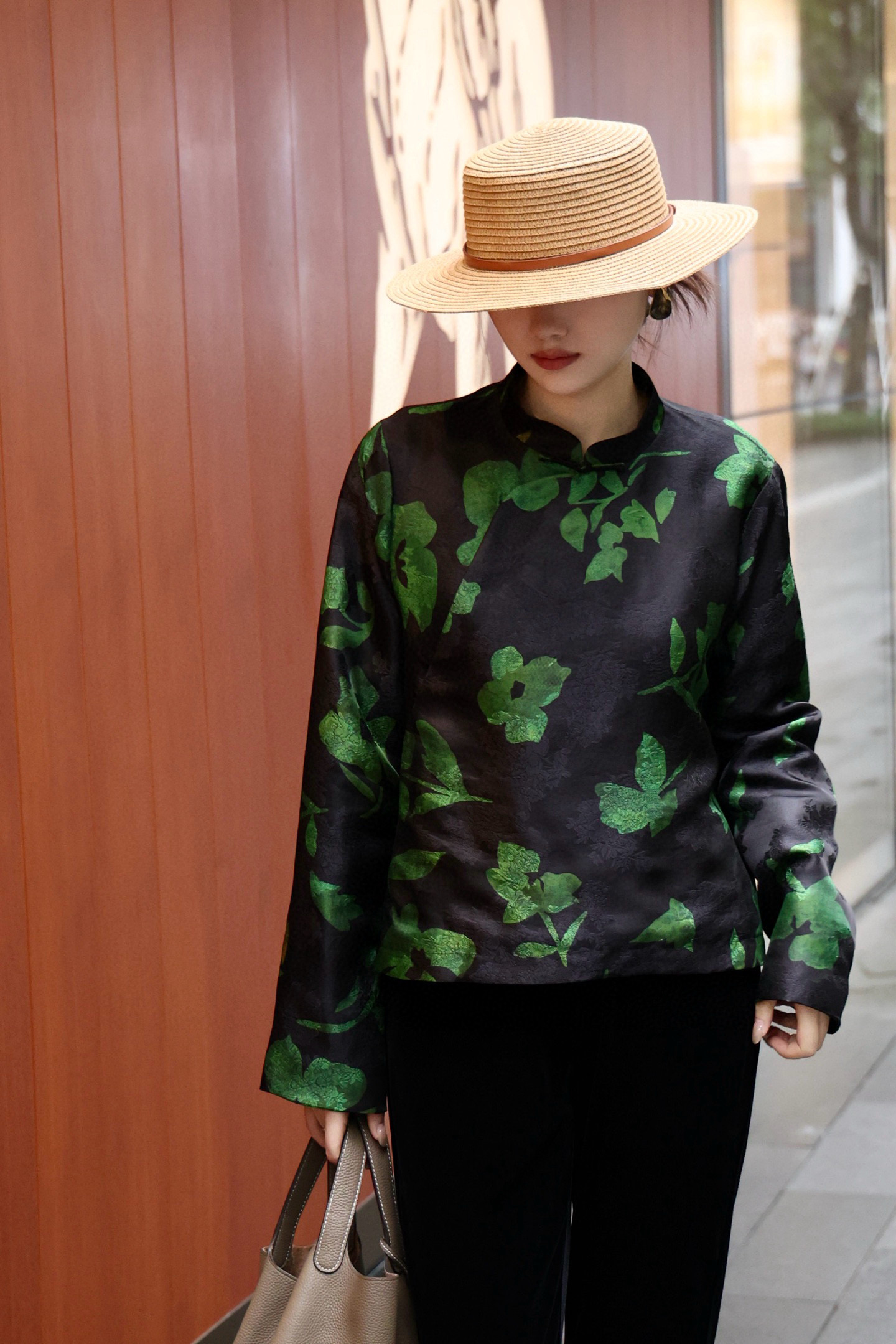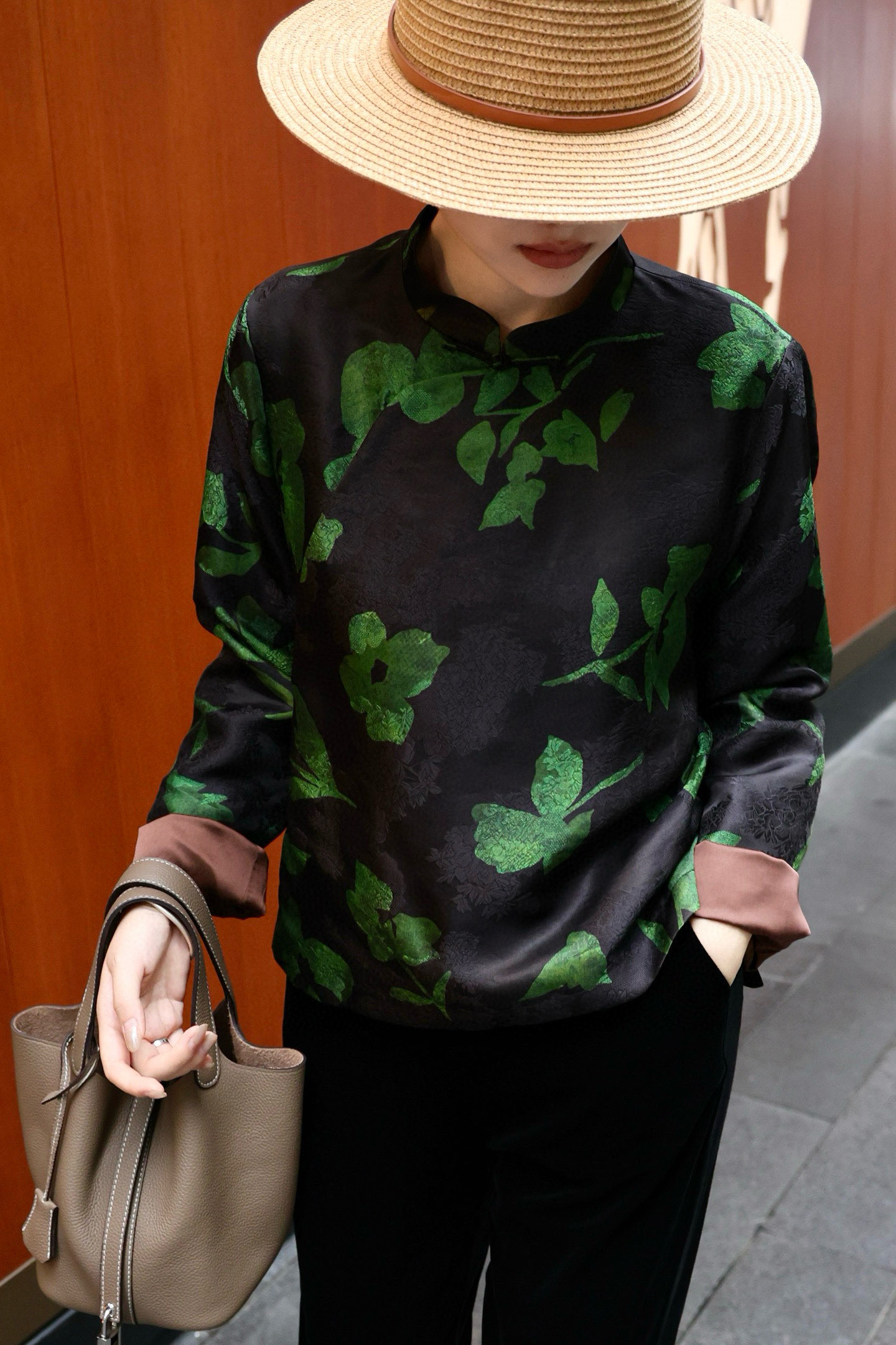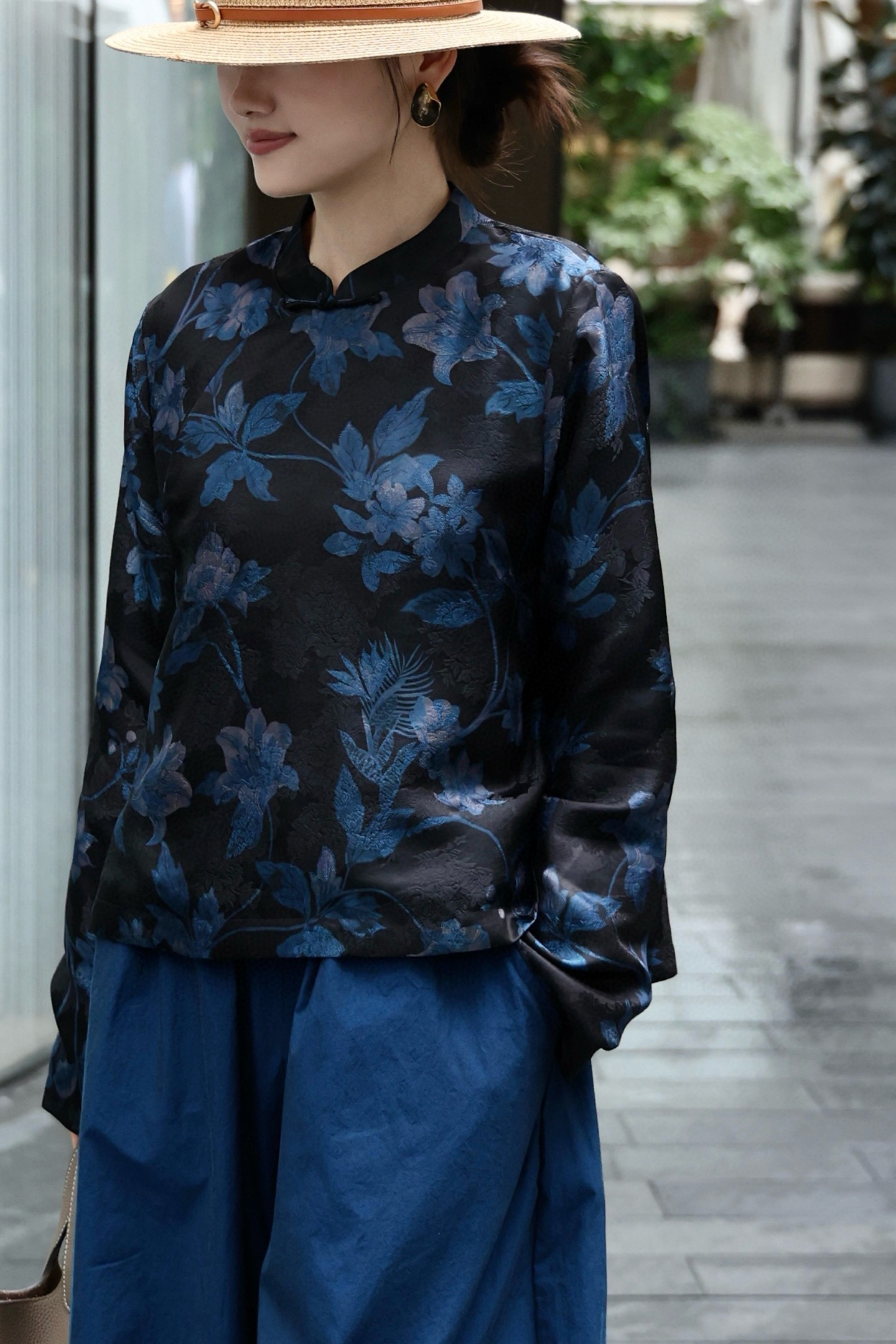 Elegant Silk Blouse with Floral Print, Classic Mandarin Collar, and Frog Closures