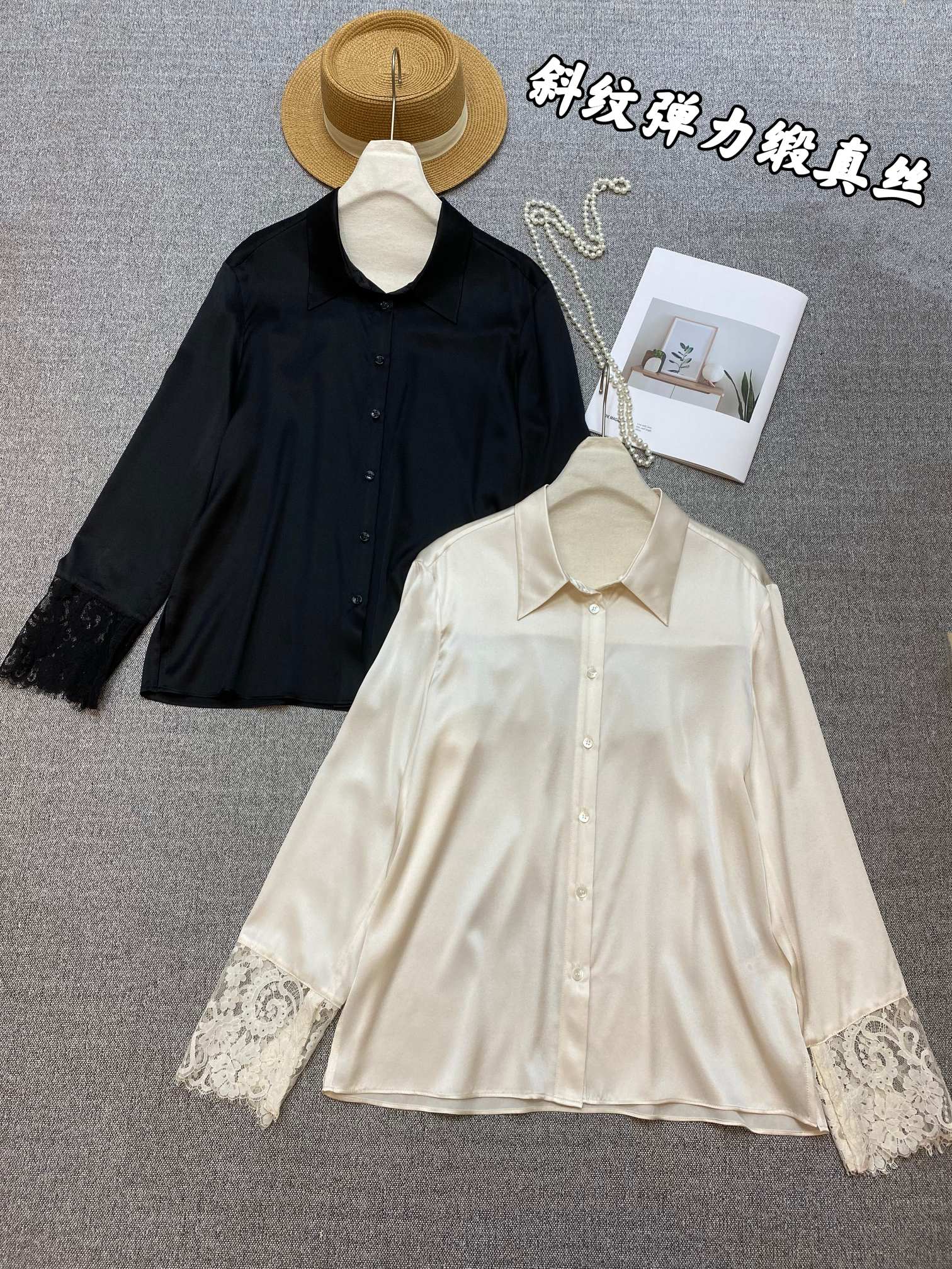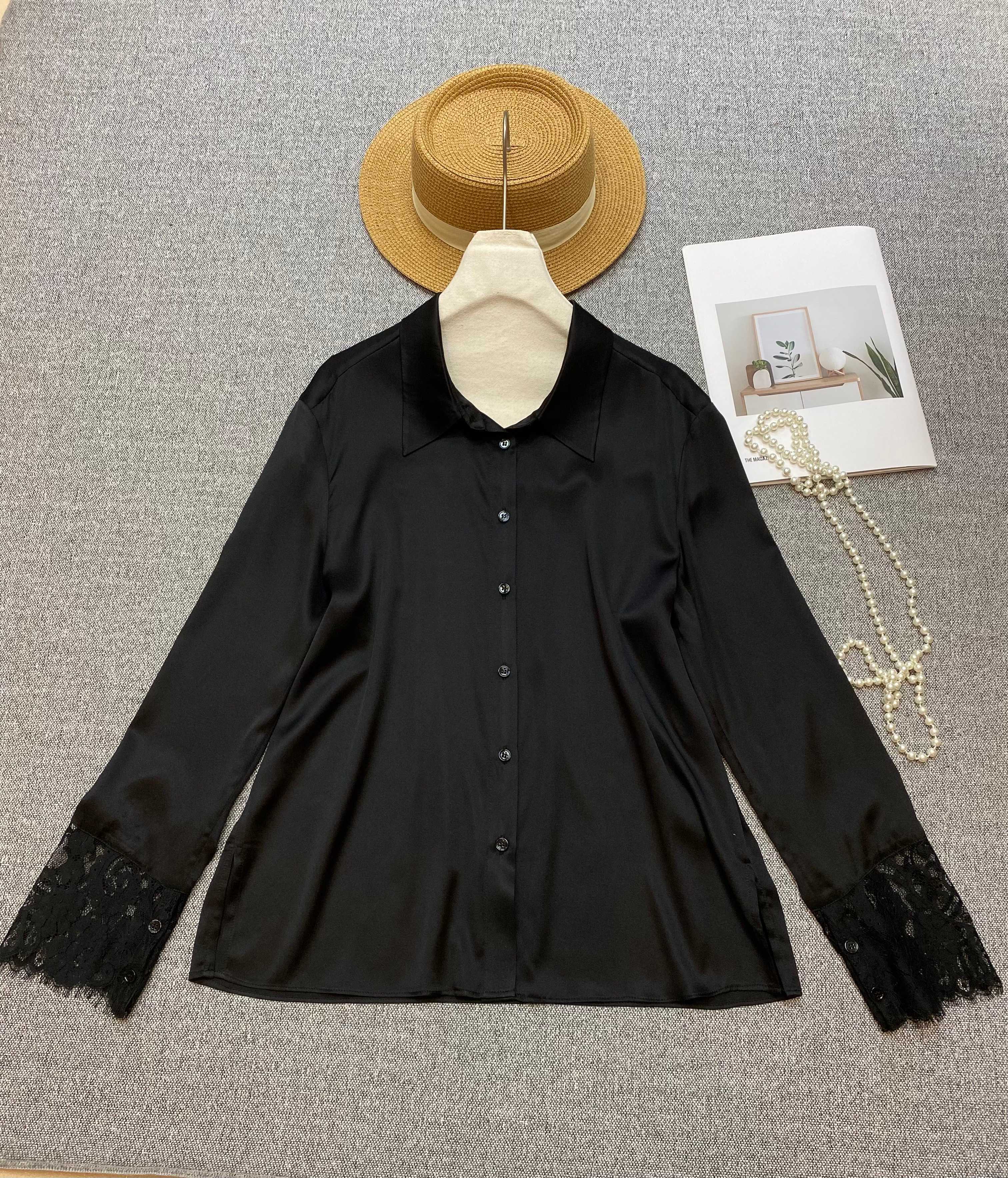 Elevate your wardrobe with this silk blouse! Featuring delicate lace trim, long sleeves, and a versatile design for any occasion.