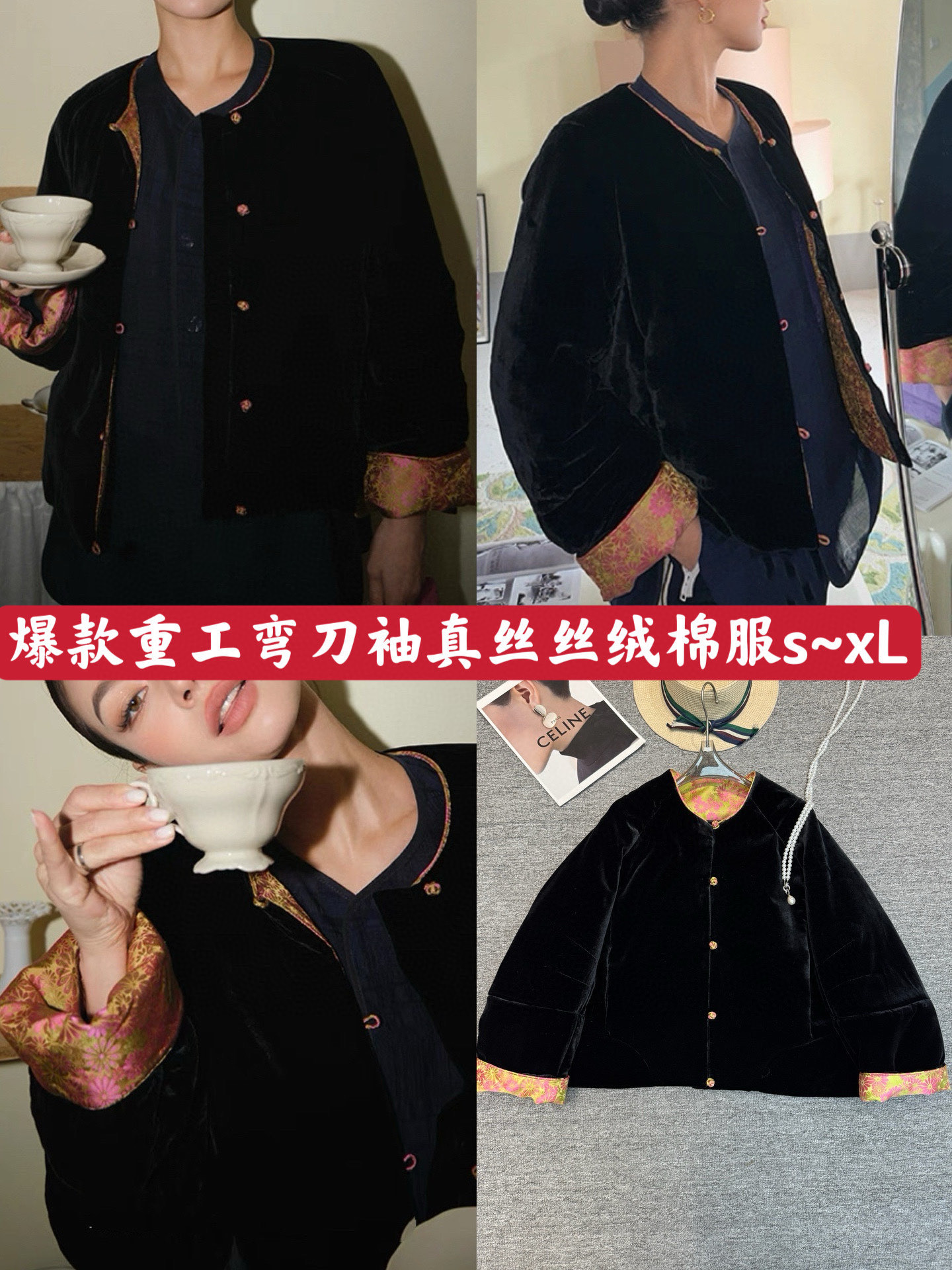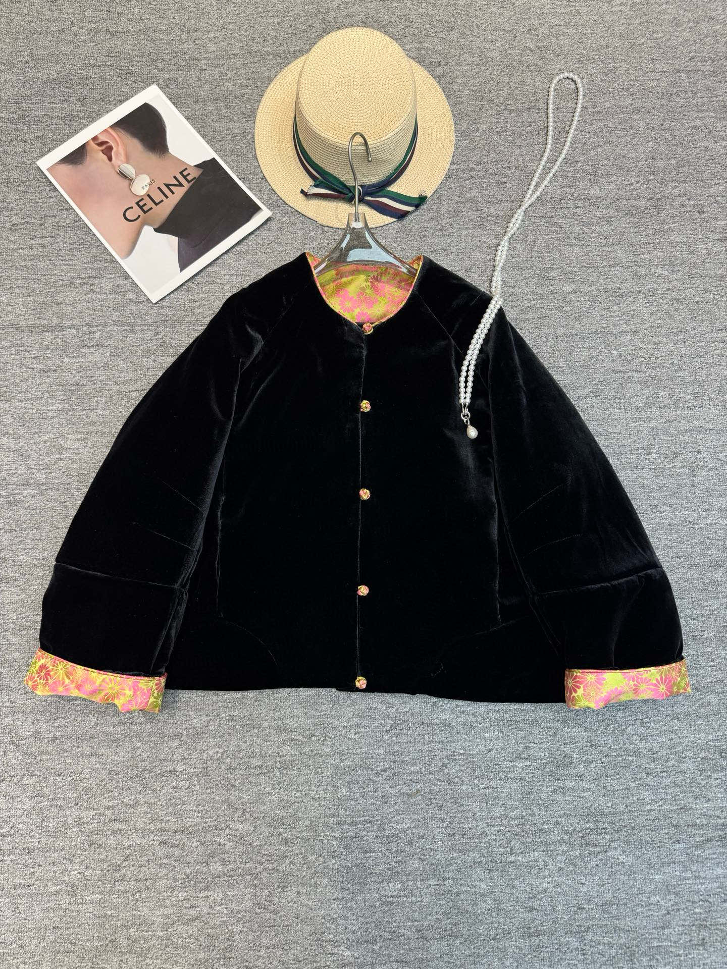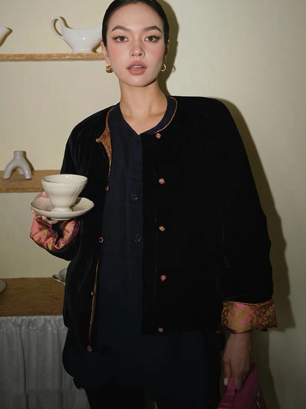 Elegant Silk Velvet Jacket with Mandarin Collar and Unique Cuff Design