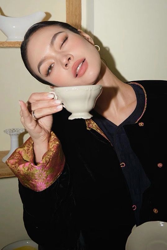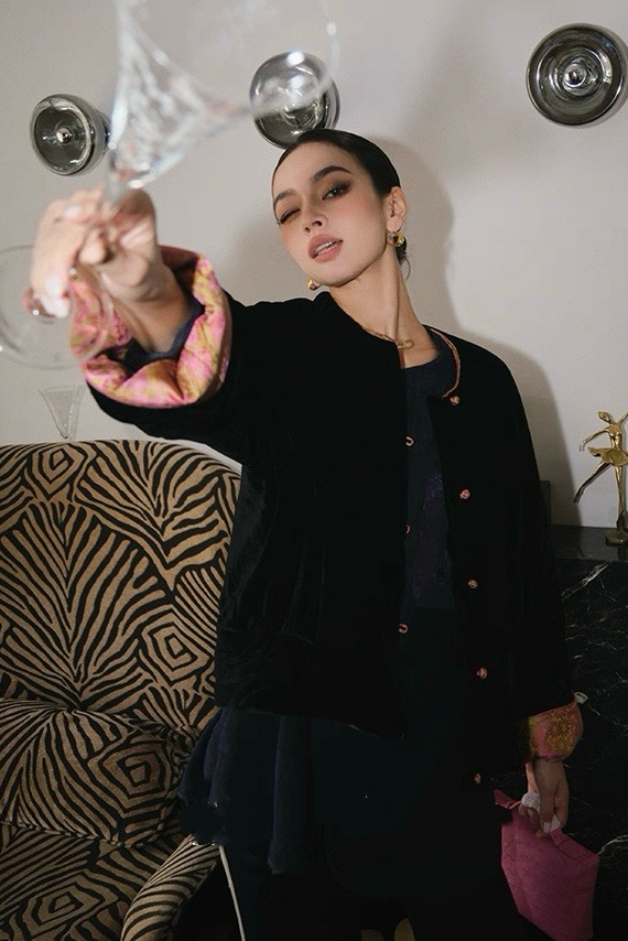 Elevate your wardrobe with this modern and stylish silk velvet jacket. Featuring a mandarin collar and unique cuff details, this piece adds a touch of retro elegance to any outfit.