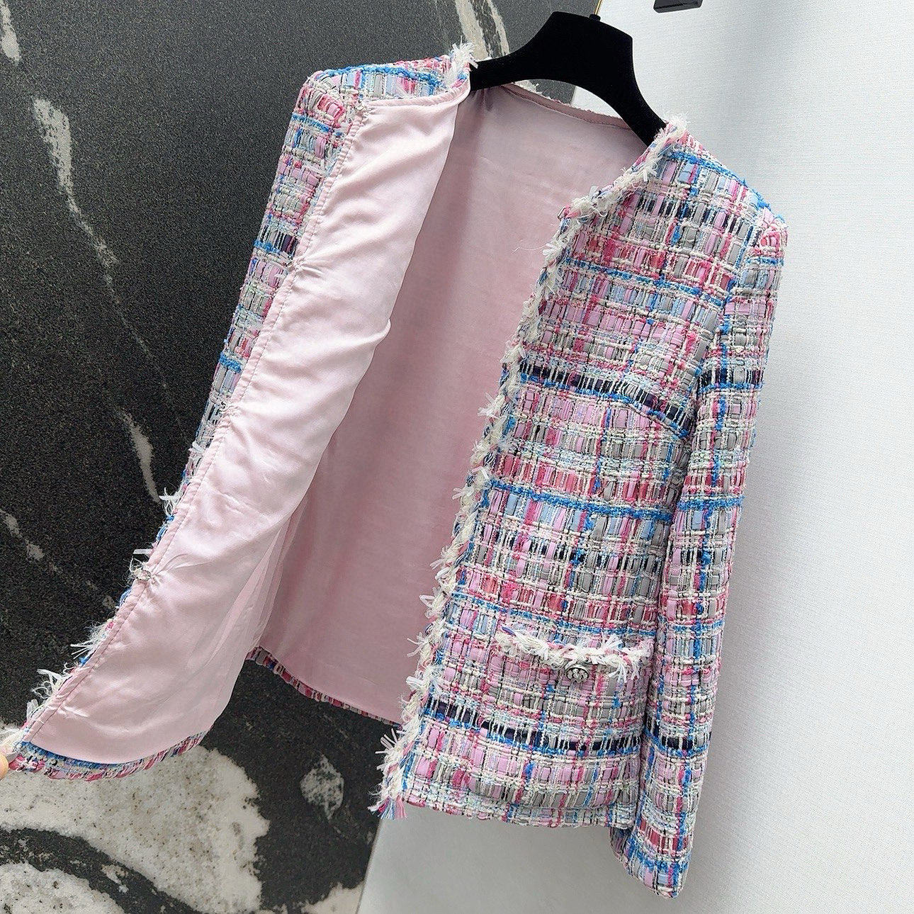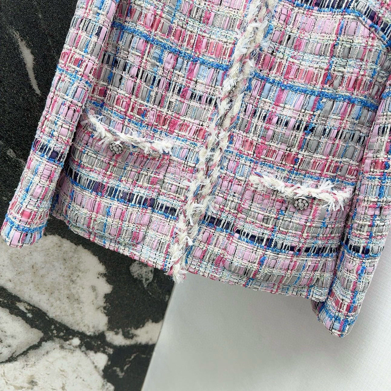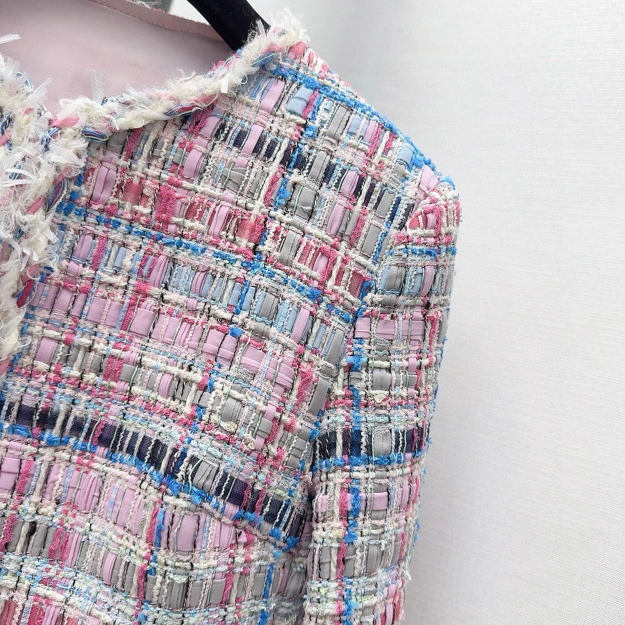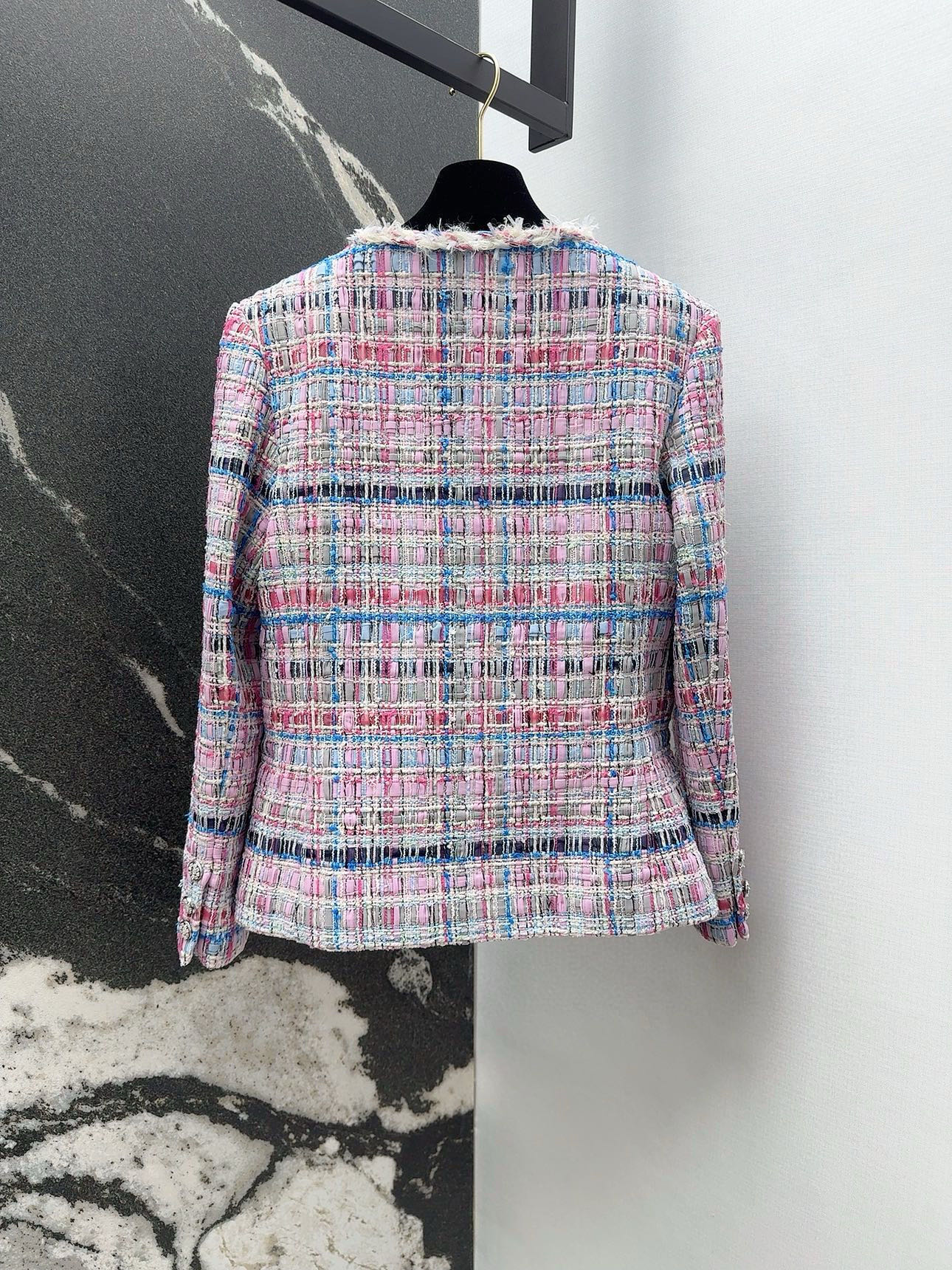 Elevate your wardrobe with this chic tweed jacket. Featuring a beautiful pink and blue weave, perfect for a sophisticated, timeless look. Available in sizes S-L.