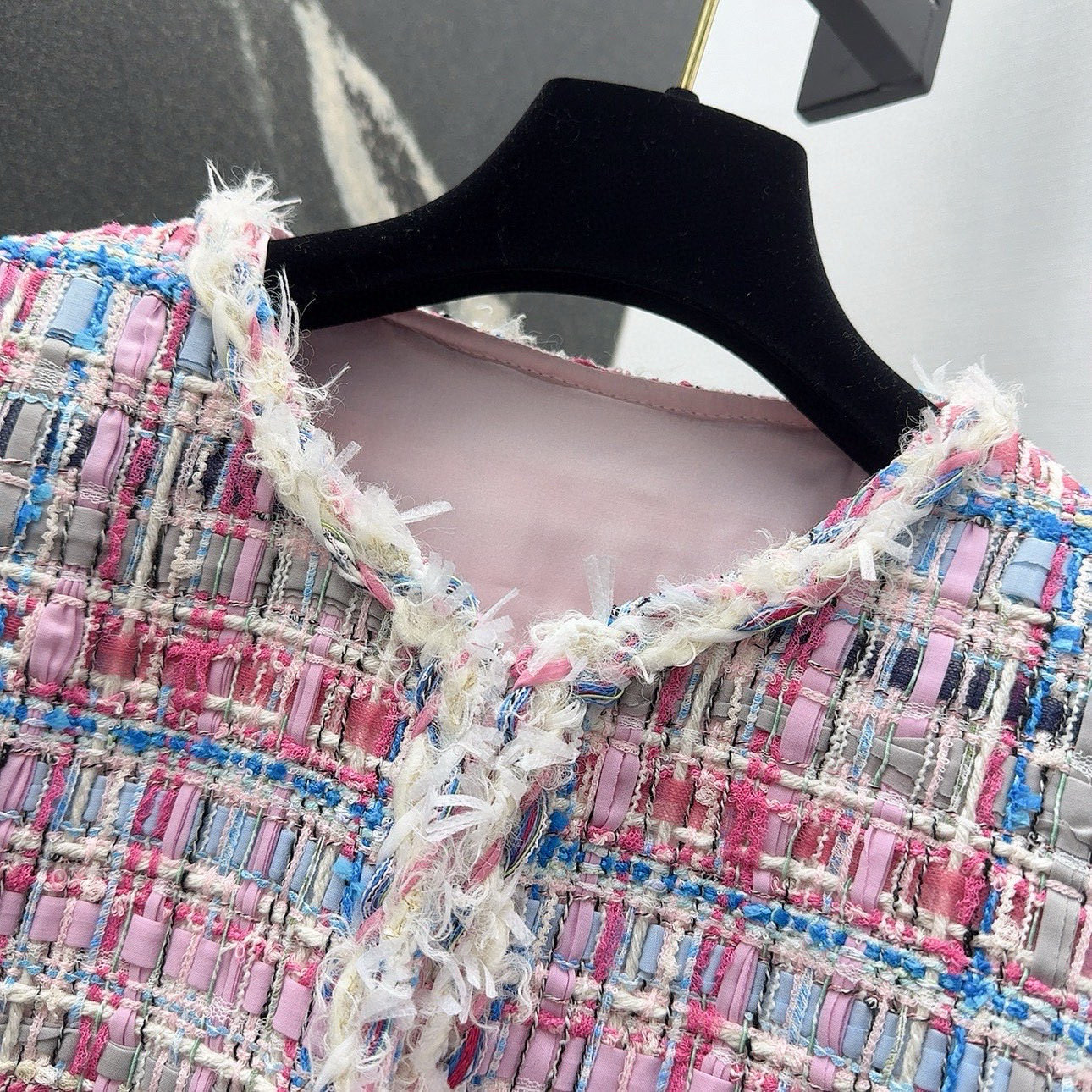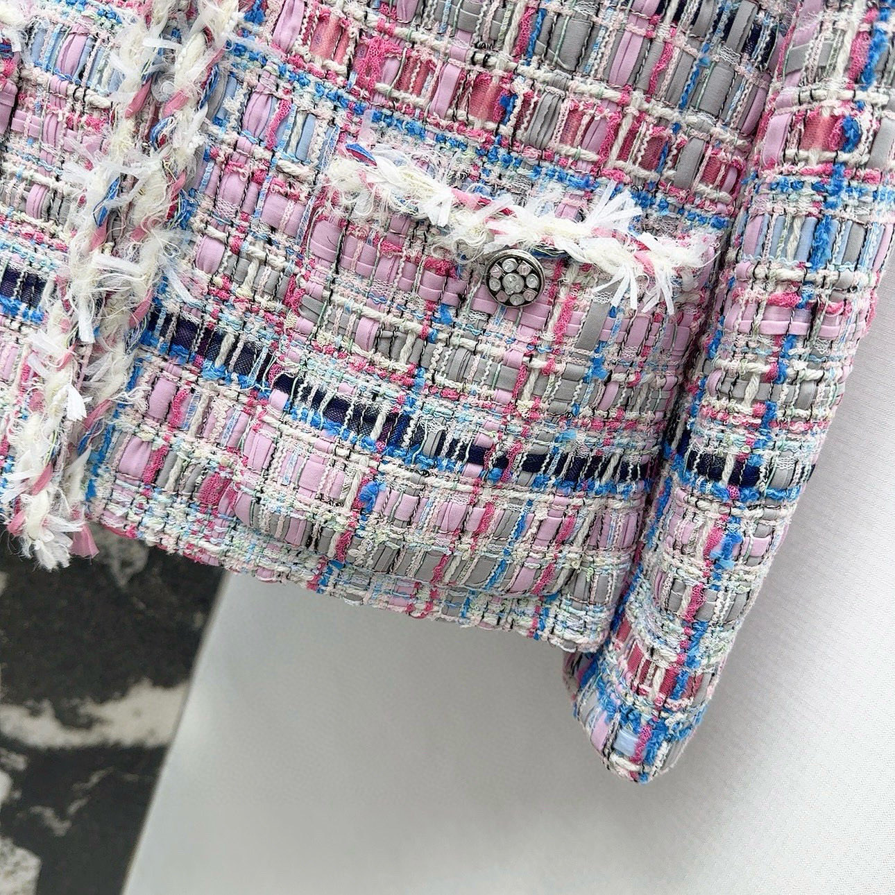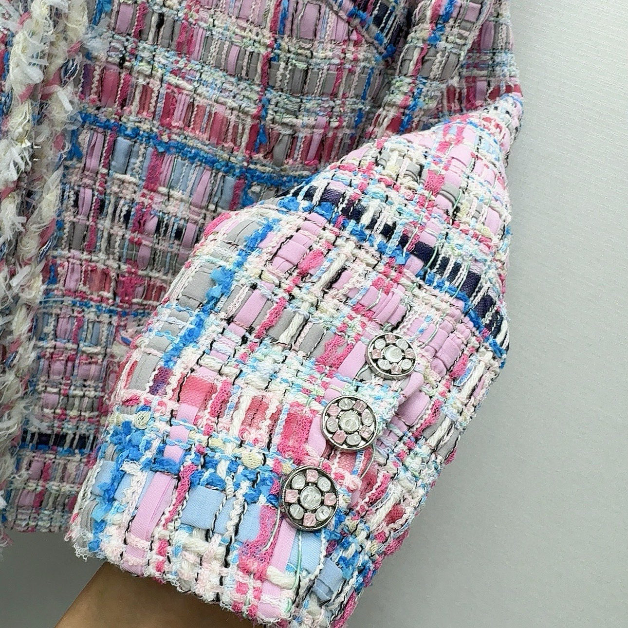 - Exquisite tweed fabric in pink and blue.