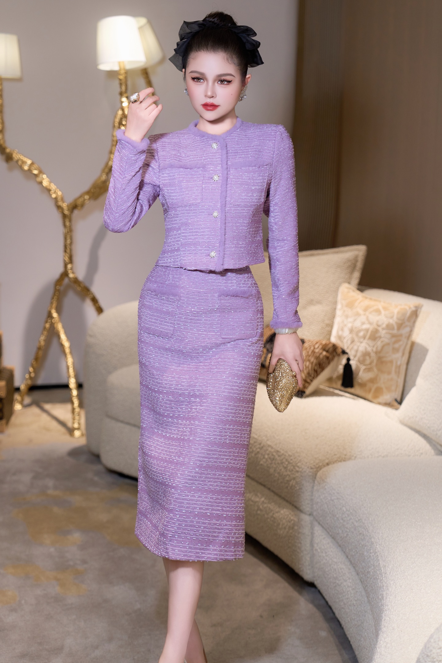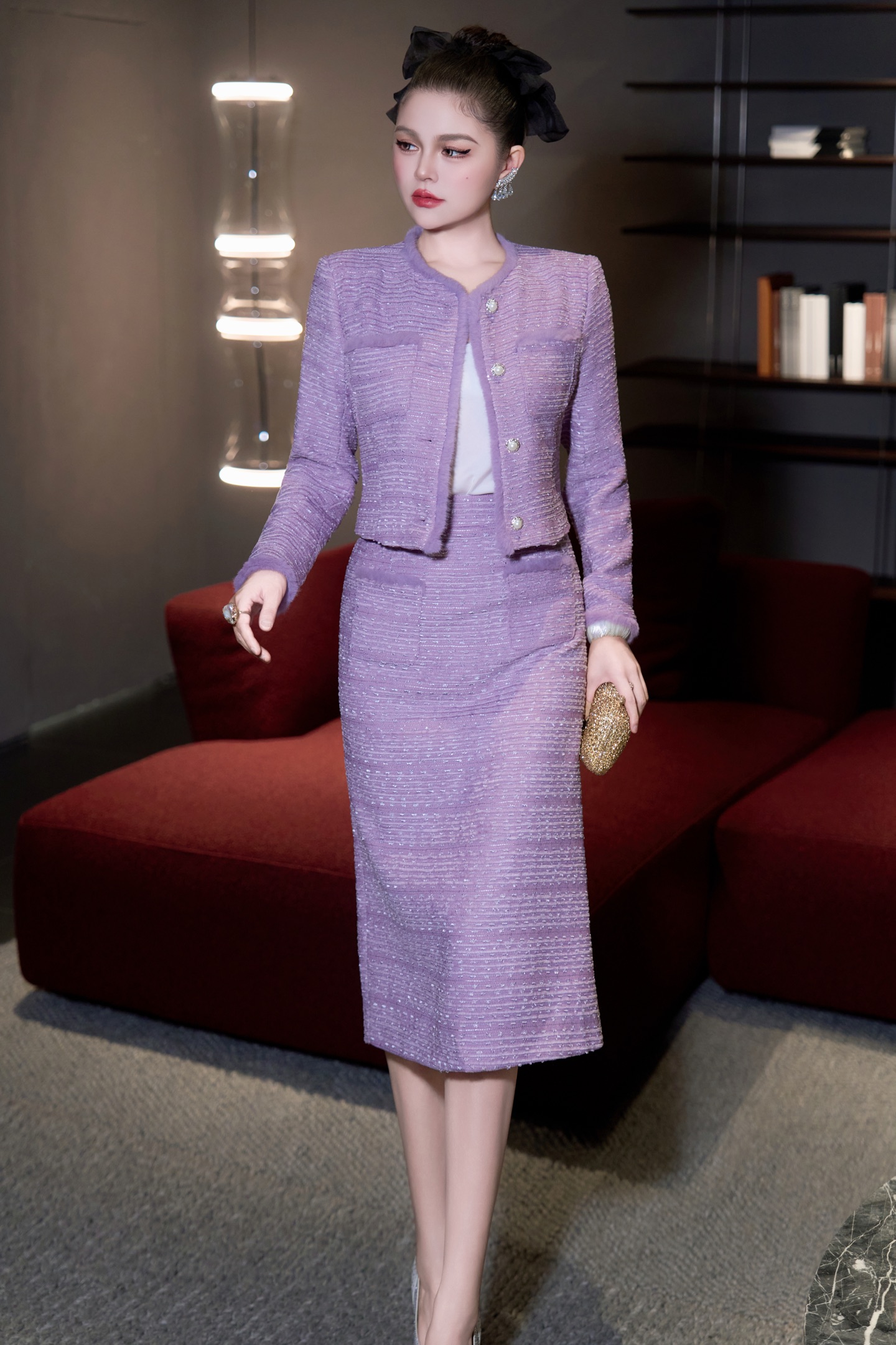 With its luxurious appearance and comfortable fit, this tweed skirt suit set is sure to make a statement wherever you go. A perfect blend of style and sophistication.