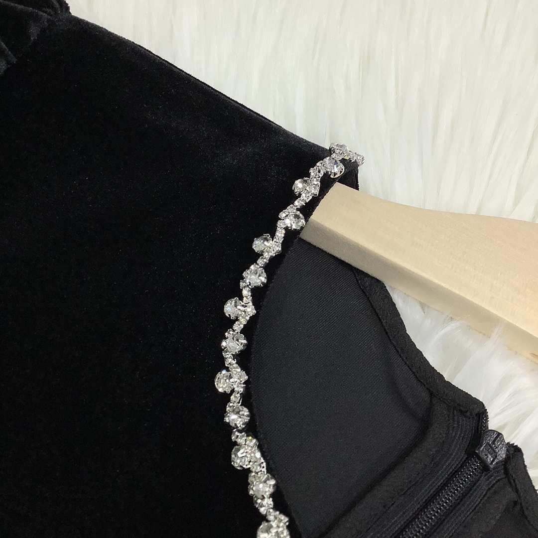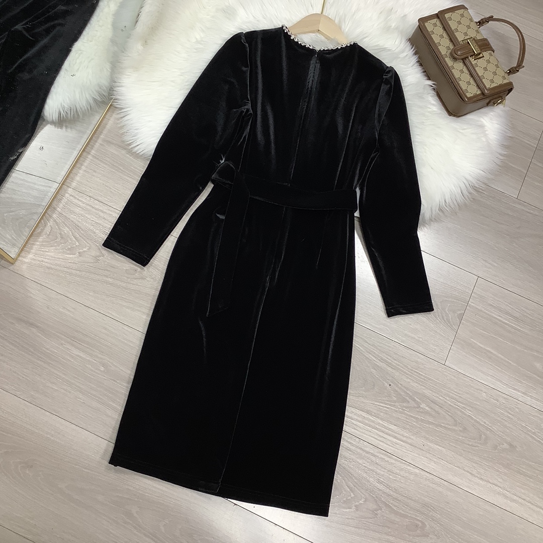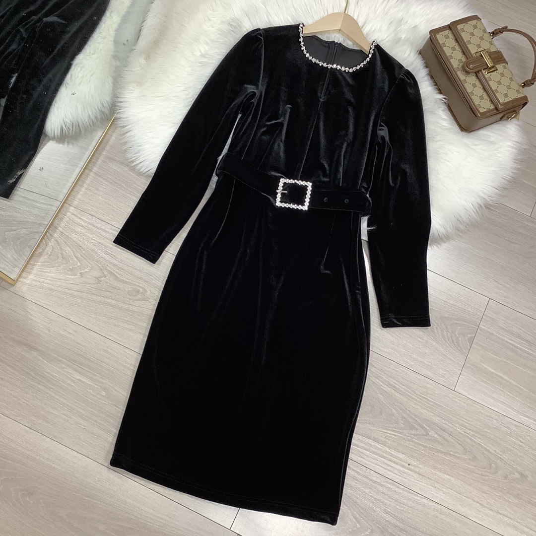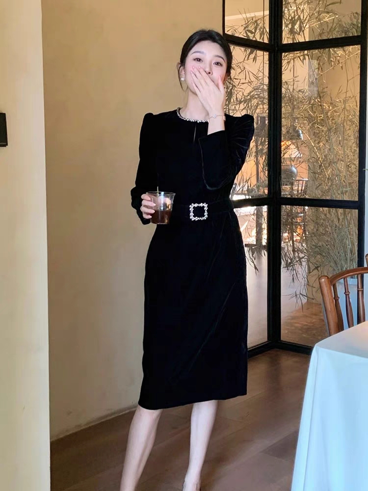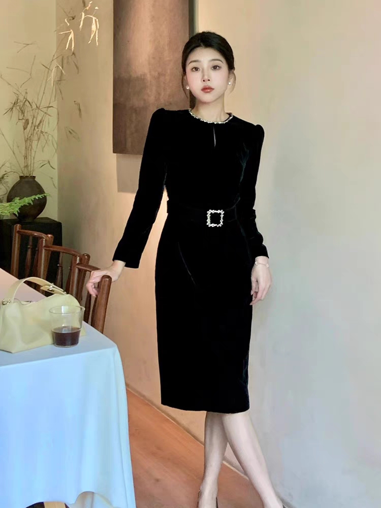 Elevate your wardrobe with this exquisite black velvet dress, featuring a rhinestone-adorned collar, long sleeves, and a flattering slim fit. Comes with a stylish belt.