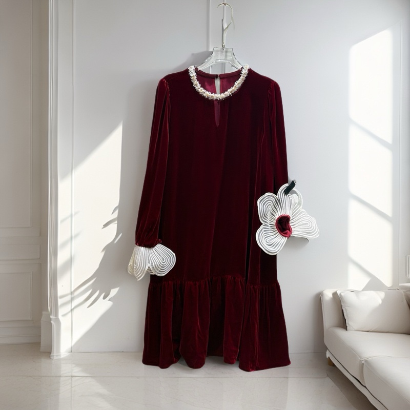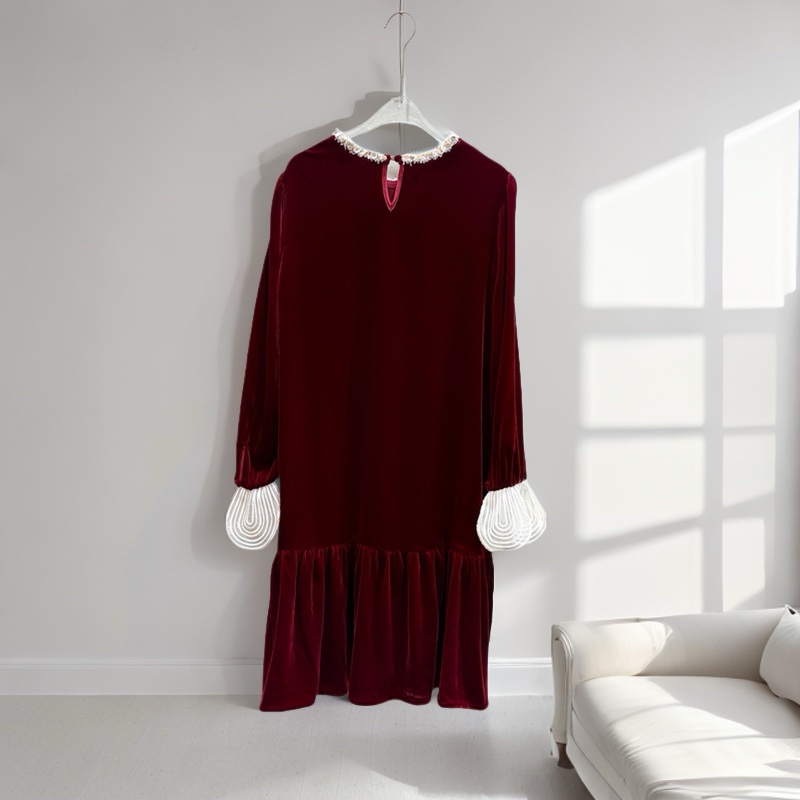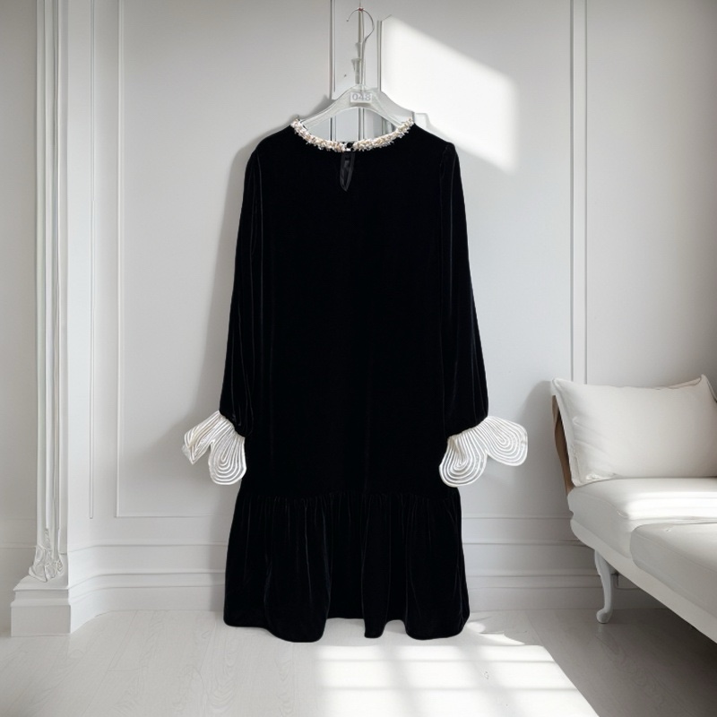 Elegant Velvet Dress with Pearl Neckline and Embroidered Cuffs - Versatile Style