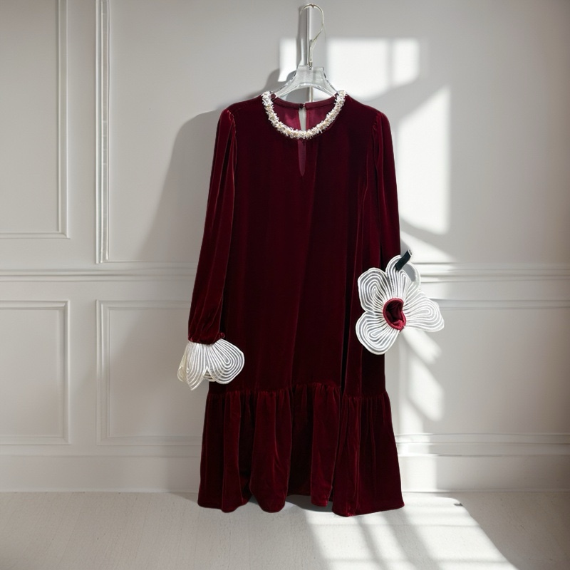 This chic velvet dress features a pearl-adorned neckline, delicate cuff embroidery, and a flattering ruffle hem. Perfect for any occasion.