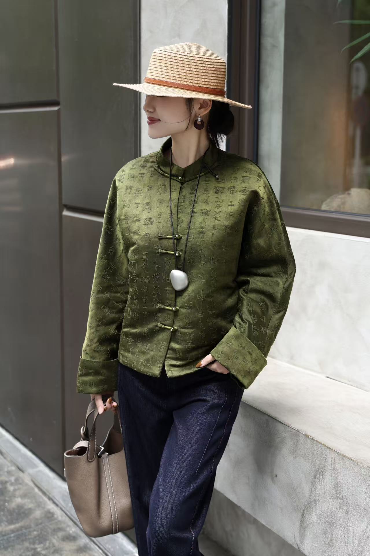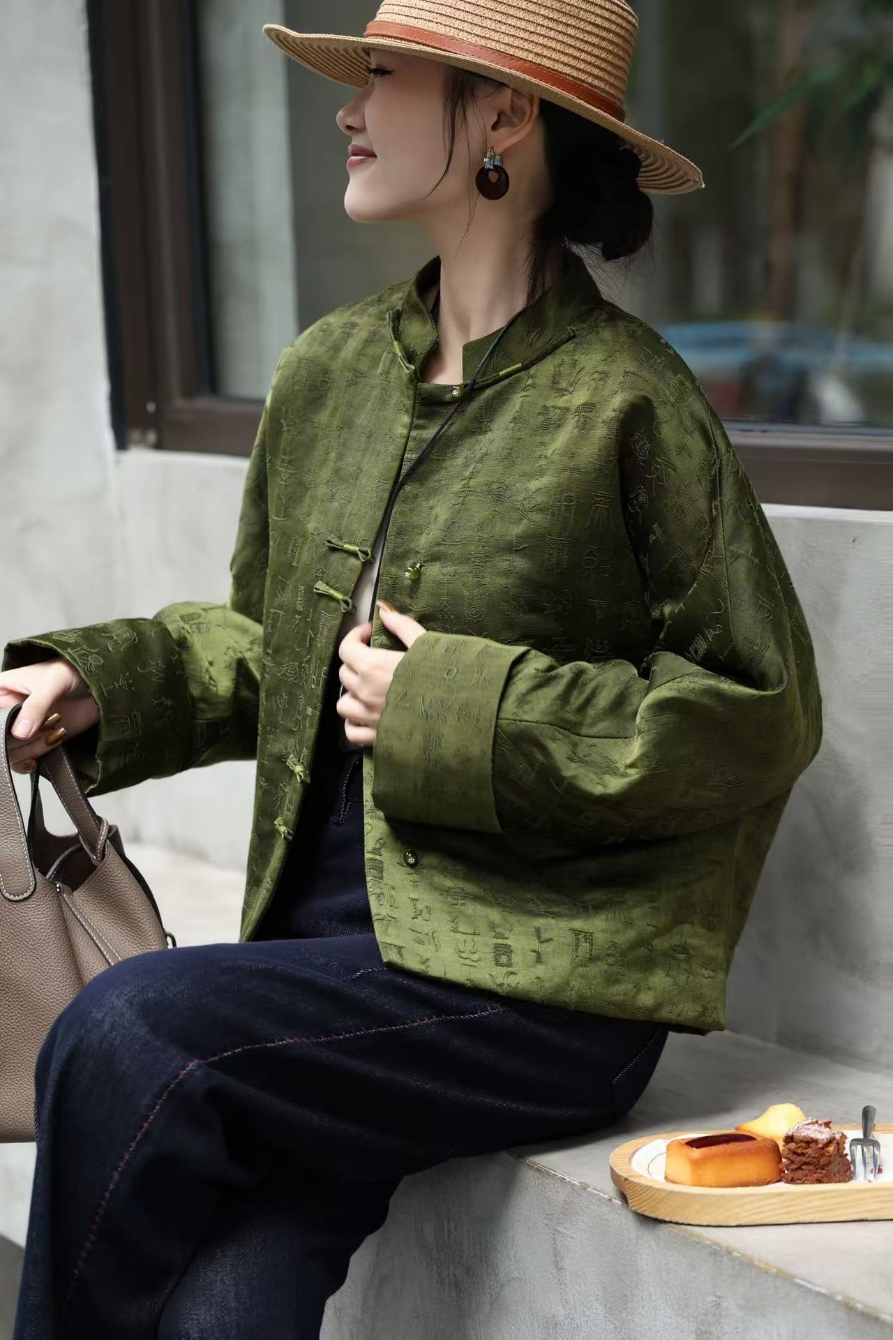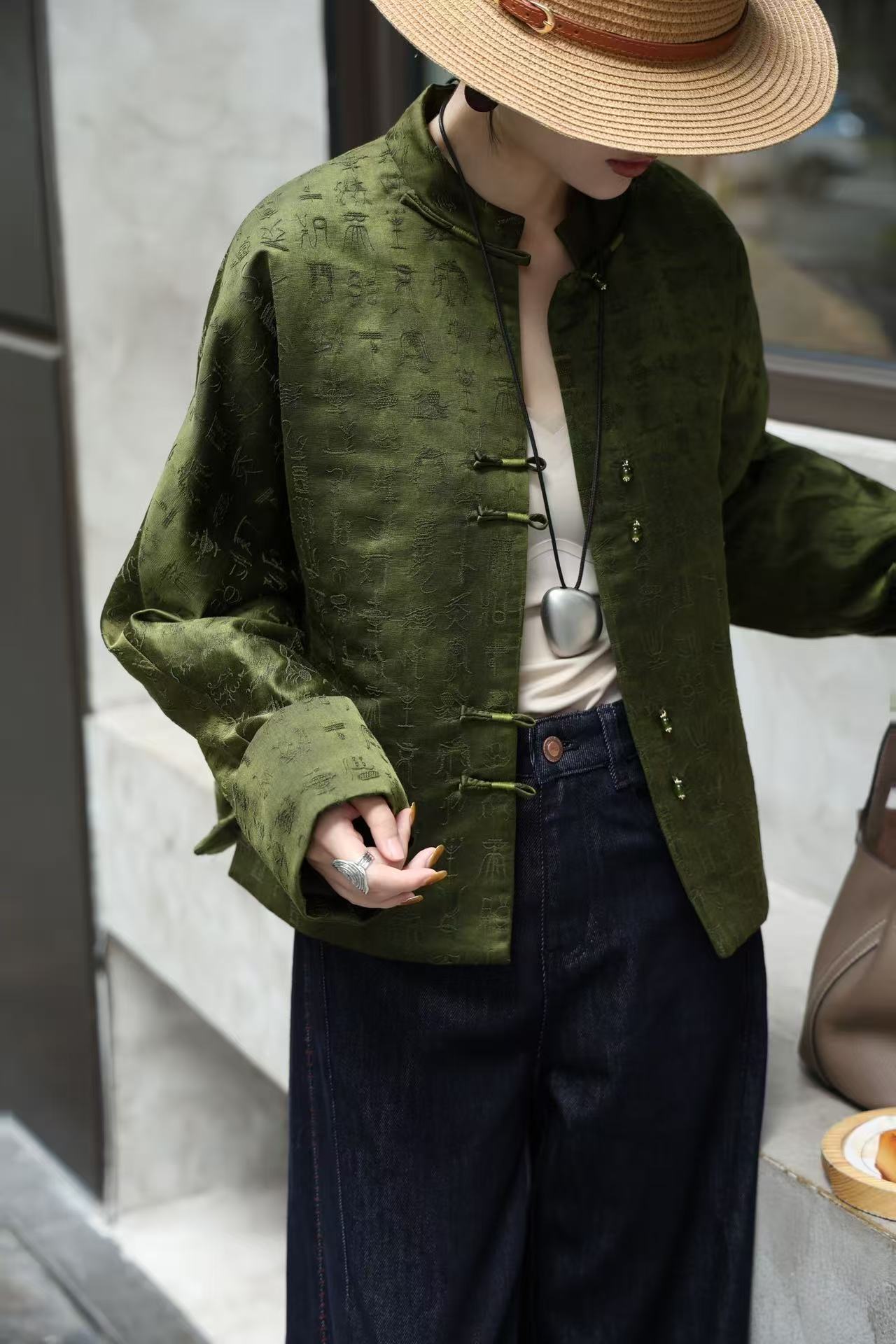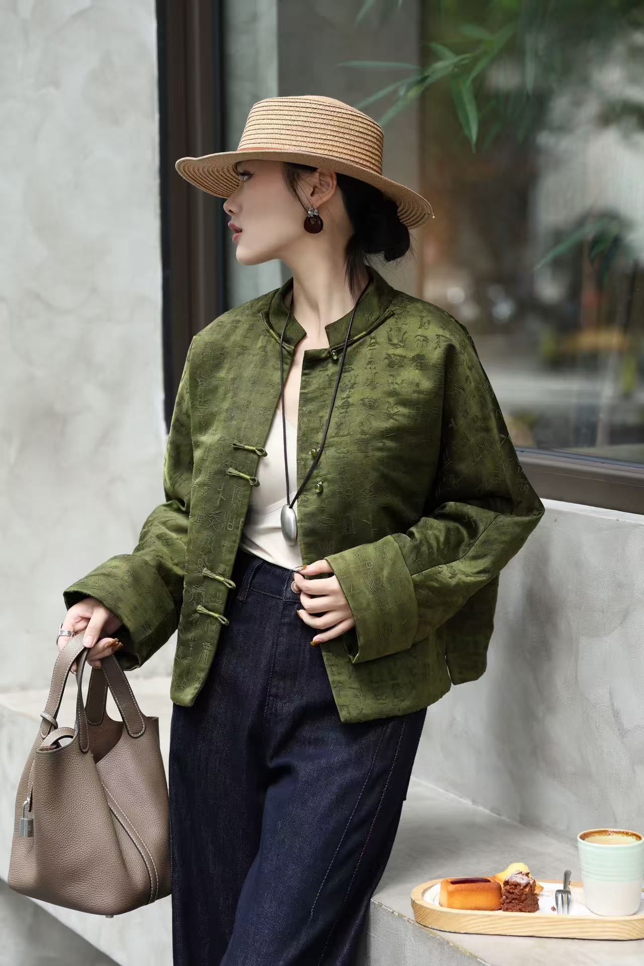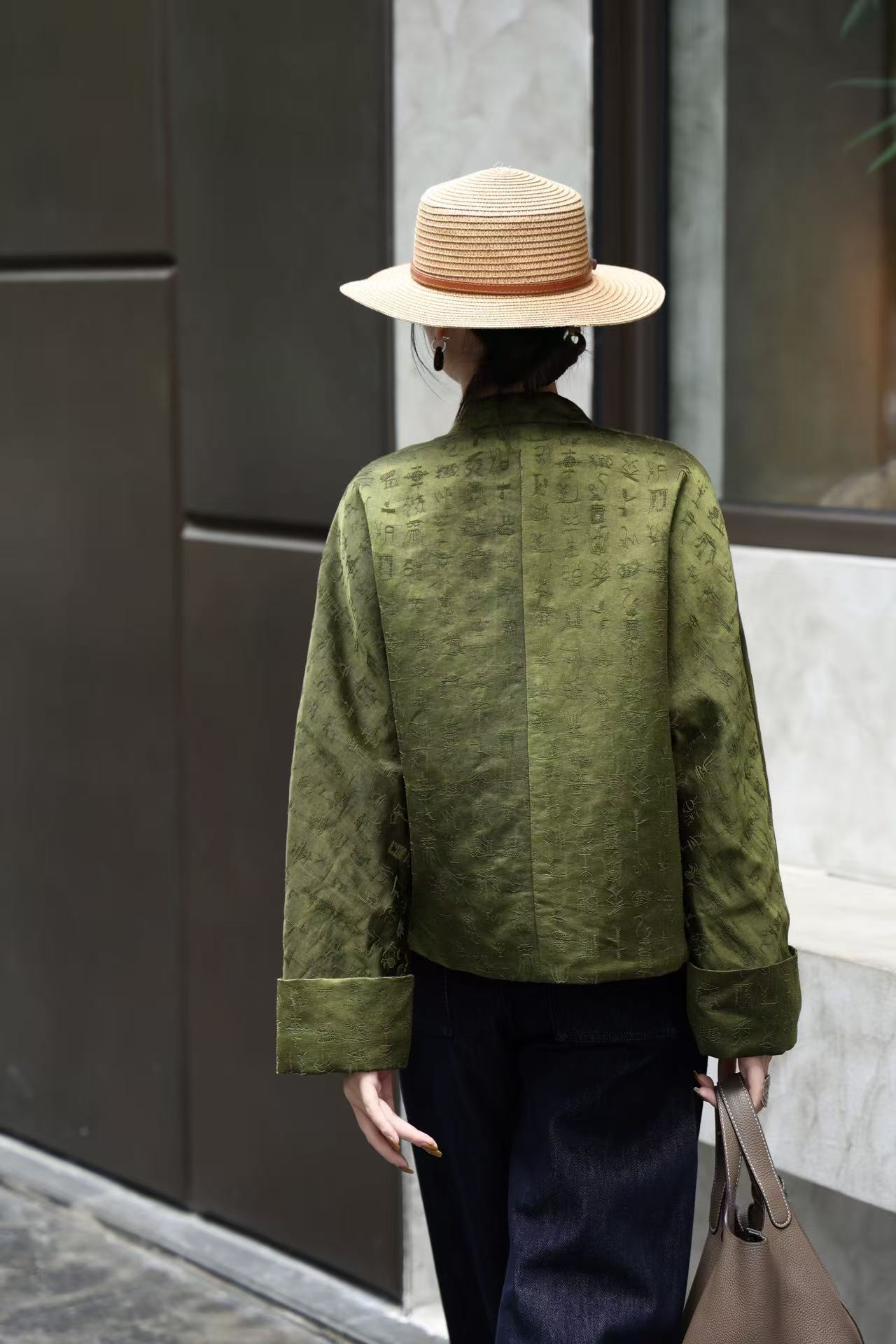 Tags: Chinese Style Jacket, Handmade Button Jacket, Jacquard Pattern Jacket, Military Green Jacket, Silk Blend Jacket, Stand Collar Jacket