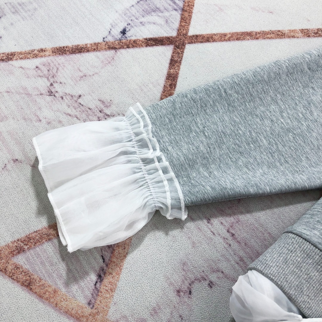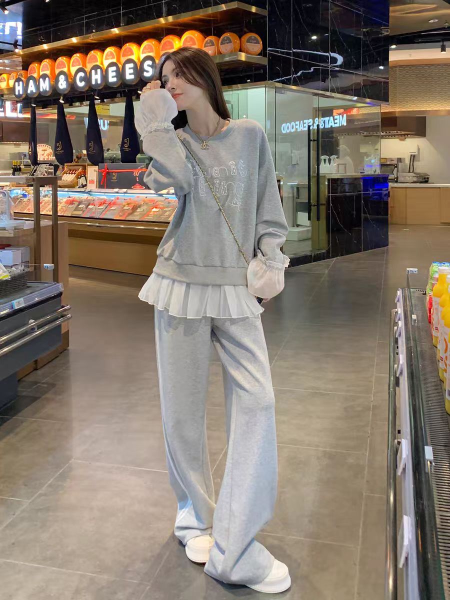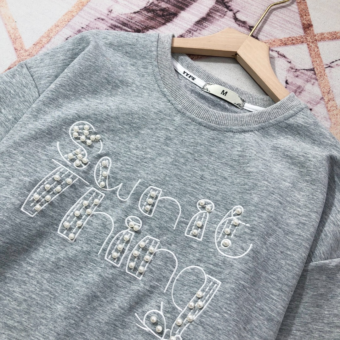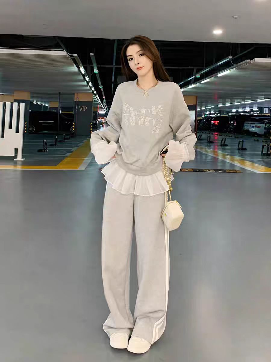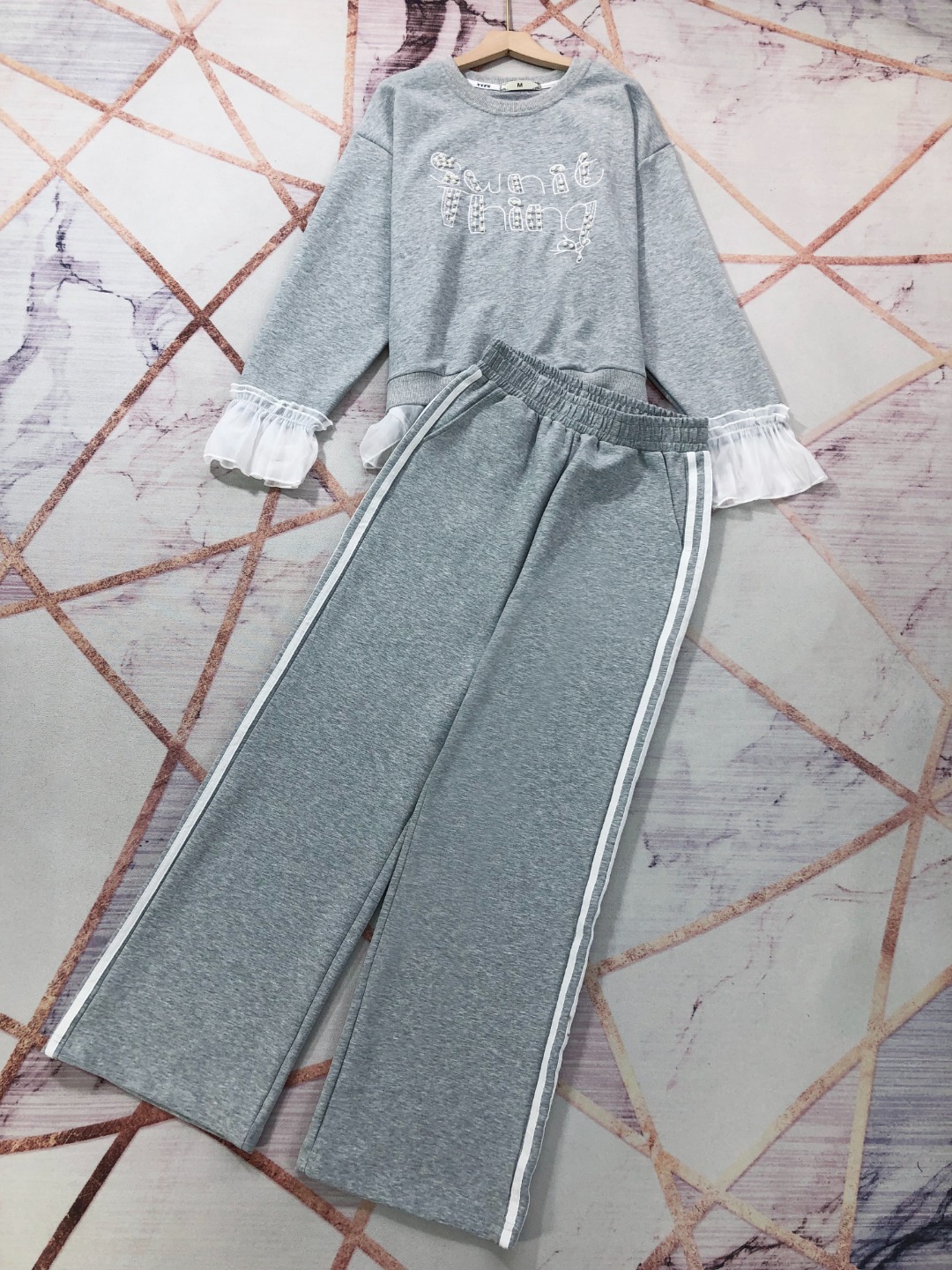 - Elegant Design: The outfit features an elegant sweatshirt with delicate beaded letter detailing on the front, adding a touch of sophistication.