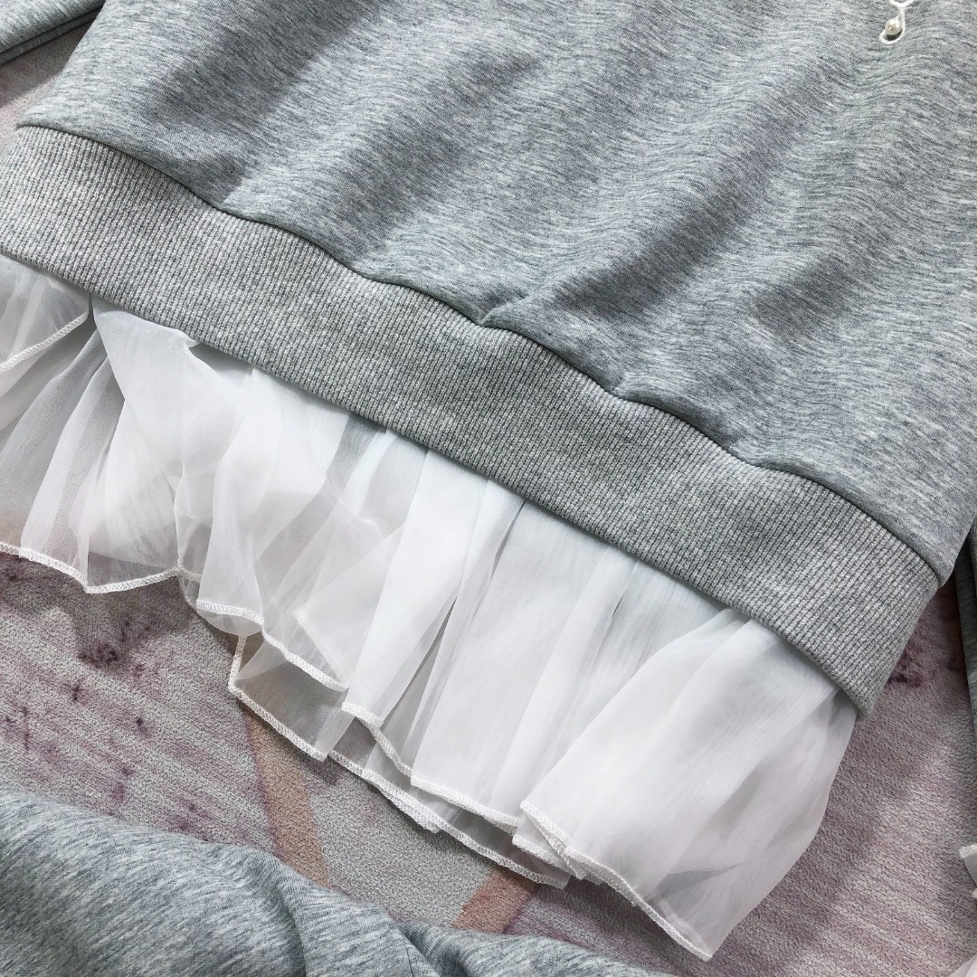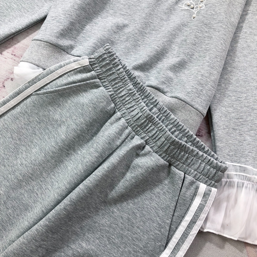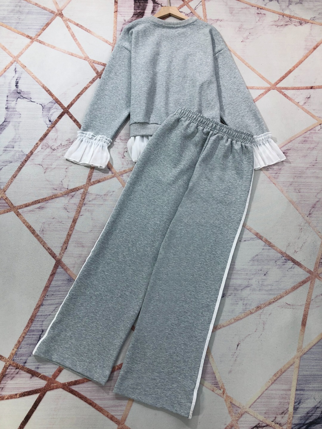 Elevate your style with this chic gray cotton blend set. Features a comfortable sweatshirt with beaded details and wide-leg pants for a modern, elegant look.