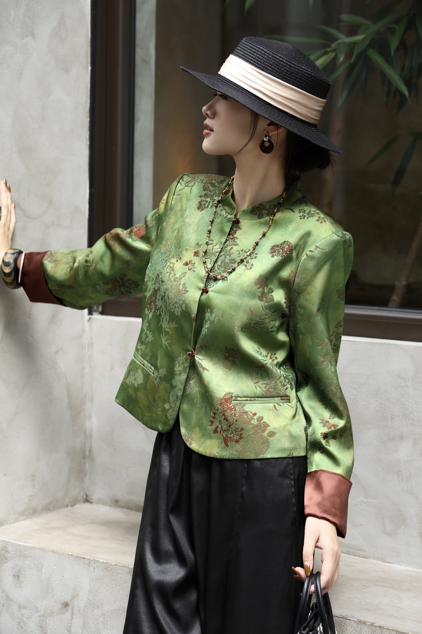 Elegant Women's Green Floral Brocade Jacket, Mandarin Collar, New Chinese Style