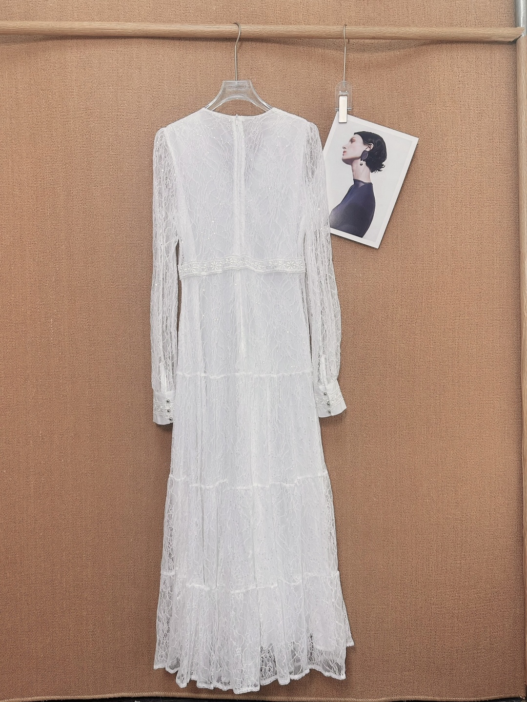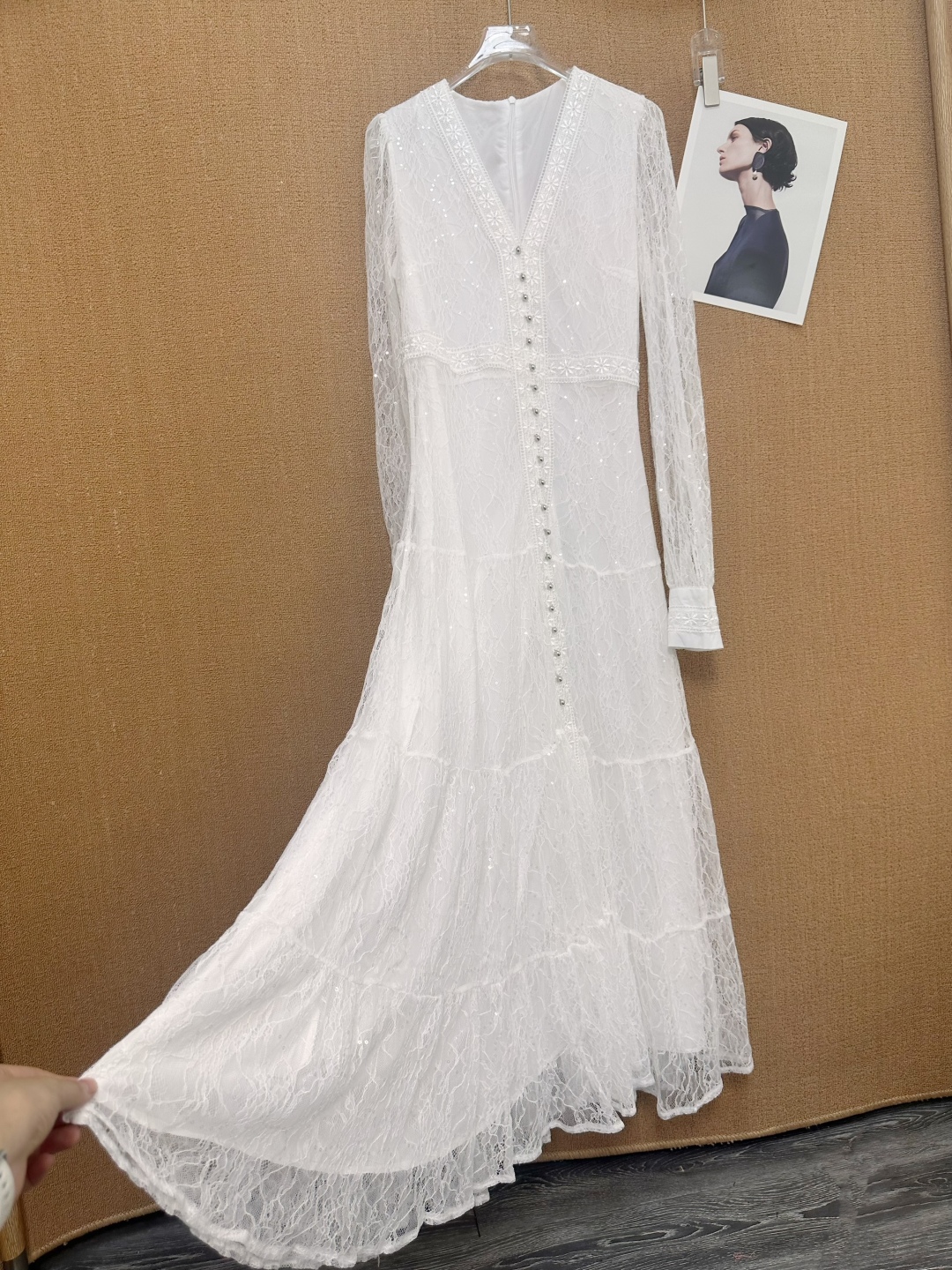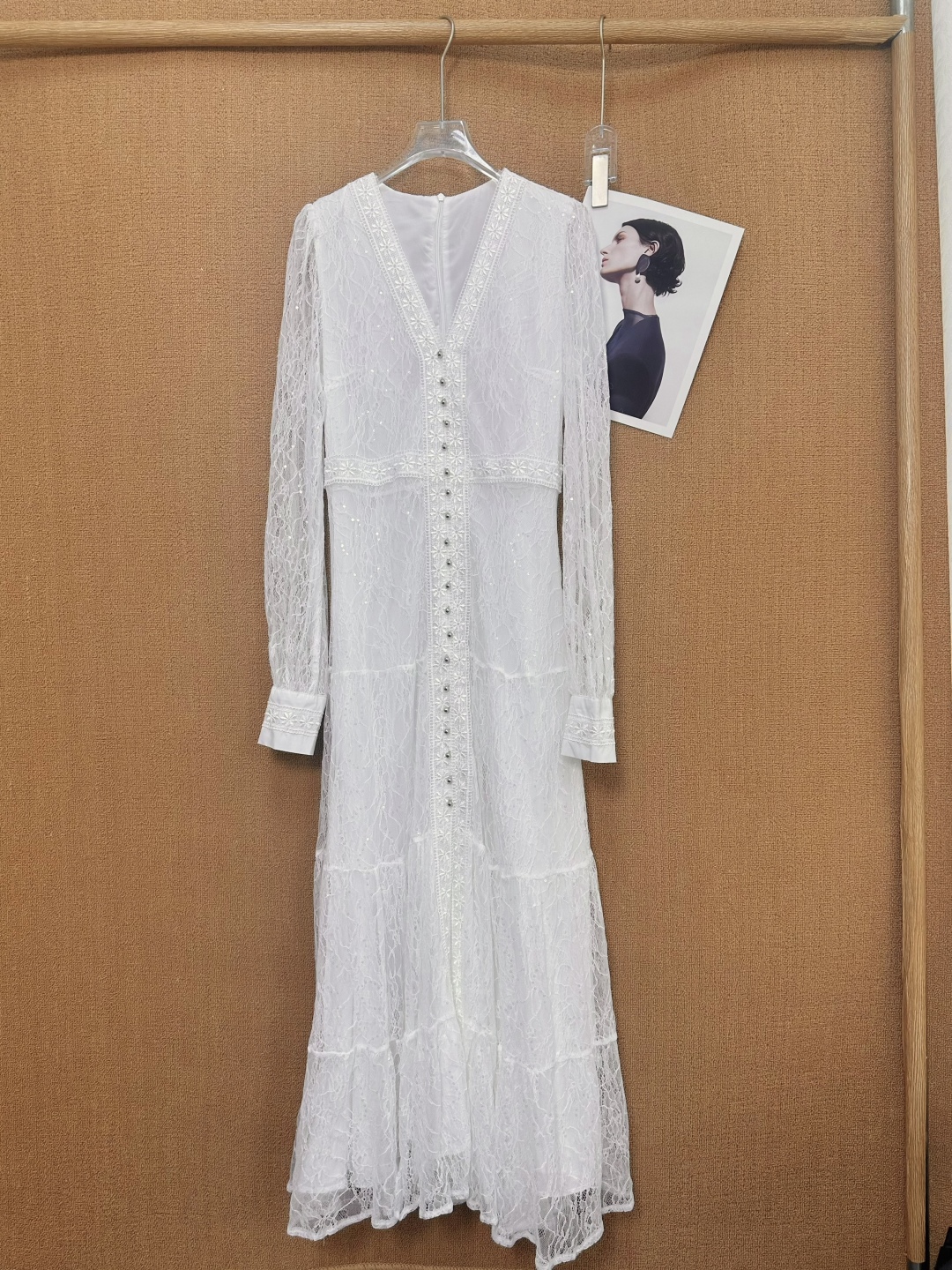 This elegant lace maxi dress features a flattering V-neck, long sleeves, and delicate details. Perfect for weddings, parties, and special events.
