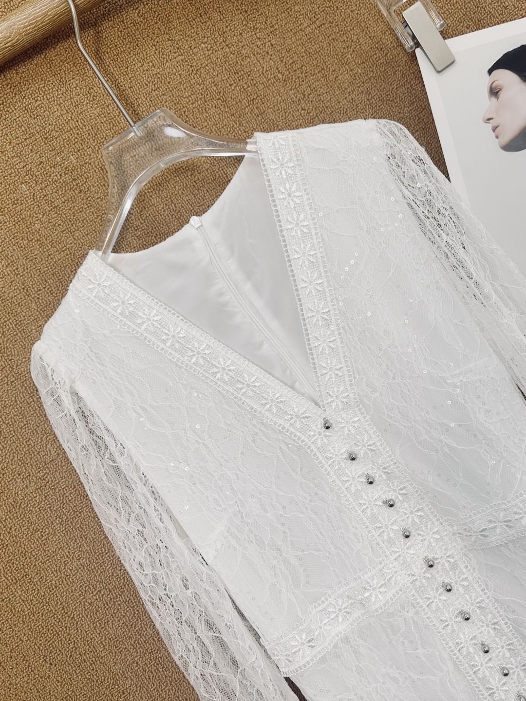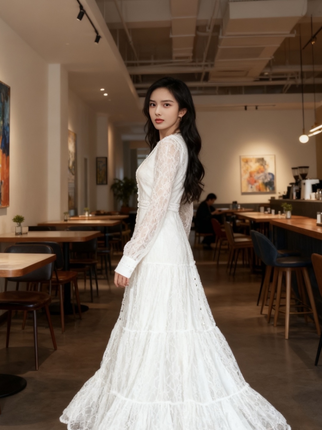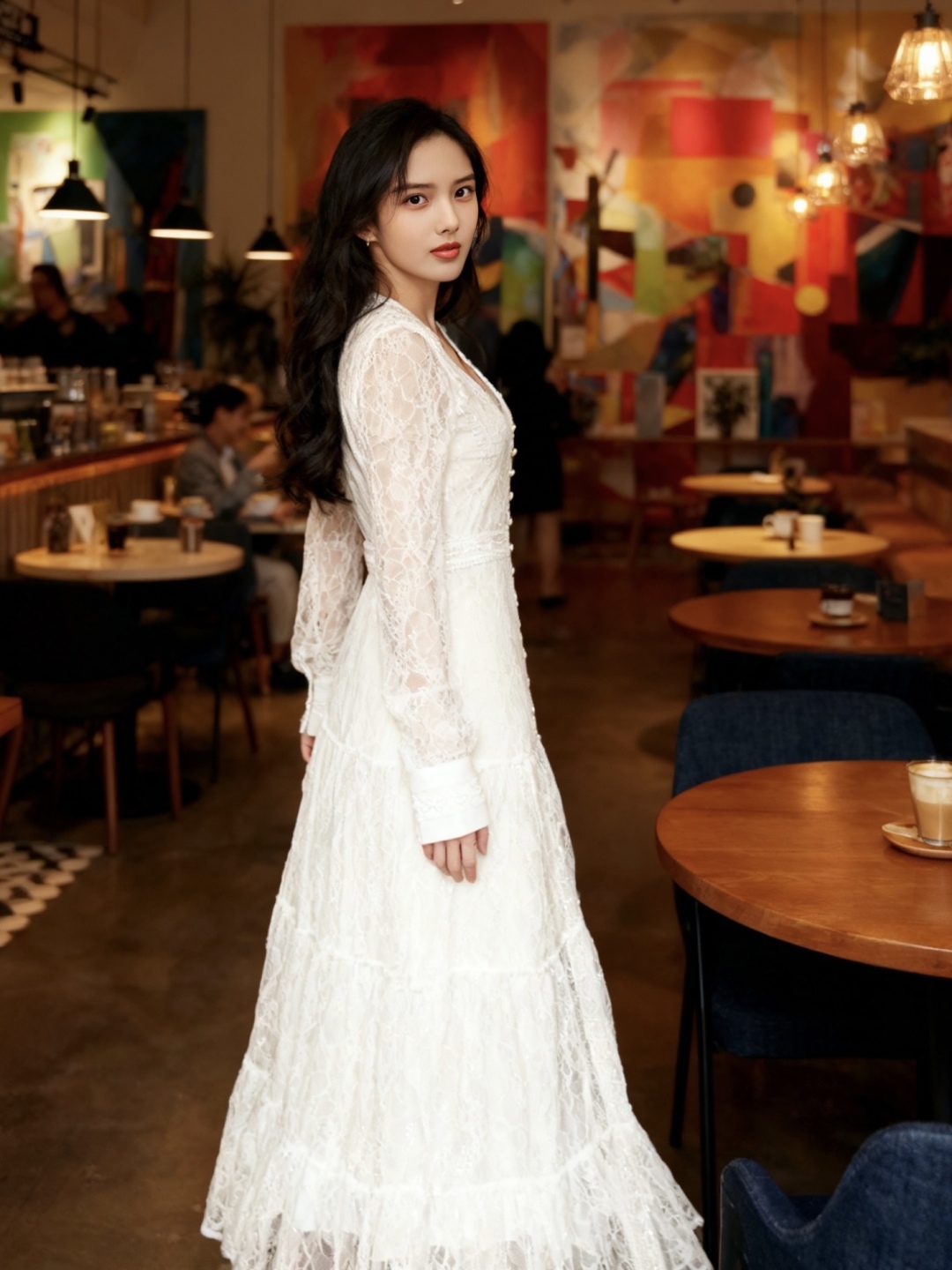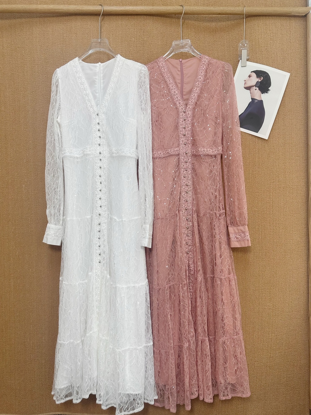This elegant lace maxi dress features a flattering V-neck, long sleeves, and delicate details. Perfect for weddings, parties, and special events.