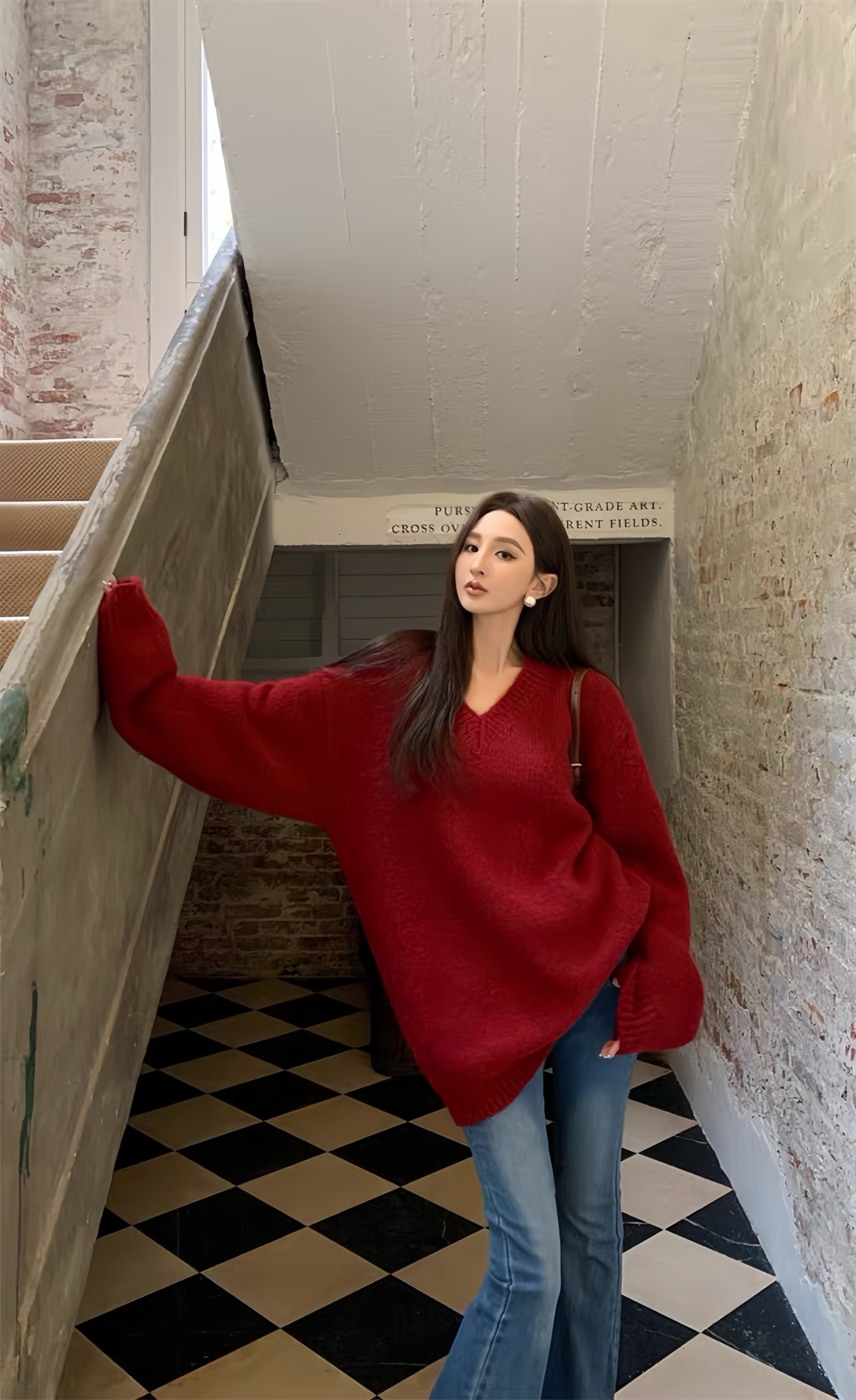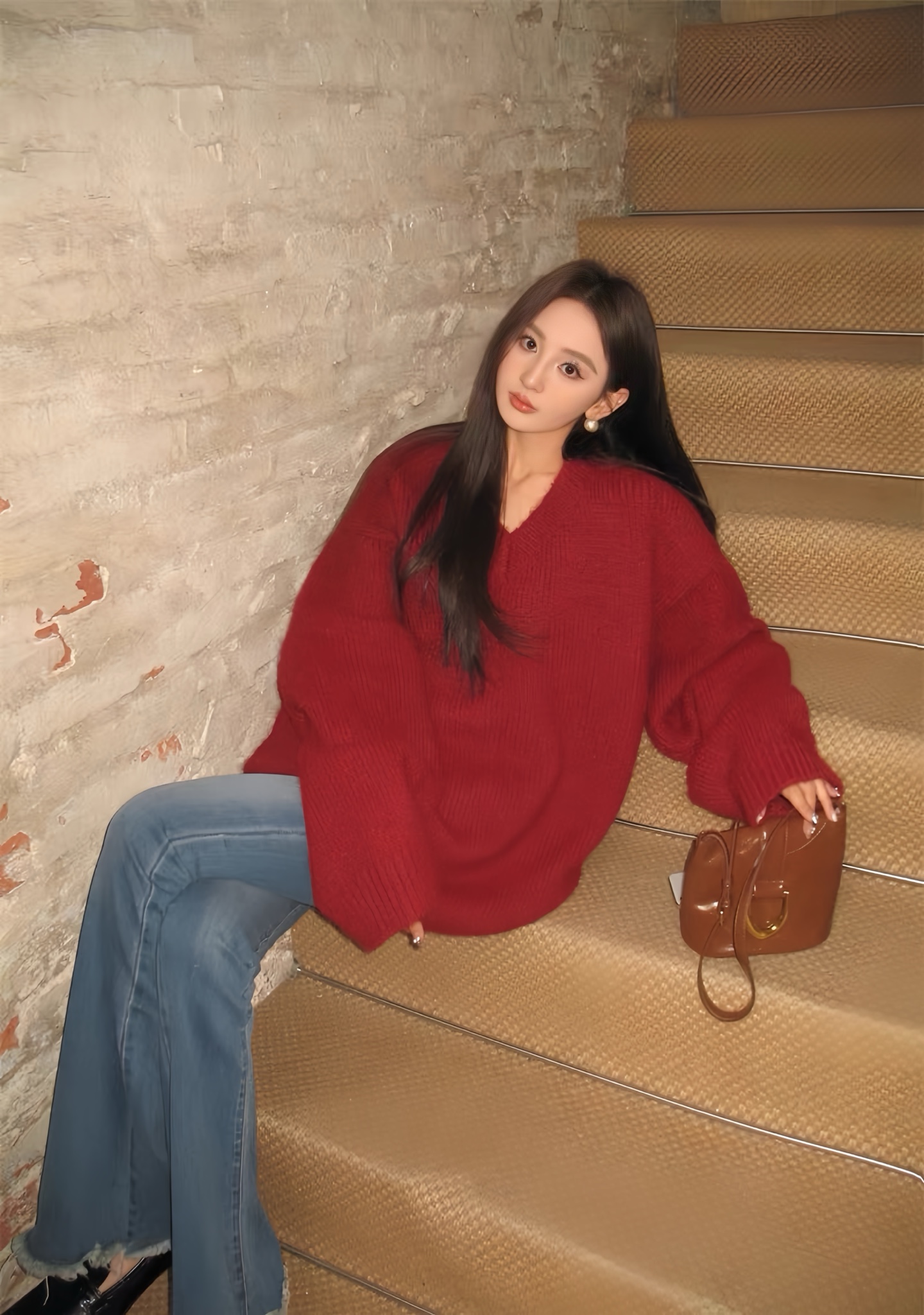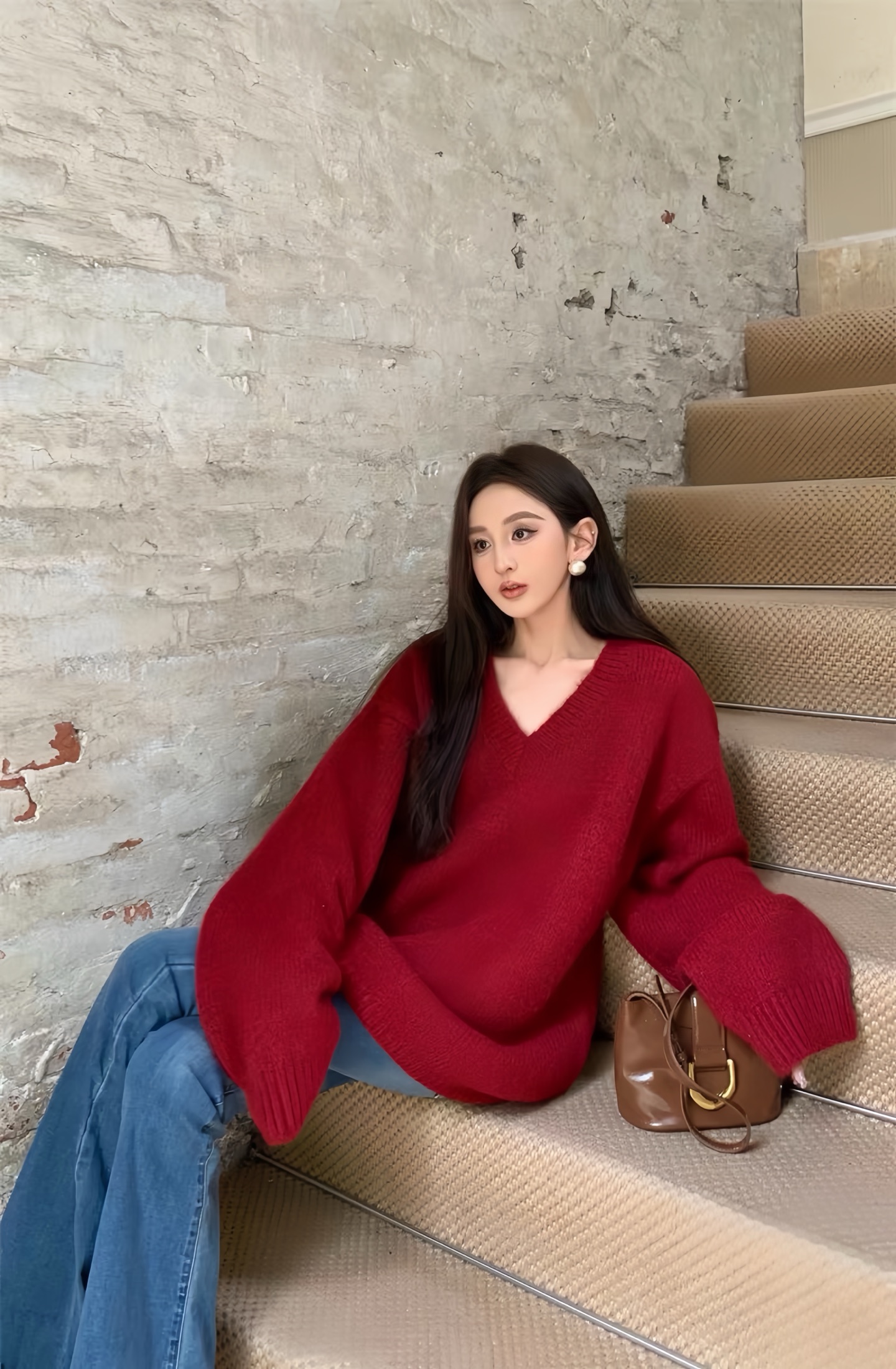 This V-neck lantern sleeve sweater is a blend of comfort and elegance, perfect for adding a touch of sophistication to your wardrobe.