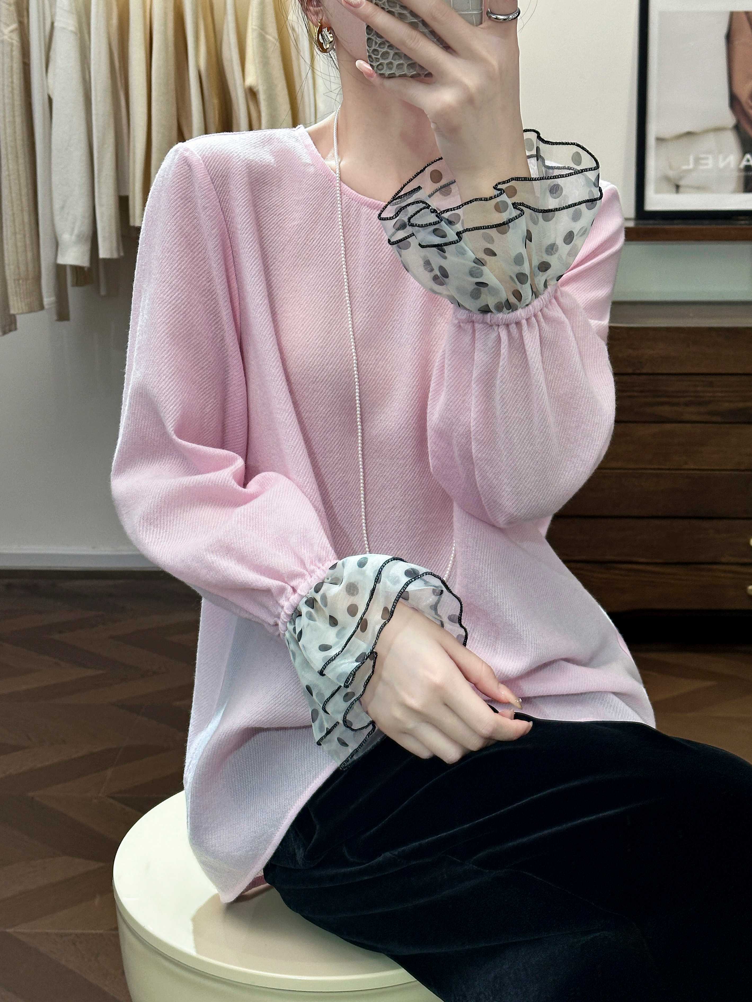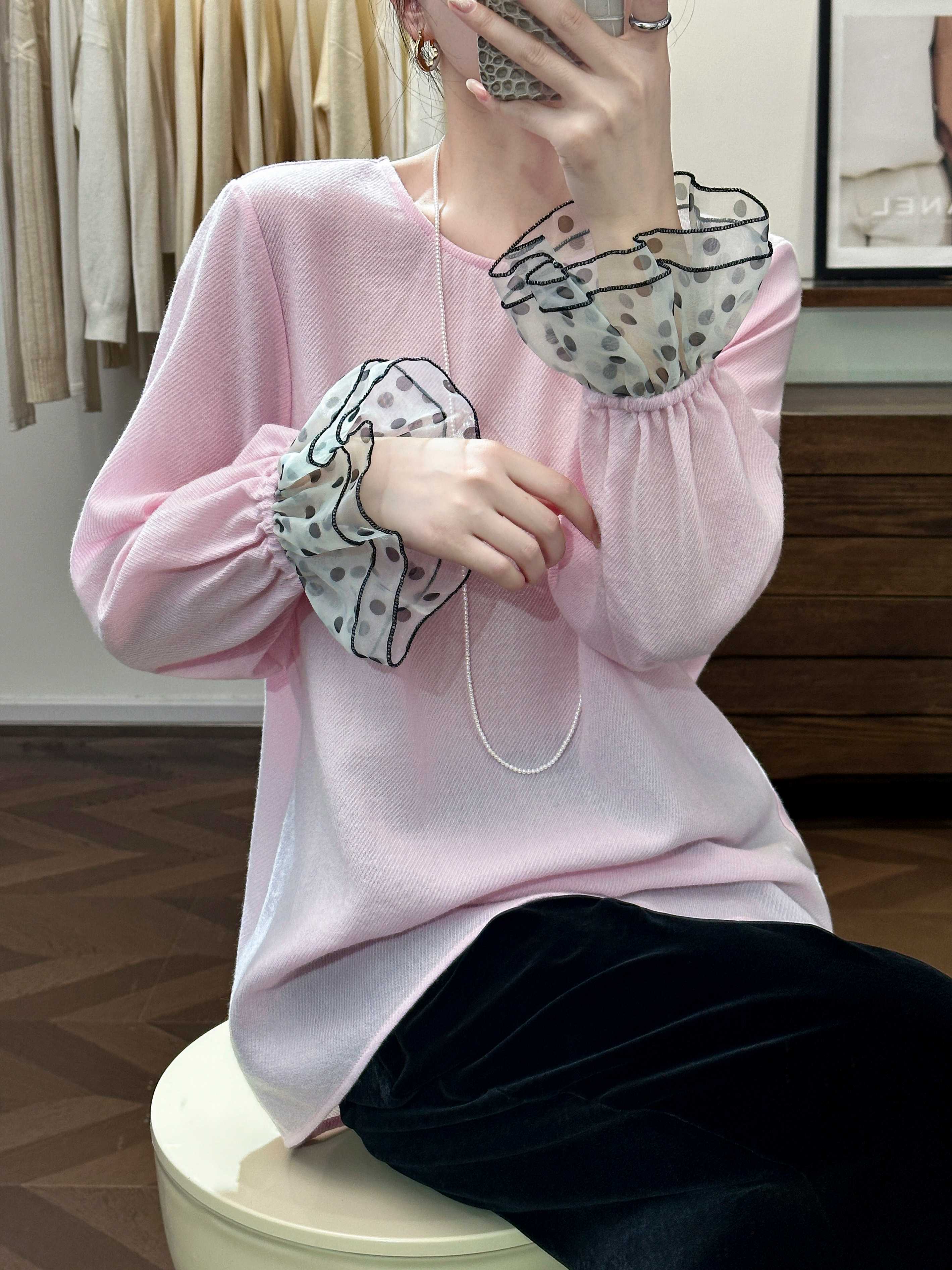 Elegant Women's Wool Blend Top with Polka Dot Sleeves - Chic and Comfy