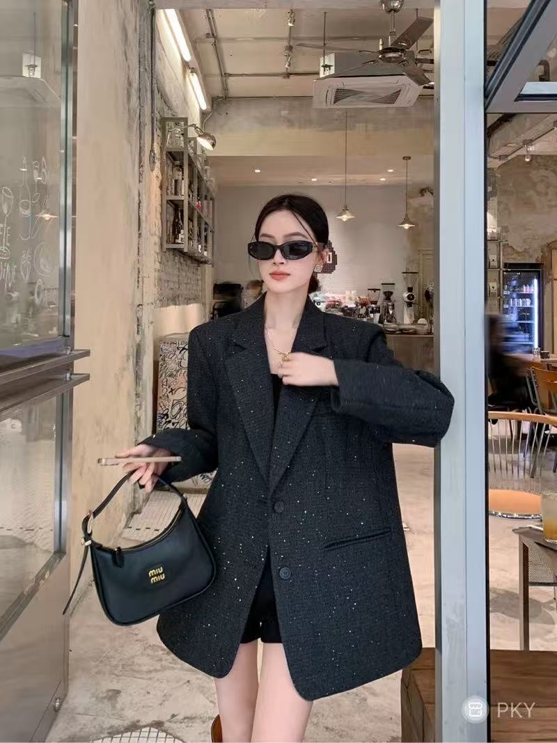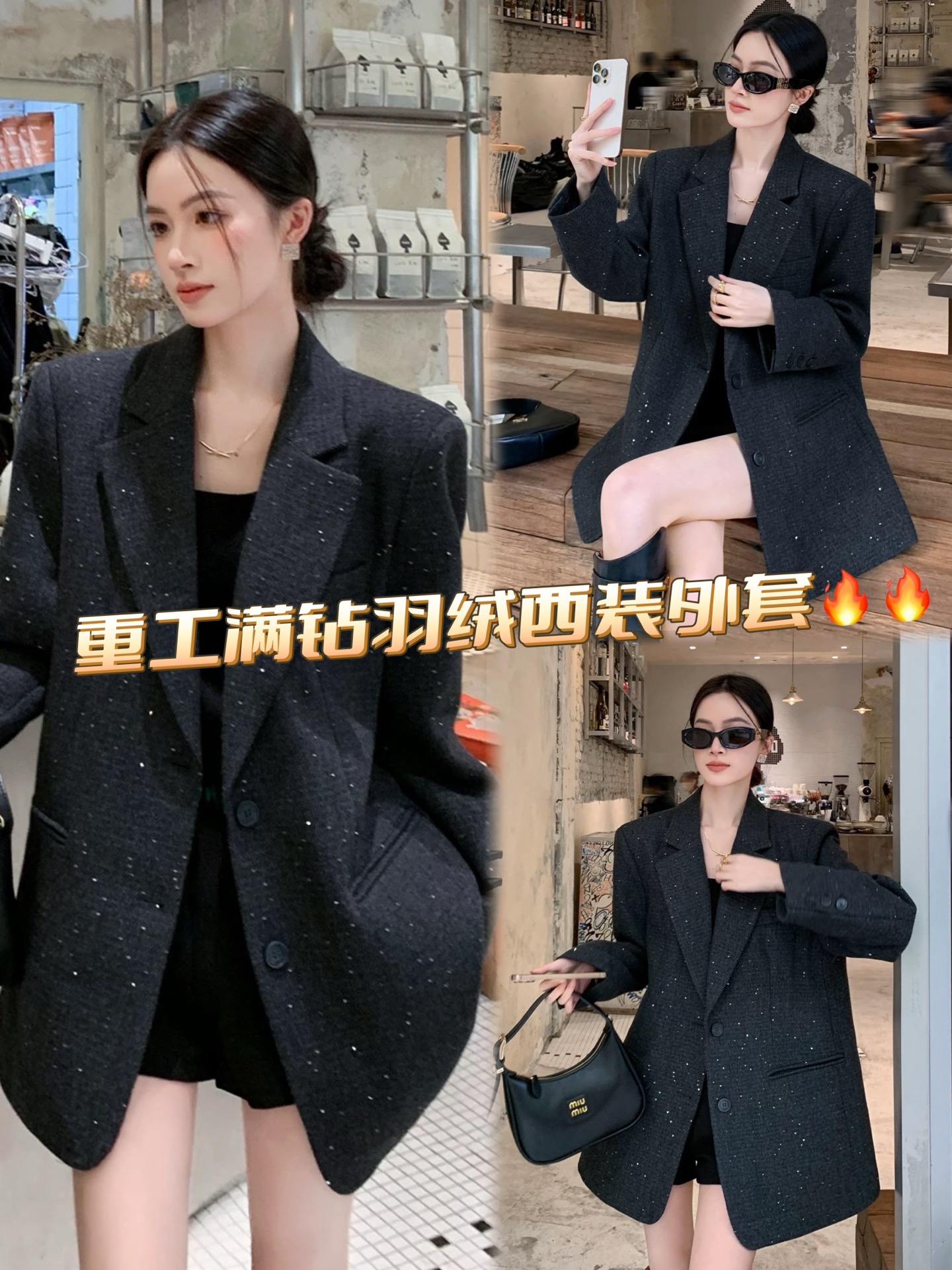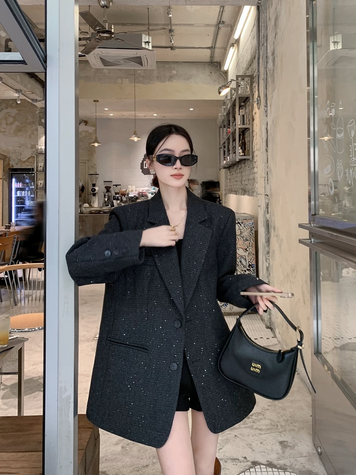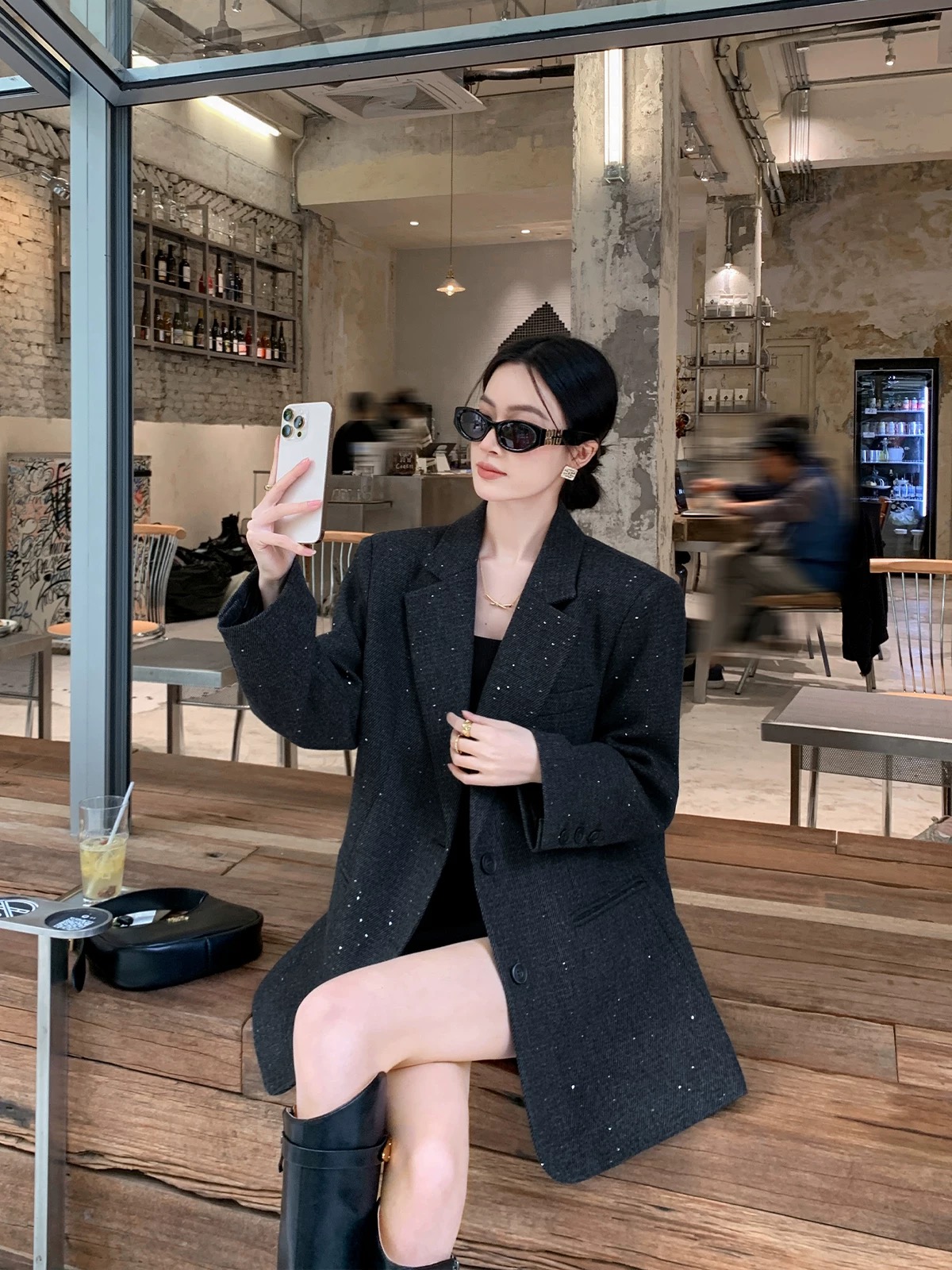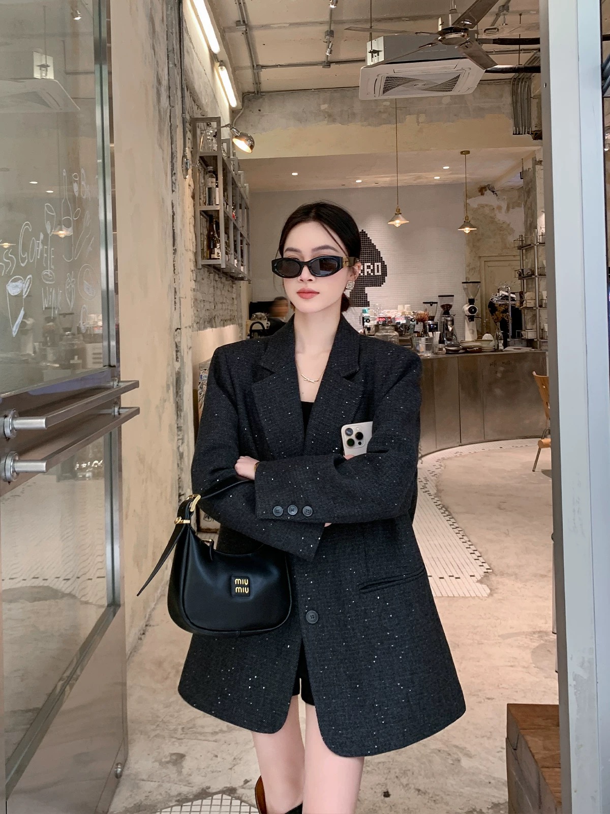 Elevate your style with this sophisticated glitter tweed blazer, perfect for adding a touch of sparkle to your look.