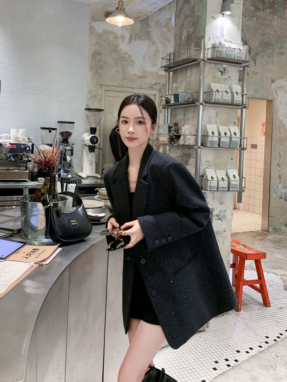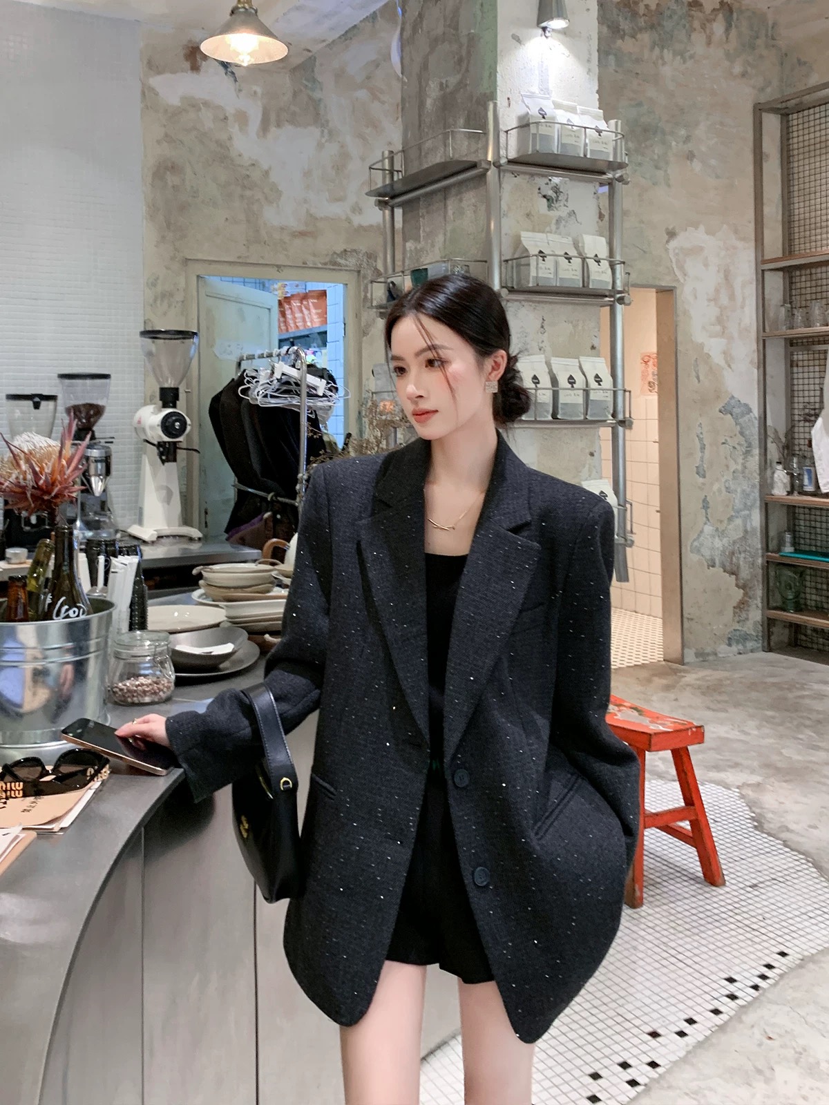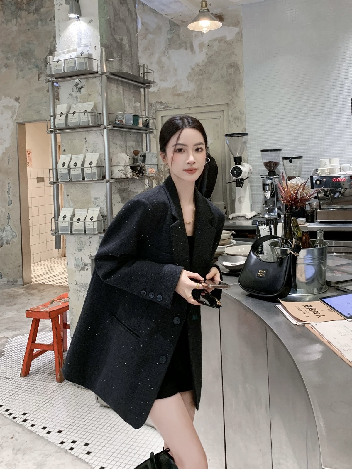 Elevate your style with this chic tweed blazer. Featuring a flattering H-line cut and shimmering silver glitter, it’s perfect for a sophisticated look.