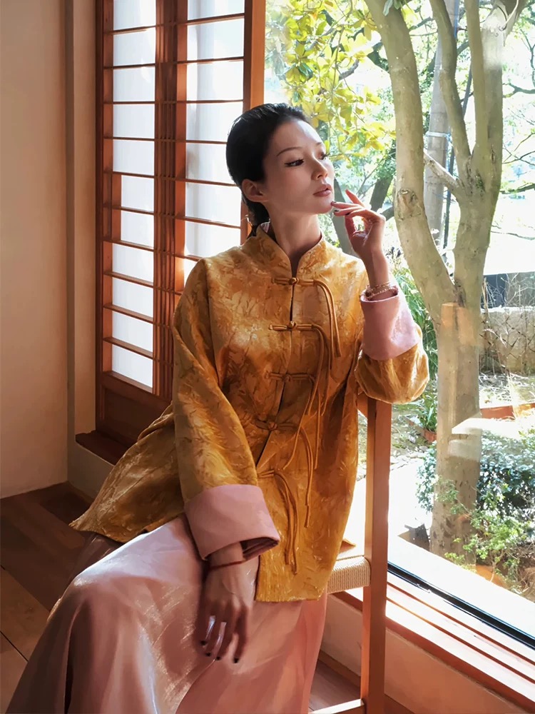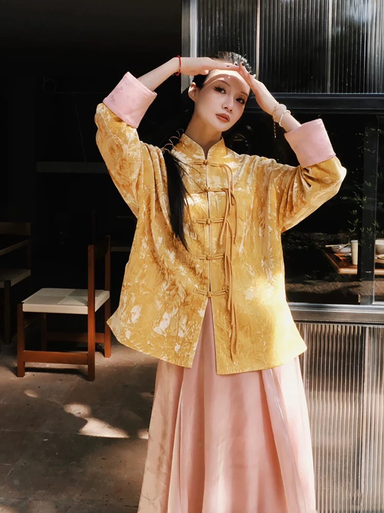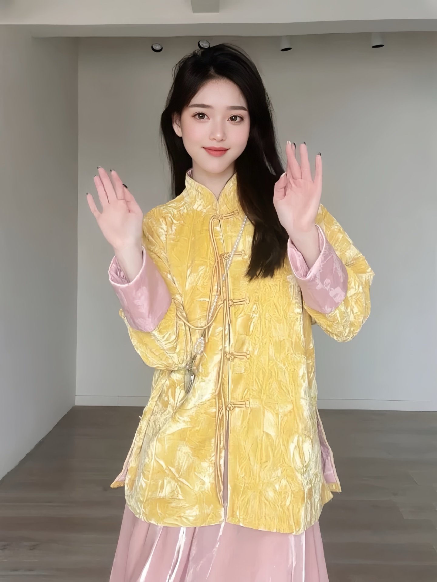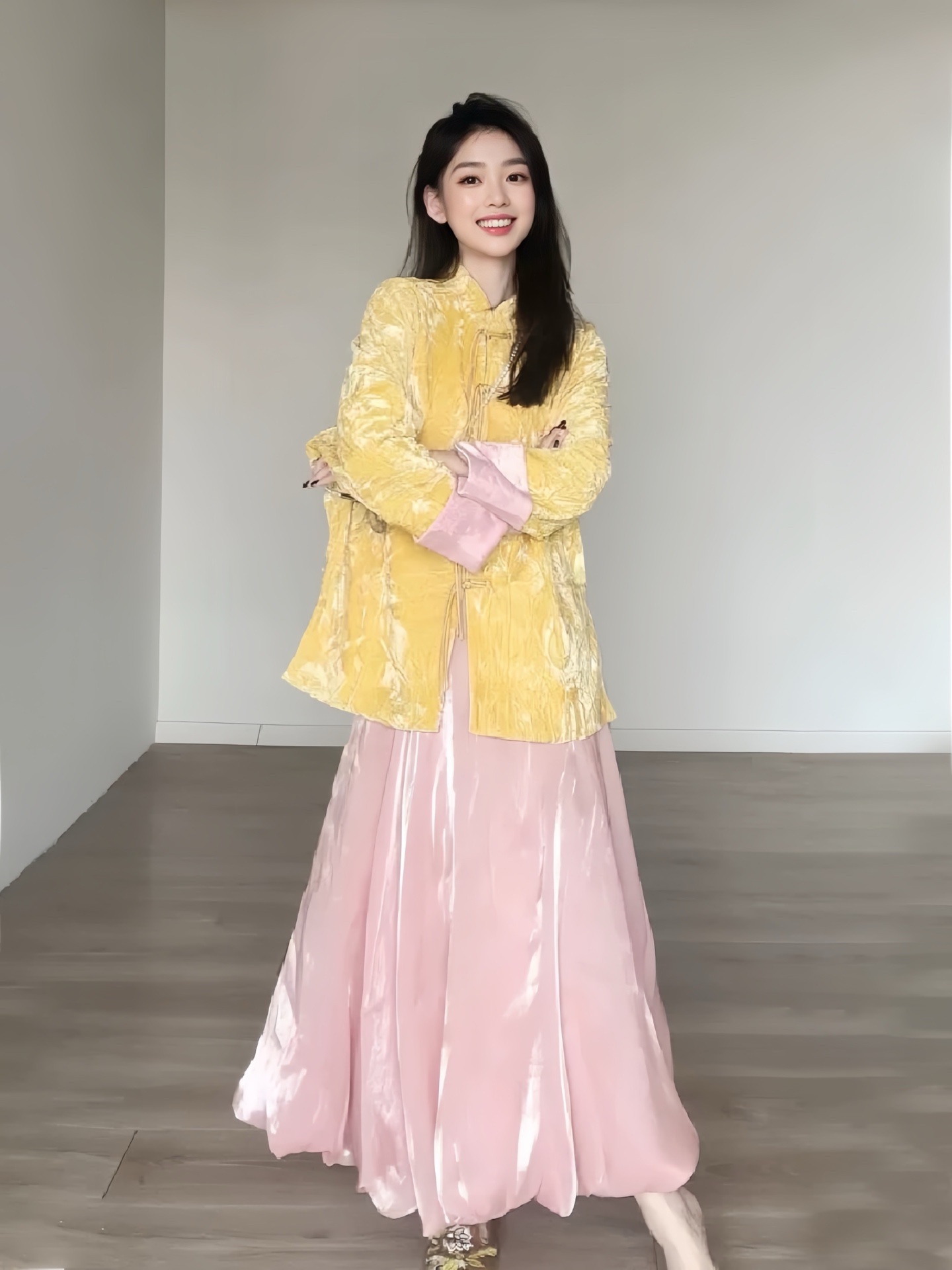 Embrace timeless elegance with this yellow velvet jacket featuring classic Chinese design and a soft pink skirt. Perfect for a touch of rich sophistication.