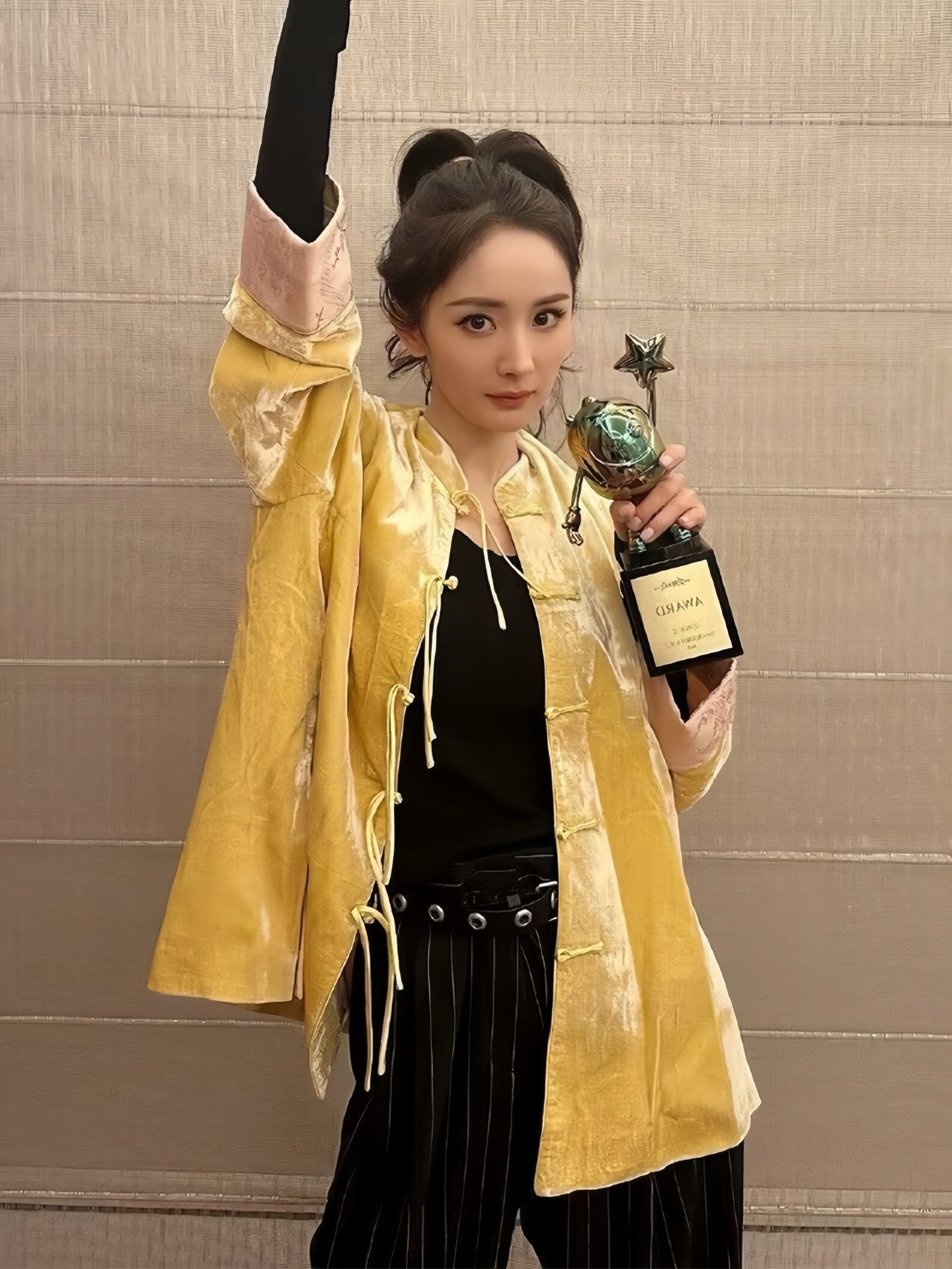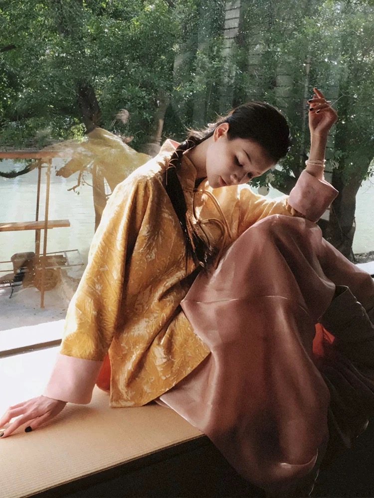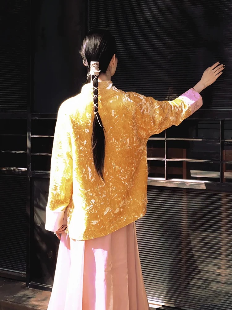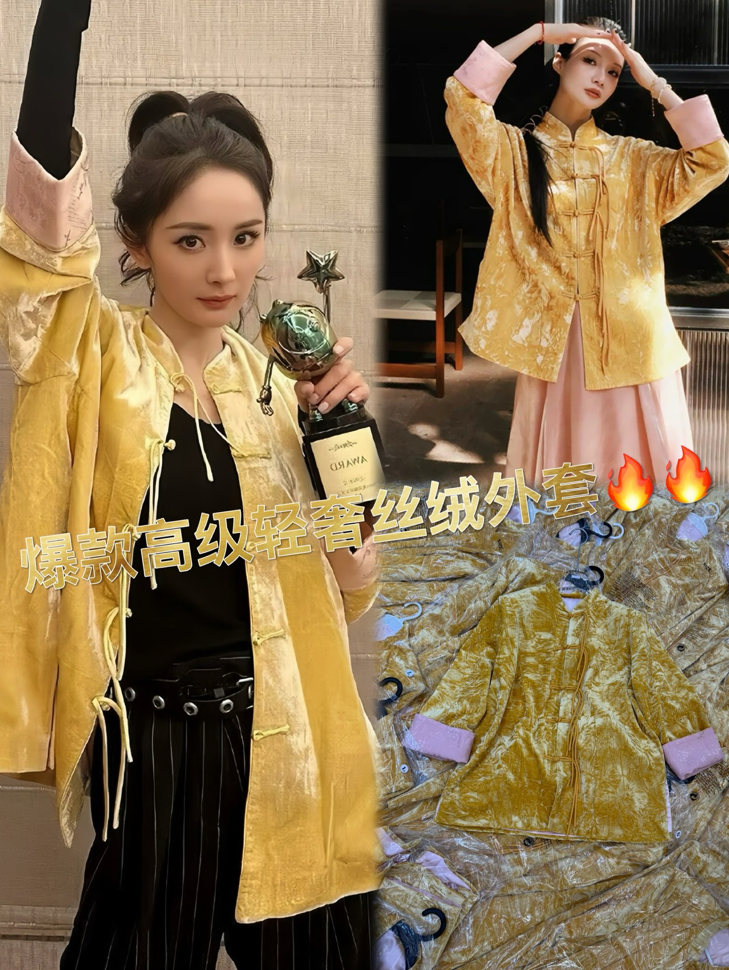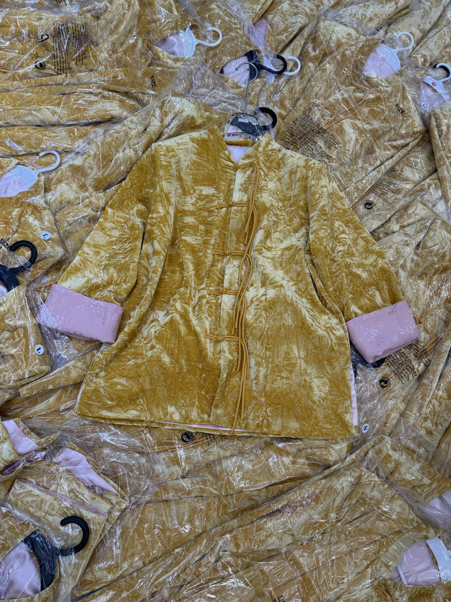 Embrace timeless elegance with this yellow velvet jacket featuring classic Chinese design and a soft pink skirt. Perfect for a touch of rich sophistication.