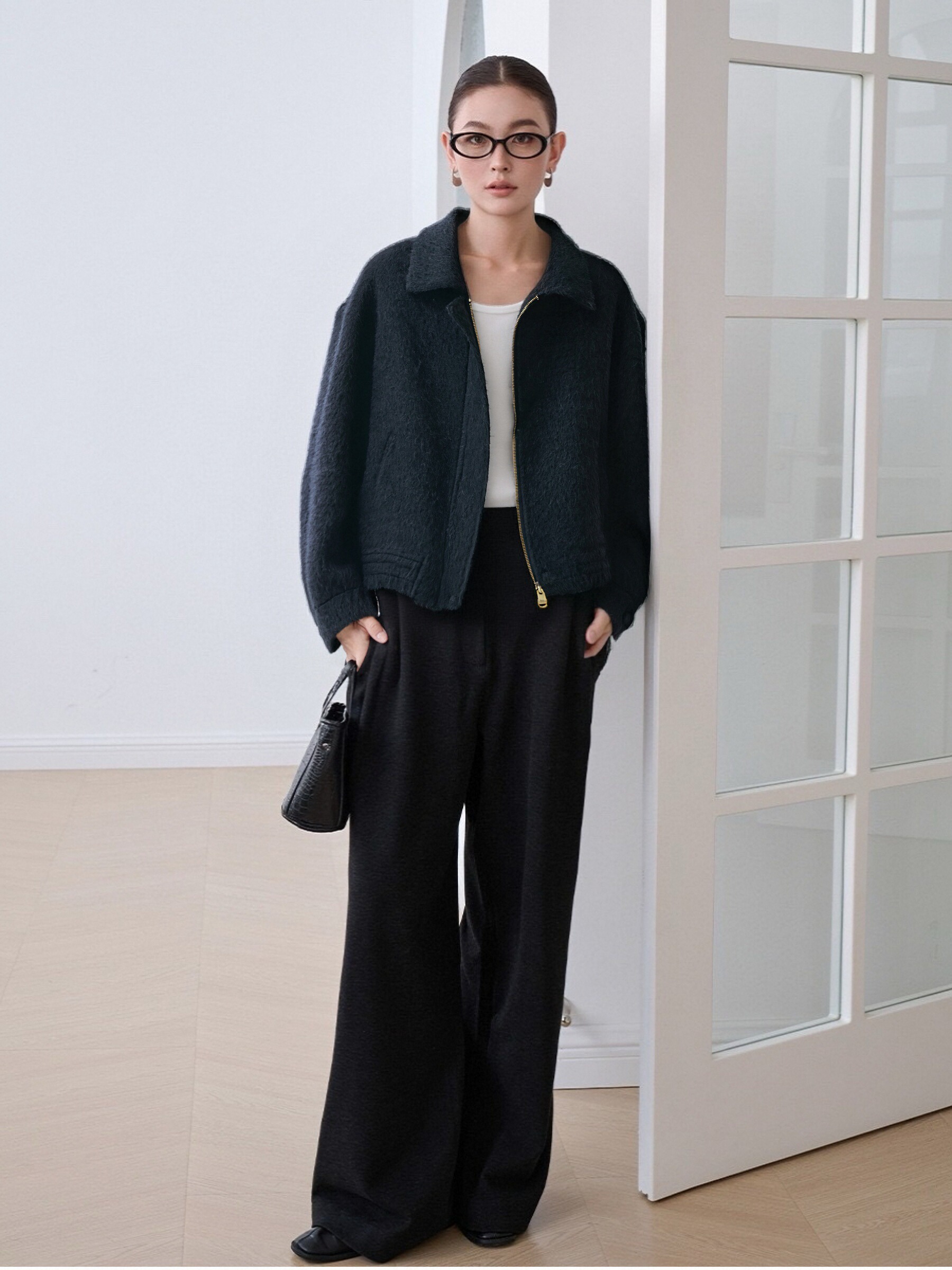 Elegant Wool-Blend Cropped Jacket with Zipper Closure and Relaxed Fit