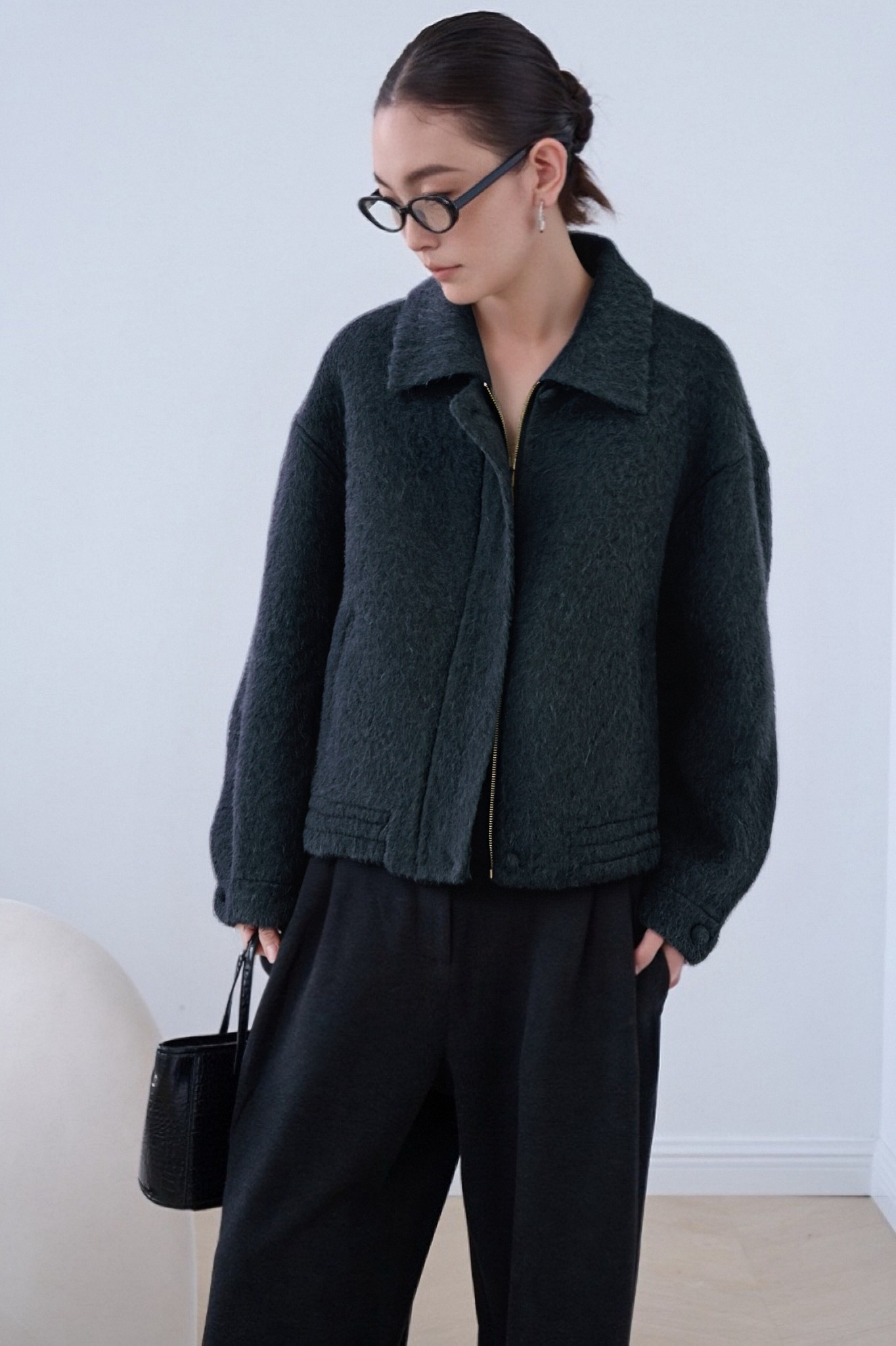 Elevate your style with this chic, cropped wool-blend jacket. Features a front zipper, relaxed fit, and timeless elegance. Perfect for layering and creating a sophisticated look.