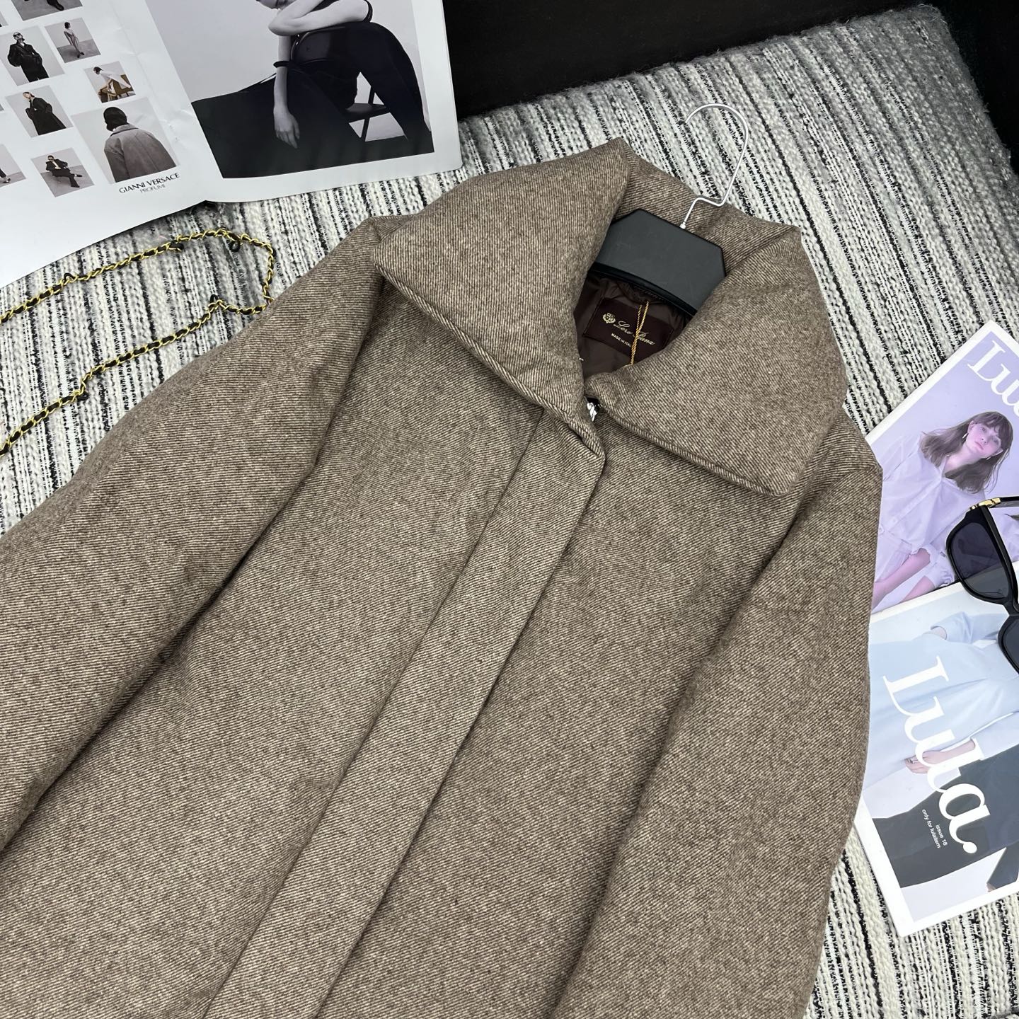 - Material: Wool blend outer shell, 90% white goose down filling