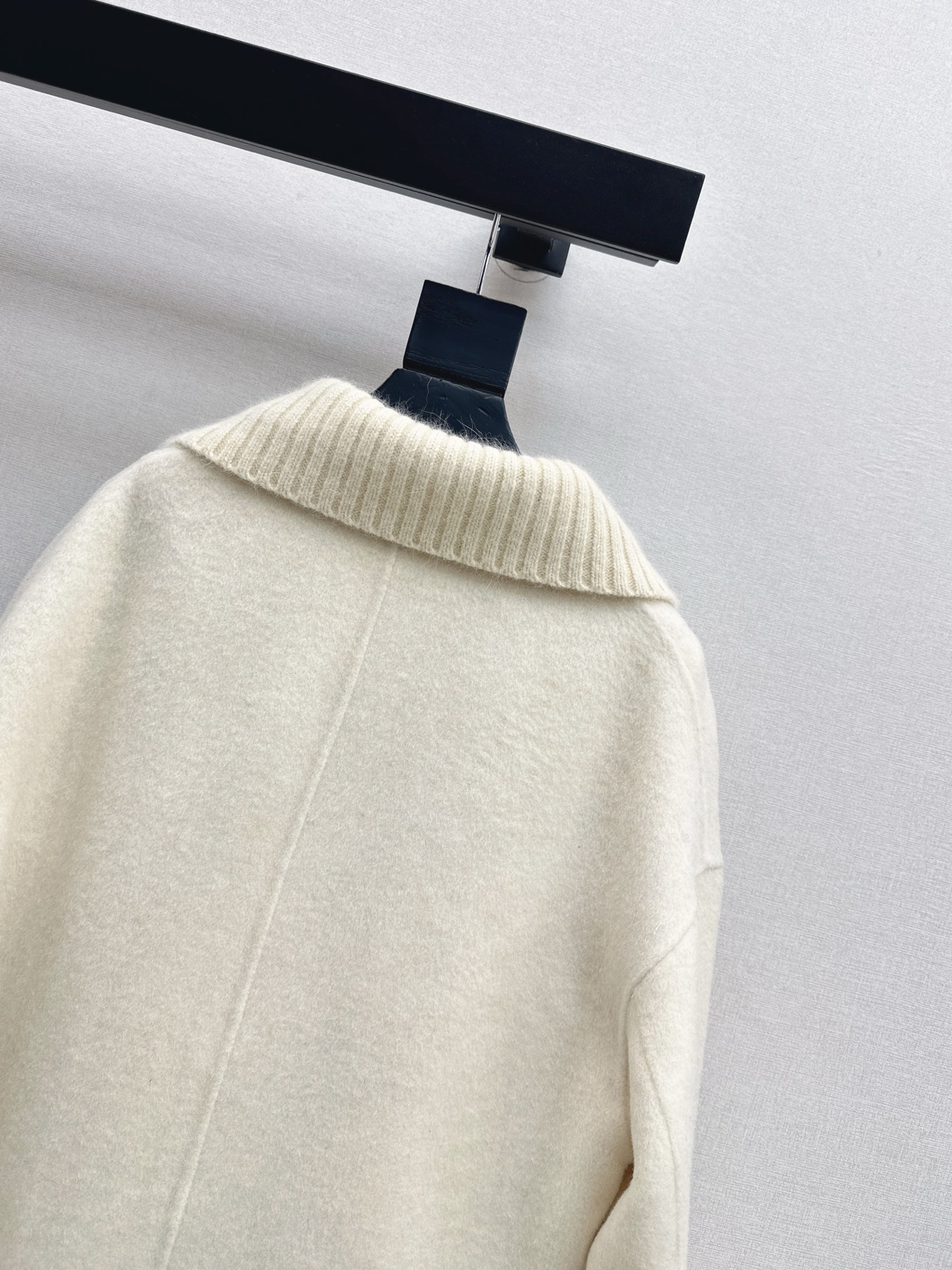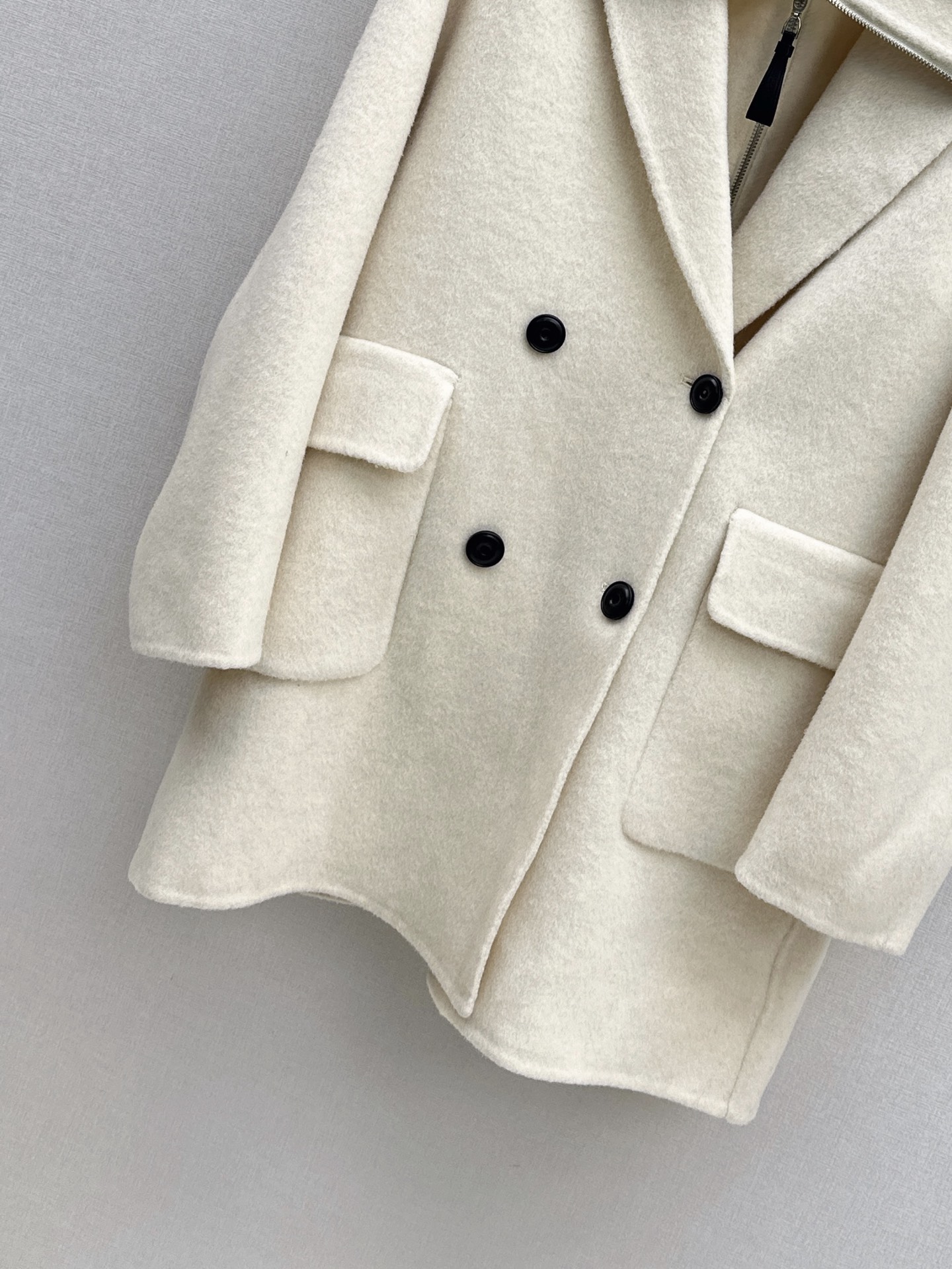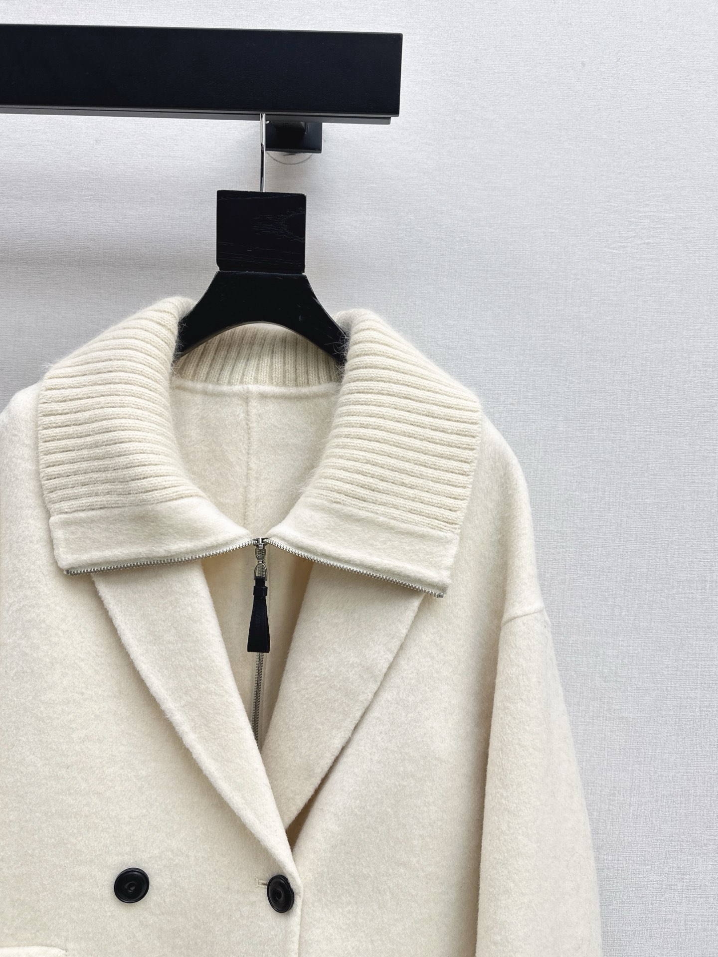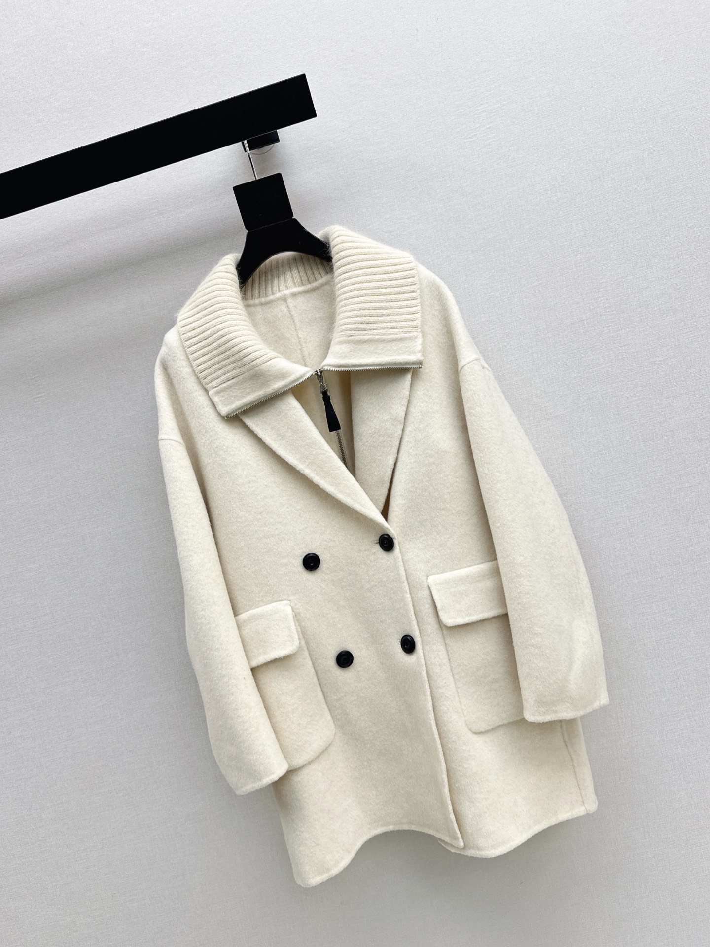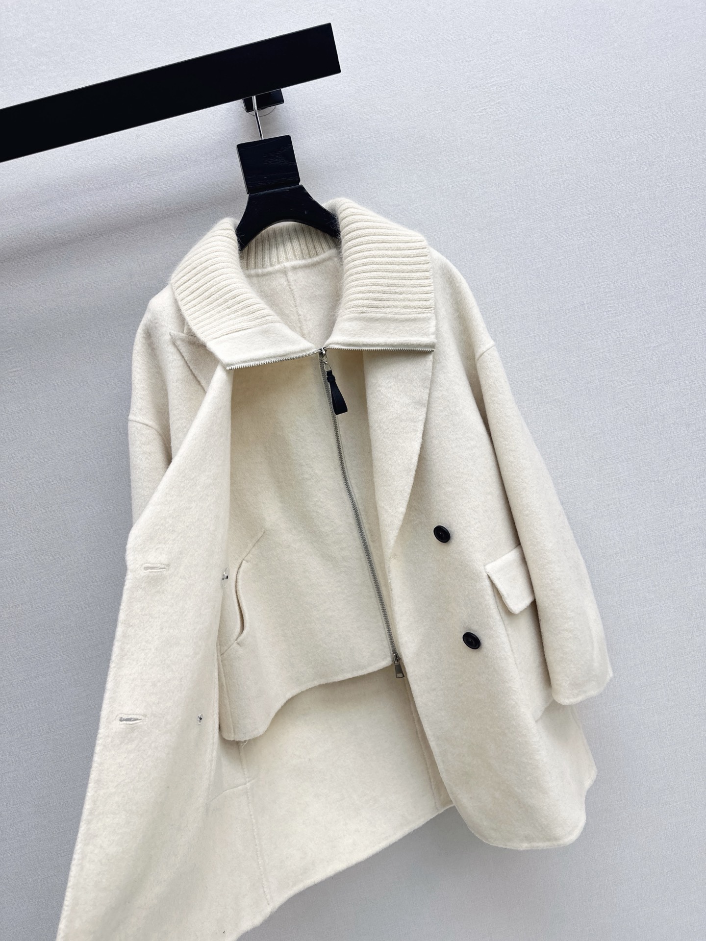 This exclusive two-piece set brings together high-end minimalist design for the fall and winter seasons. It includes a mid-length coat with a knitted lapel vest and a double-breasted, double-sided woolen coat, offering a casual yet sophisticated style.