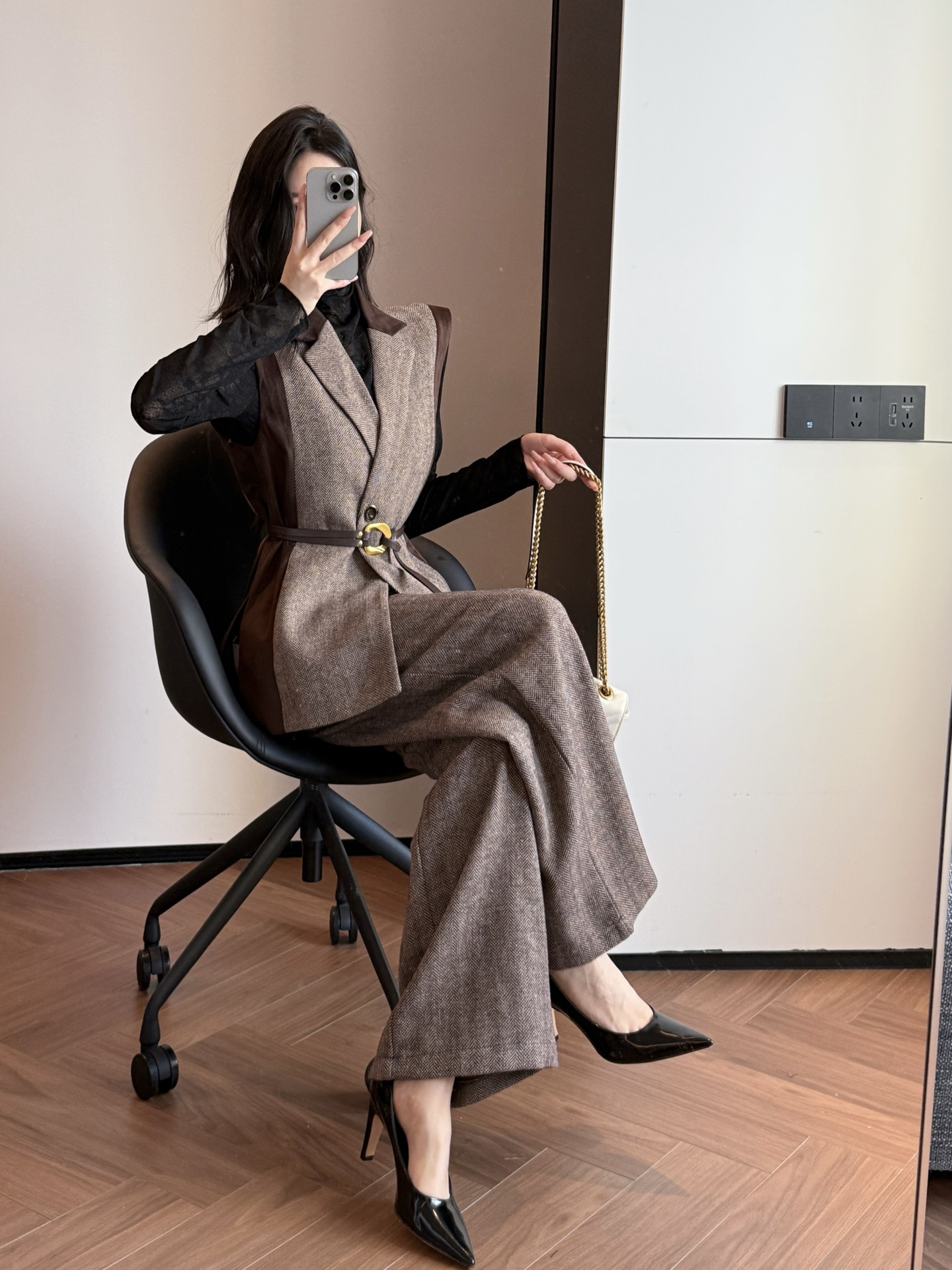 This wool blend vest and wide-leg pants set is a versatile addition to any closet, seamlessly blending professional polish with everyday style.