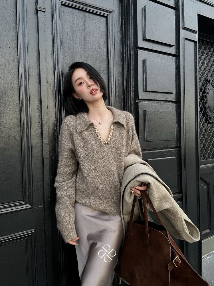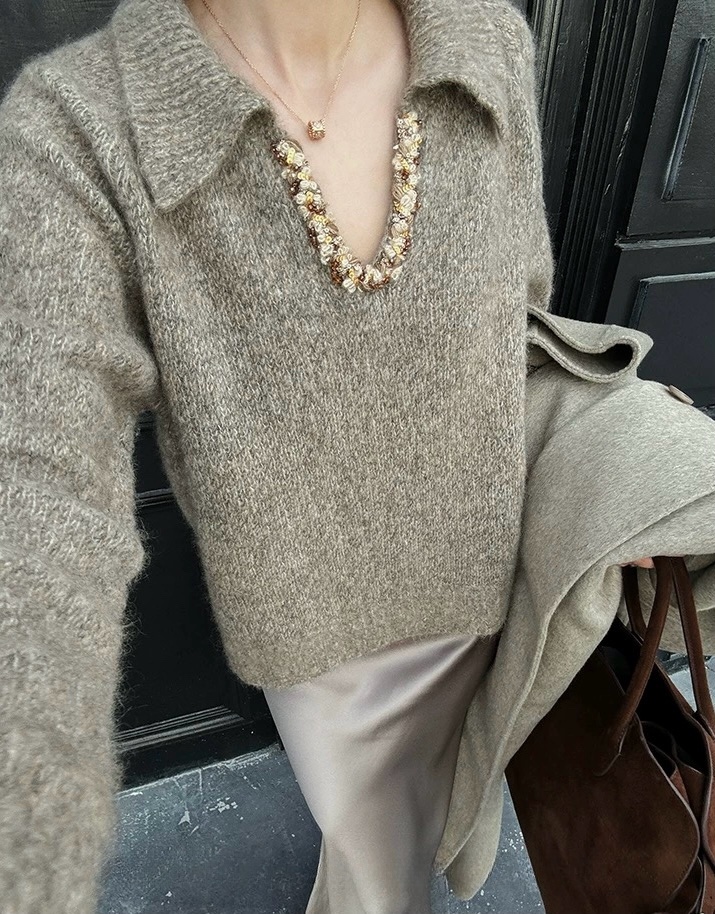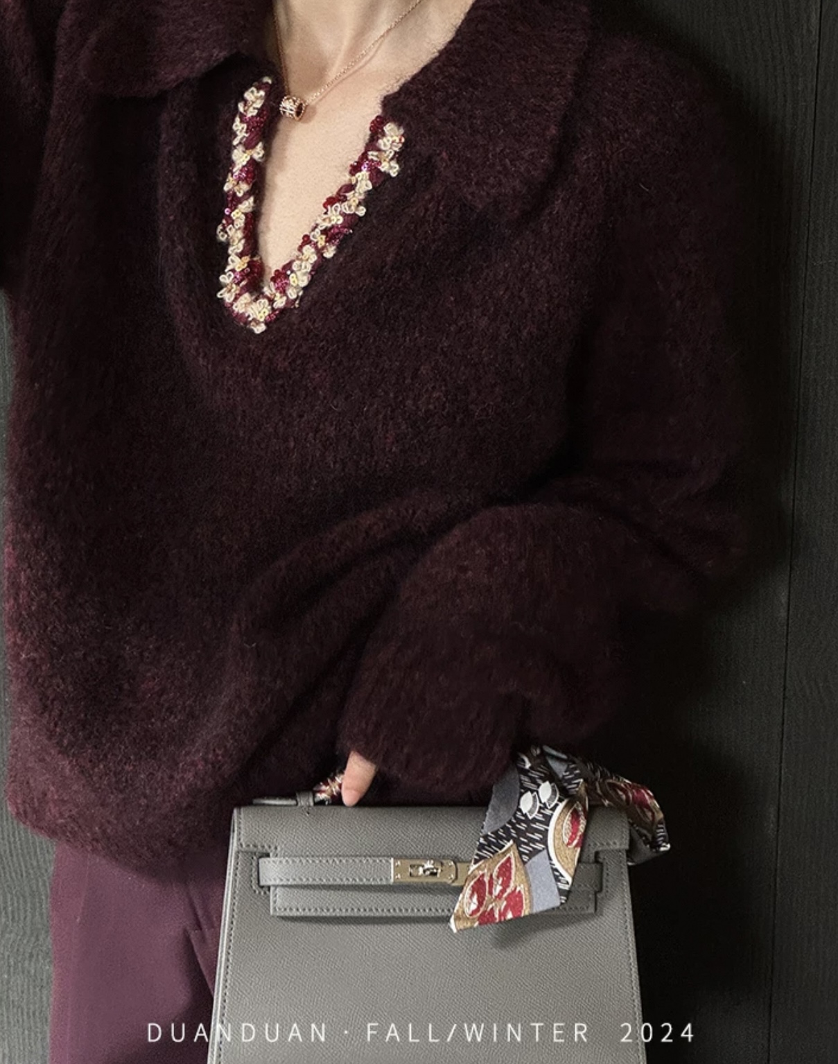 Elegant Wool Sweater with Rhinestone V-Neck, Soft & Warm Knit Jumper