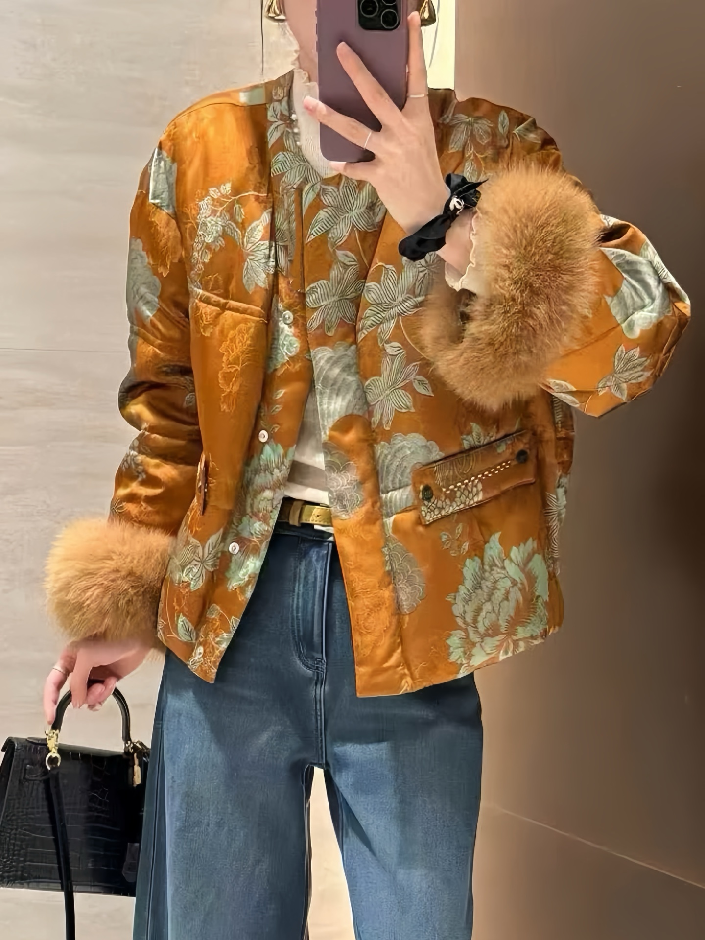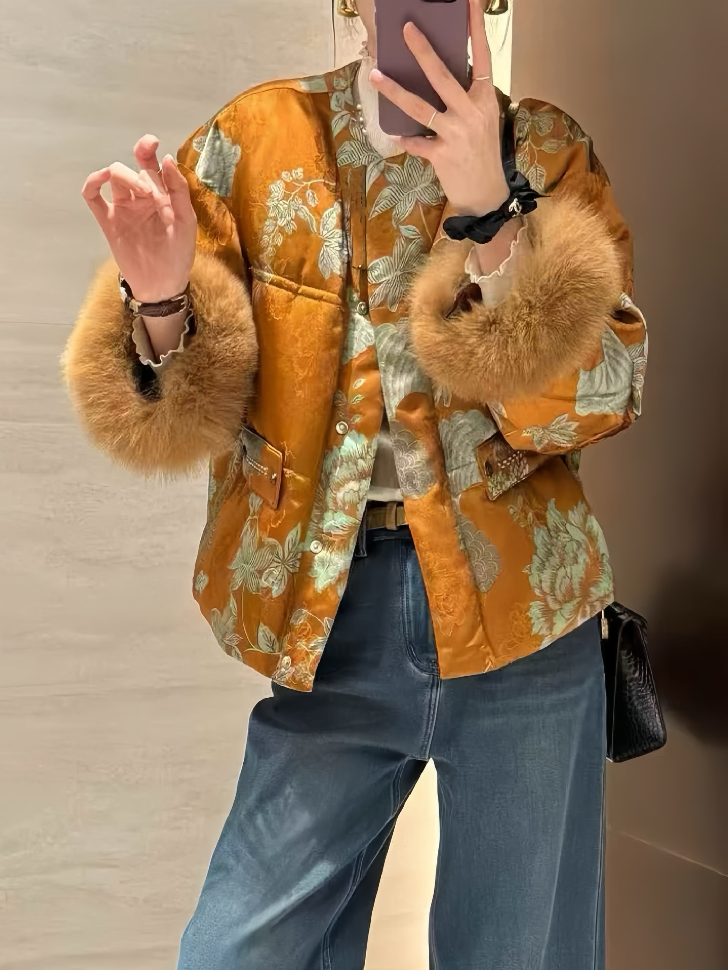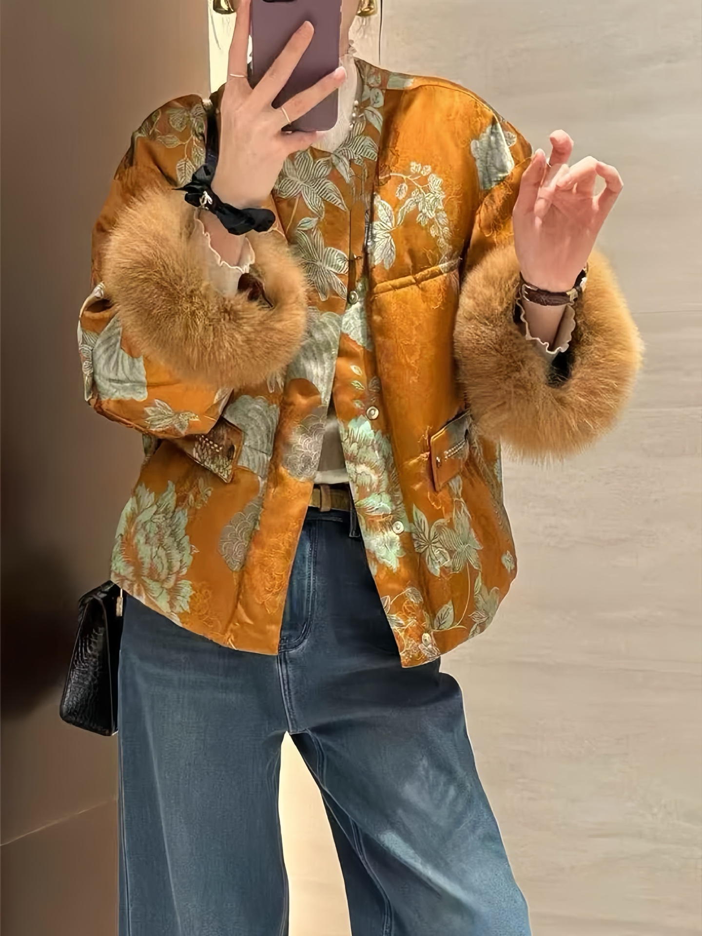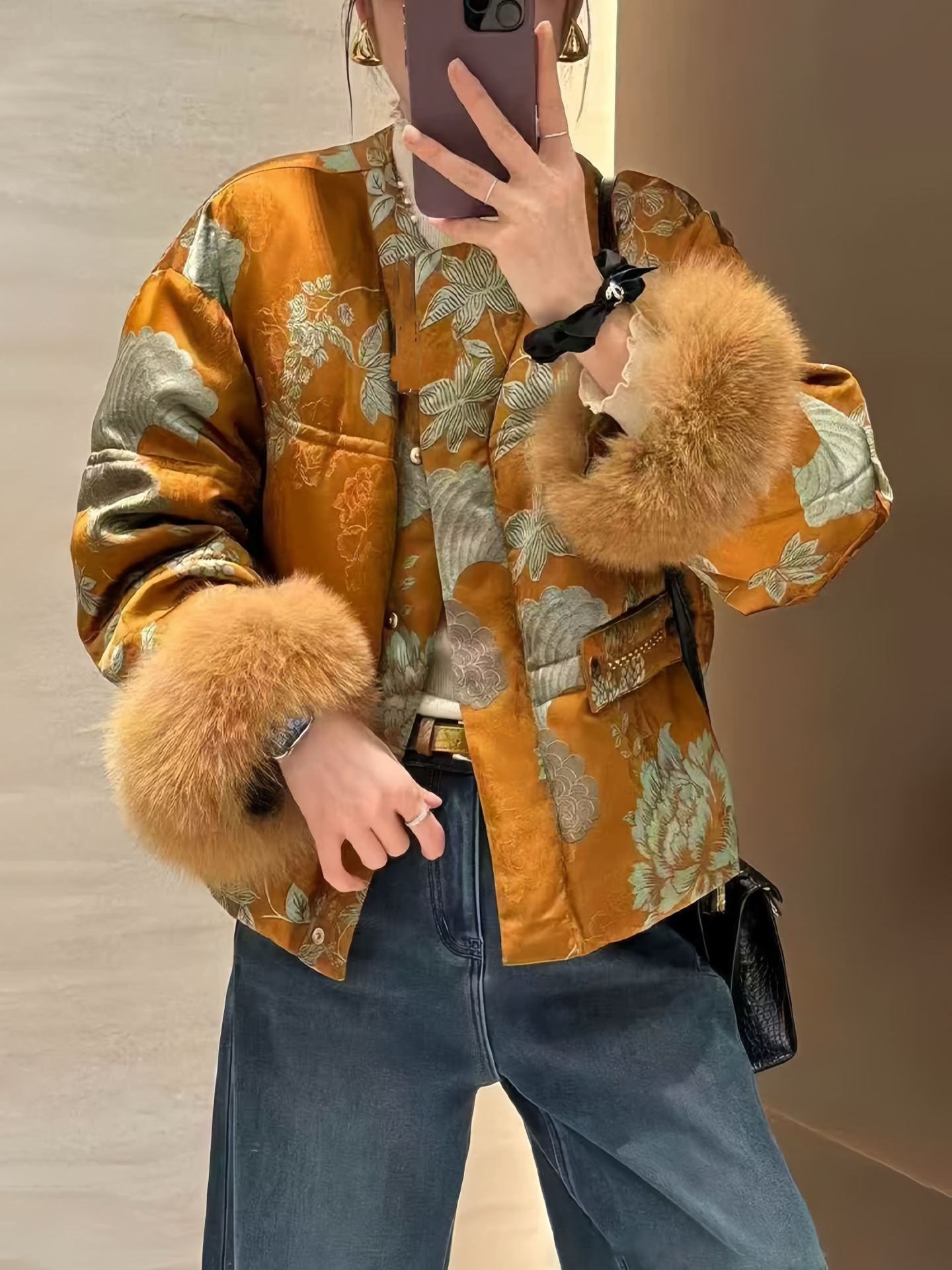 Floral Jacquard Down Jacket with Fur Cuffs, Elegant Quilted Coat for Women