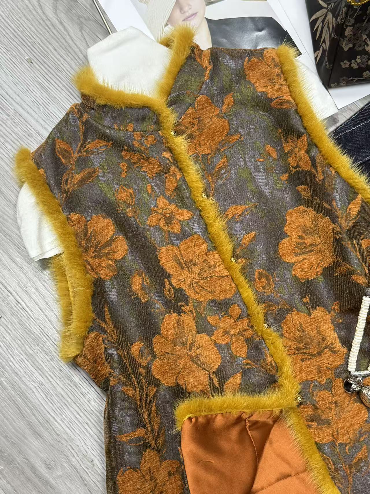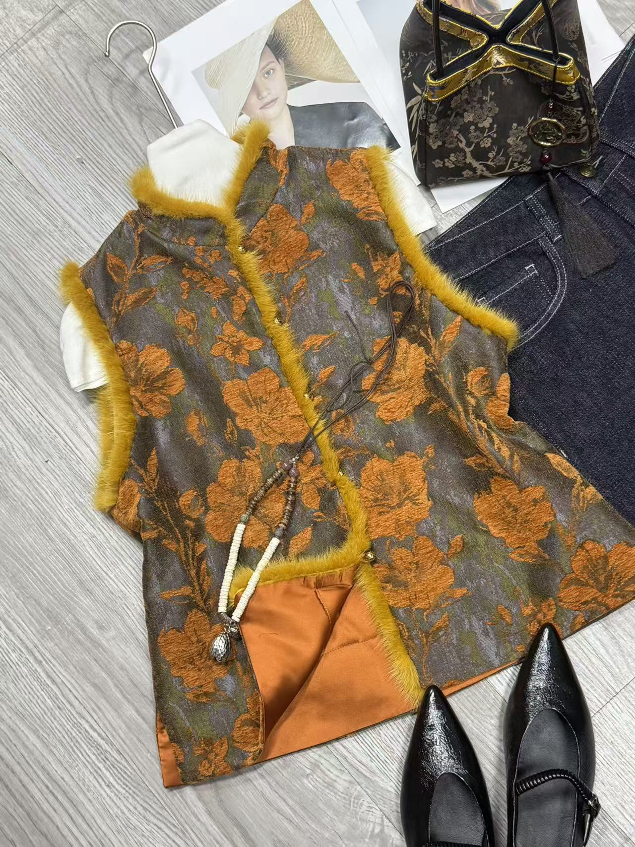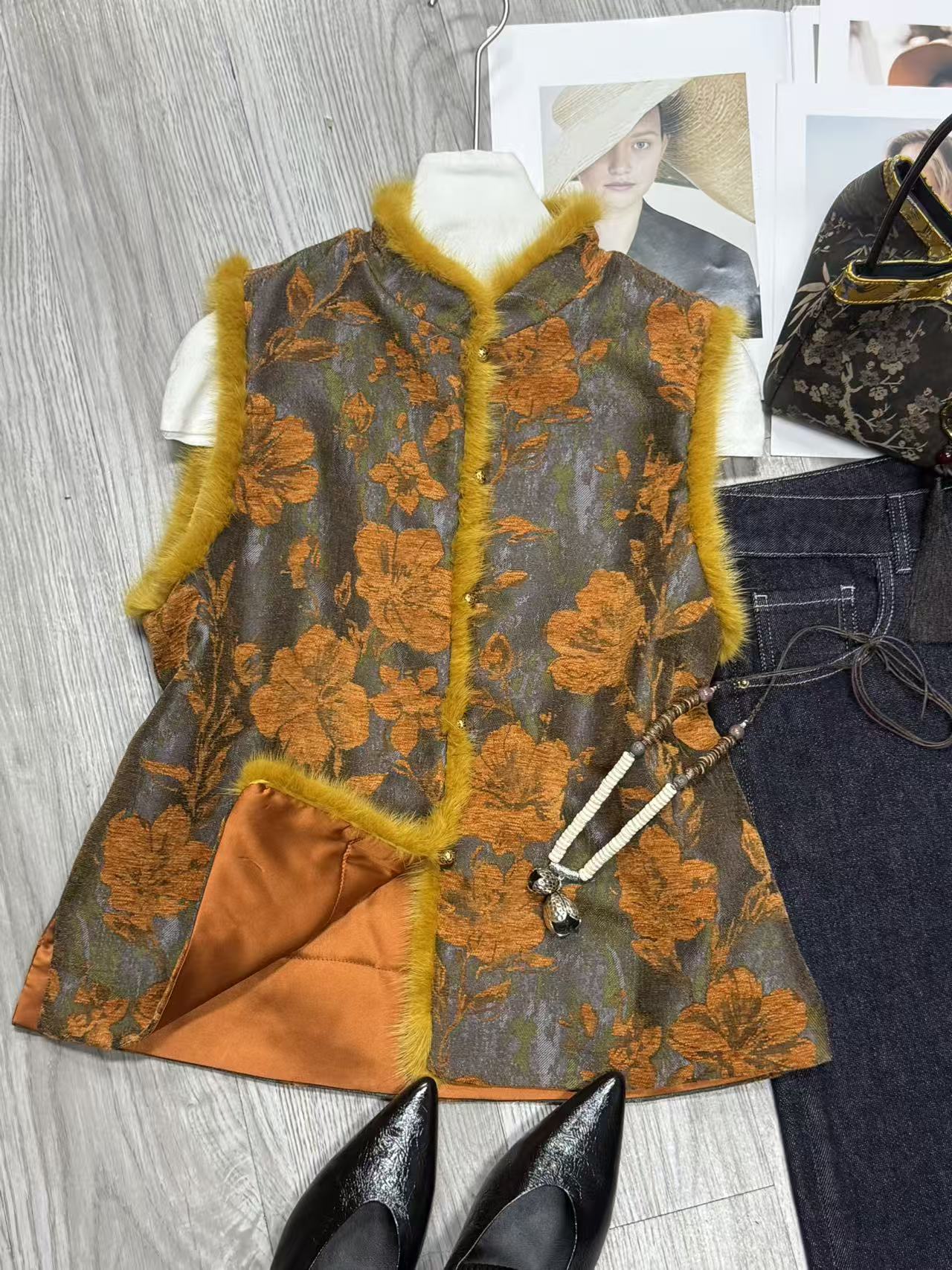 This exquisite vest blends traditional Chinese aesthetics with luxurious materials. The floral jacquard fabric and mink fur trim create a unique and sophisticated piece.