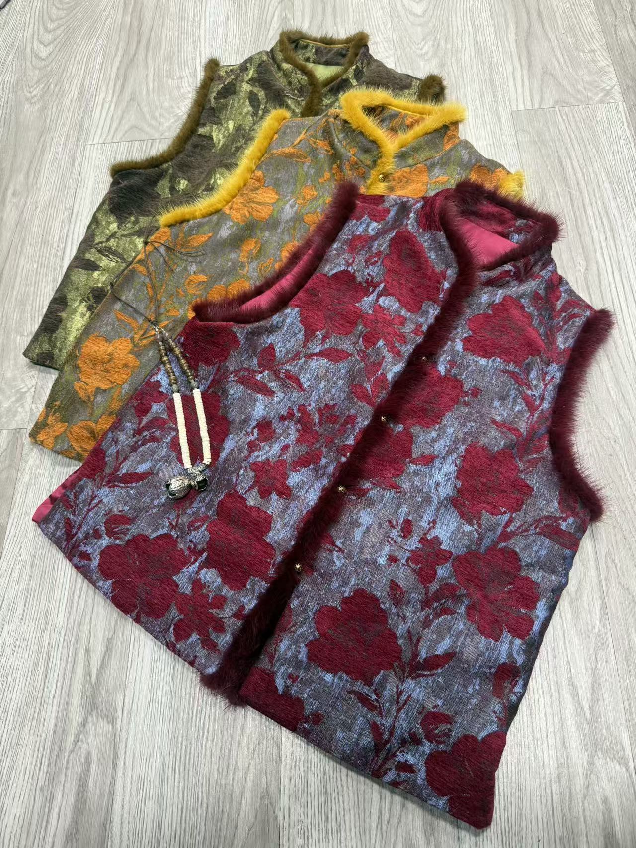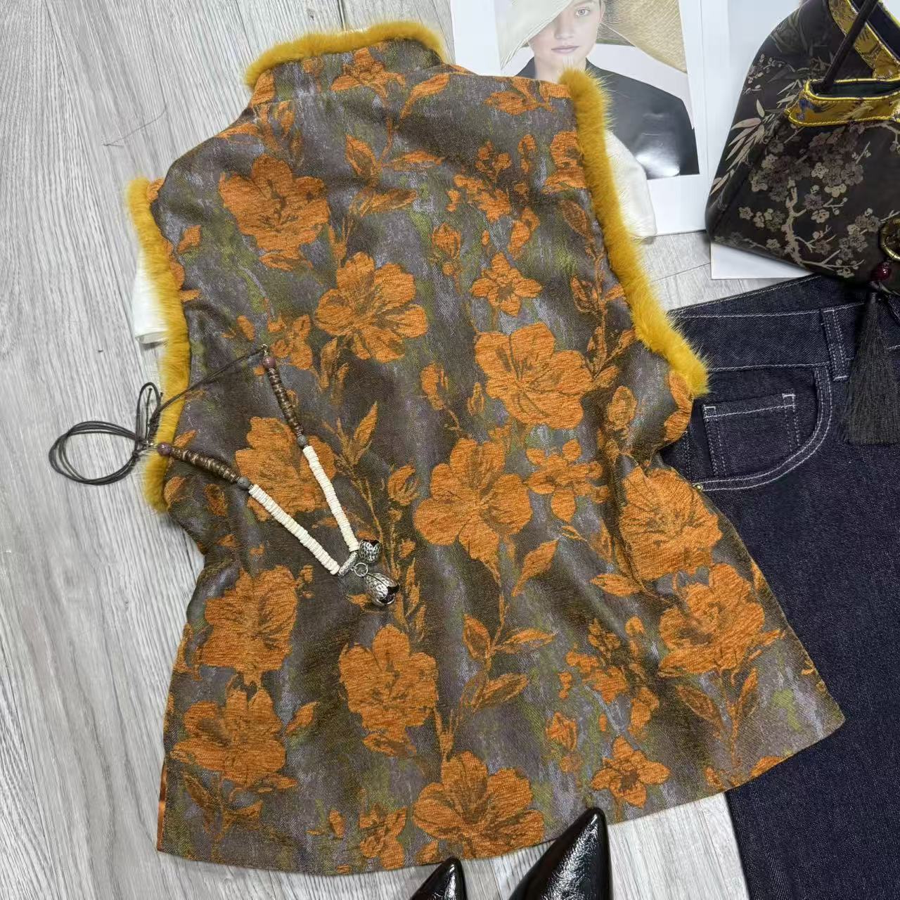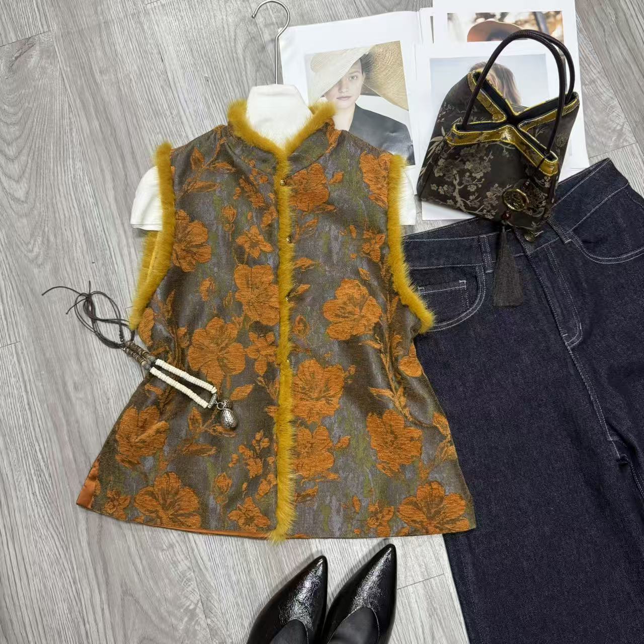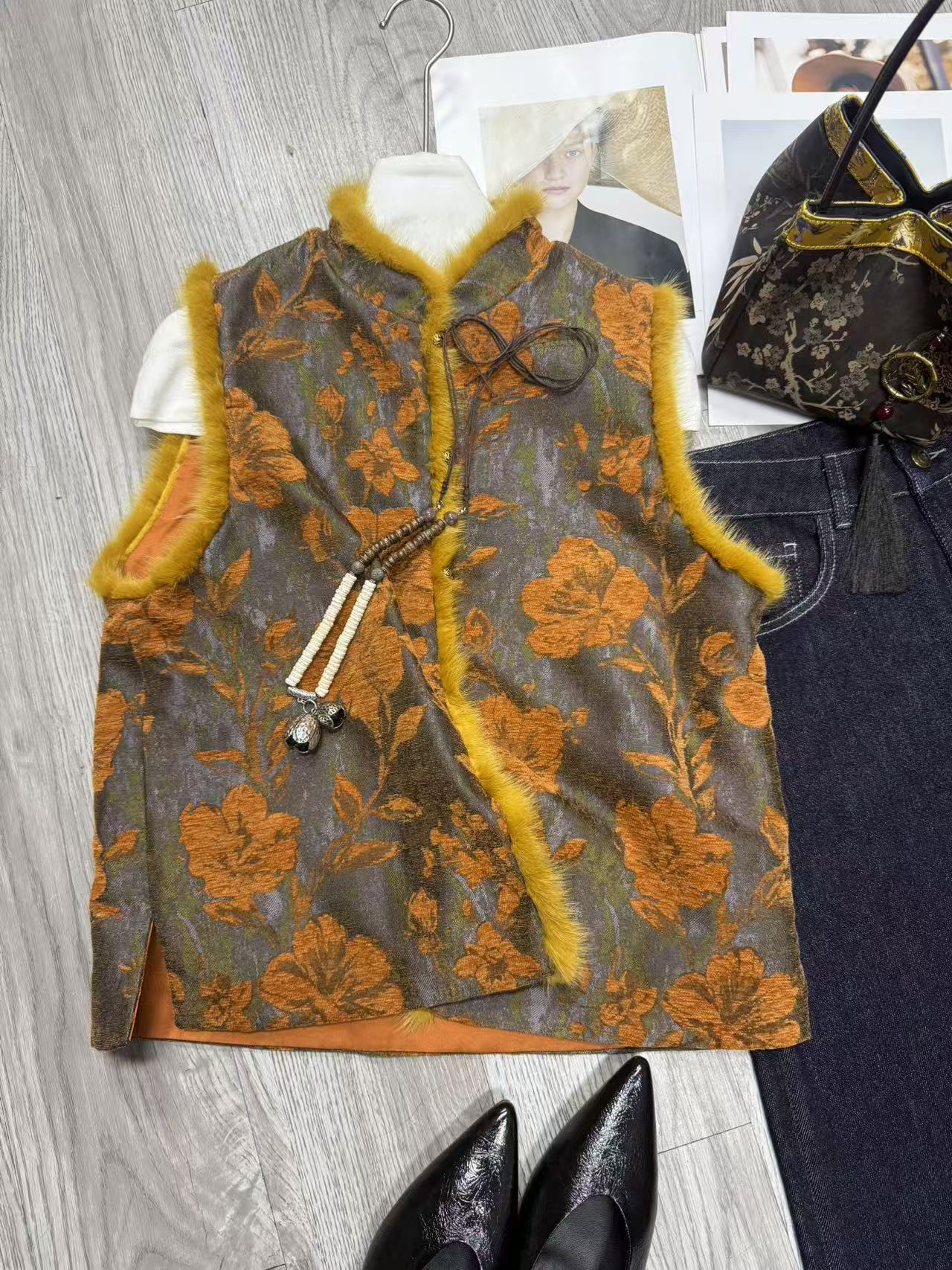 This exquisite vest blends traditional Chinese aesthetics with luxurious materials. The floral jacquard fabric and mink fur trim create a unique and sophisticated piece.