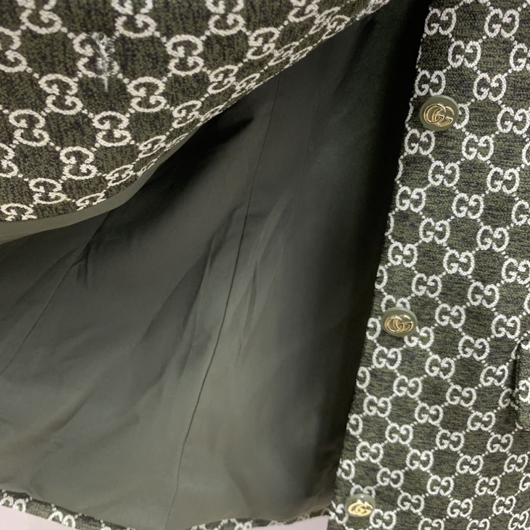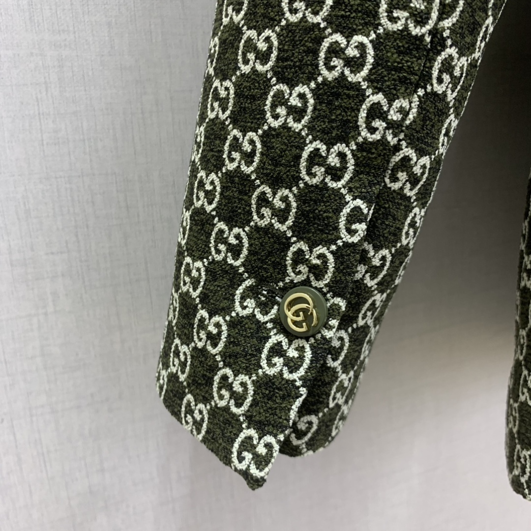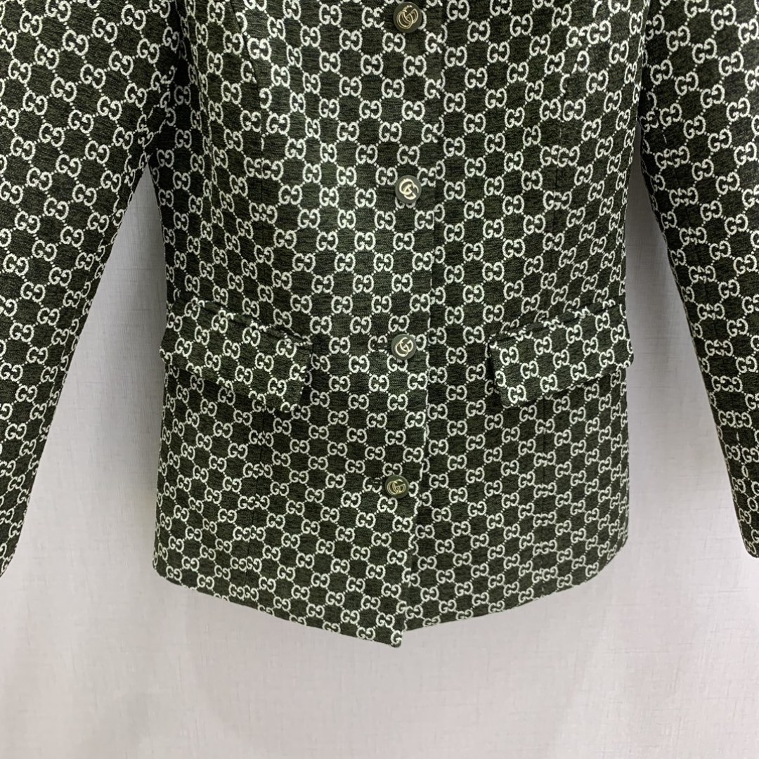 Elevate your style with this Gucci blazer. Featuring a classic double G jacquard pattern, tailored fit, and crafted from quality wool blend.