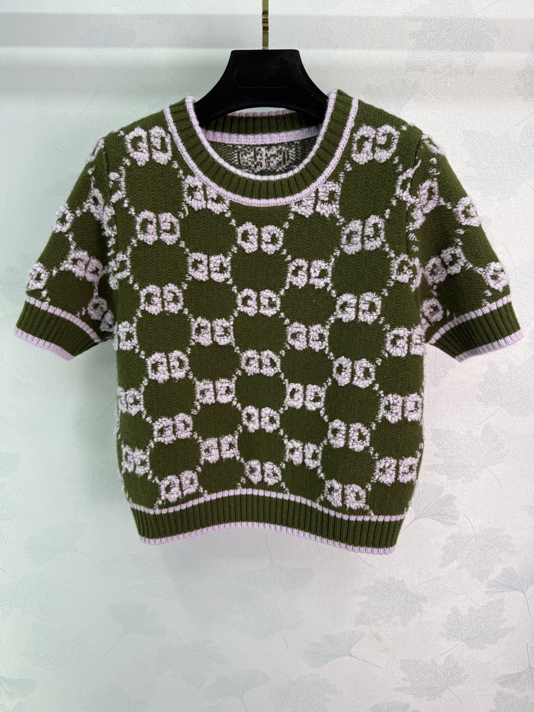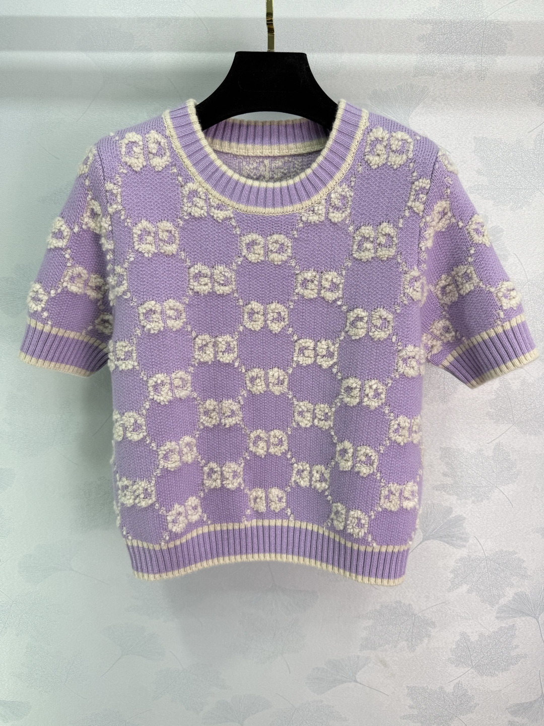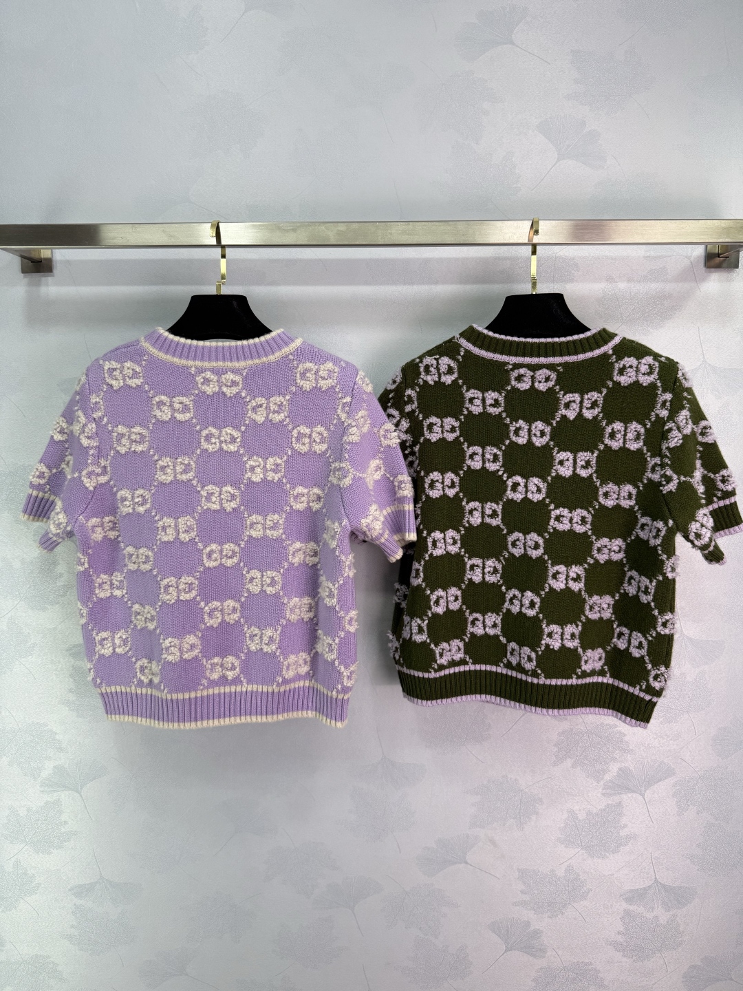Elevate your style with this Gucci knit top. Features a double G logo, short sleeves, round neck, and ribbed cuffs/hem. Available in purple and army green.