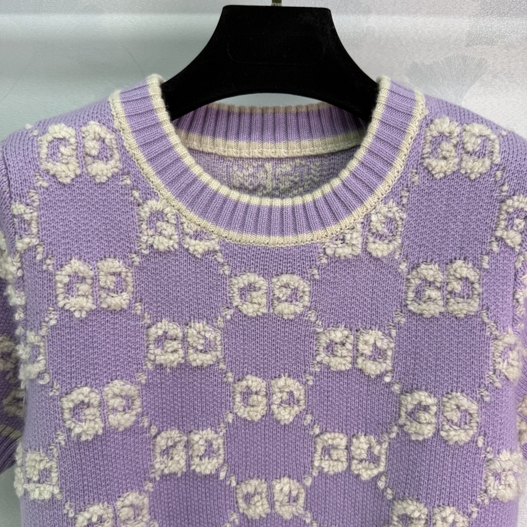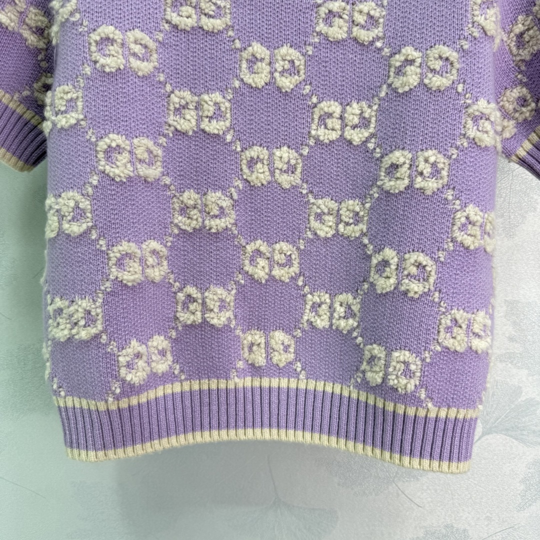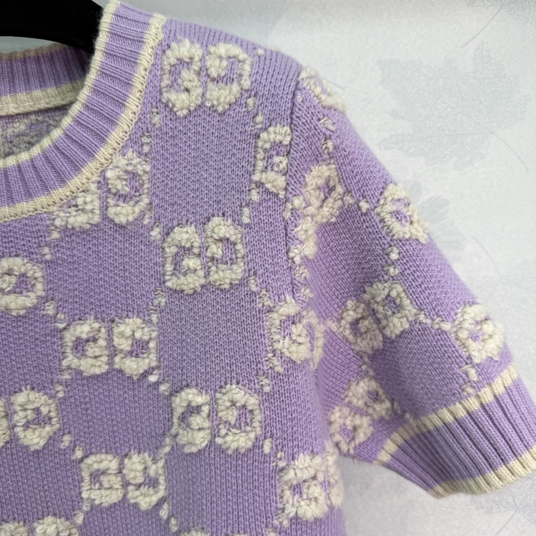 Elevate your style with this Gucci knit top. Features a double G logo, short sleeves, round neck, and ribbed cuffs/hem. Available in purple and army green.