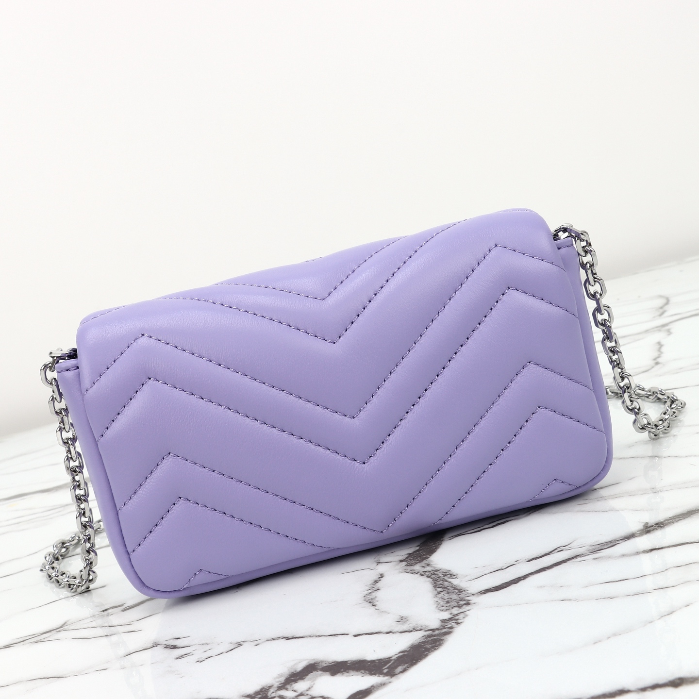 The Gucci GG Marmont mini bag in light purple leather. Features chevron quilting, double G hardware, and chain strap. Size: 6.5"W x 3.7"H x 1.8"D.
