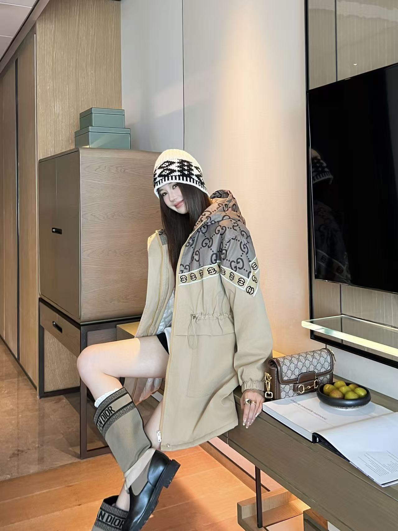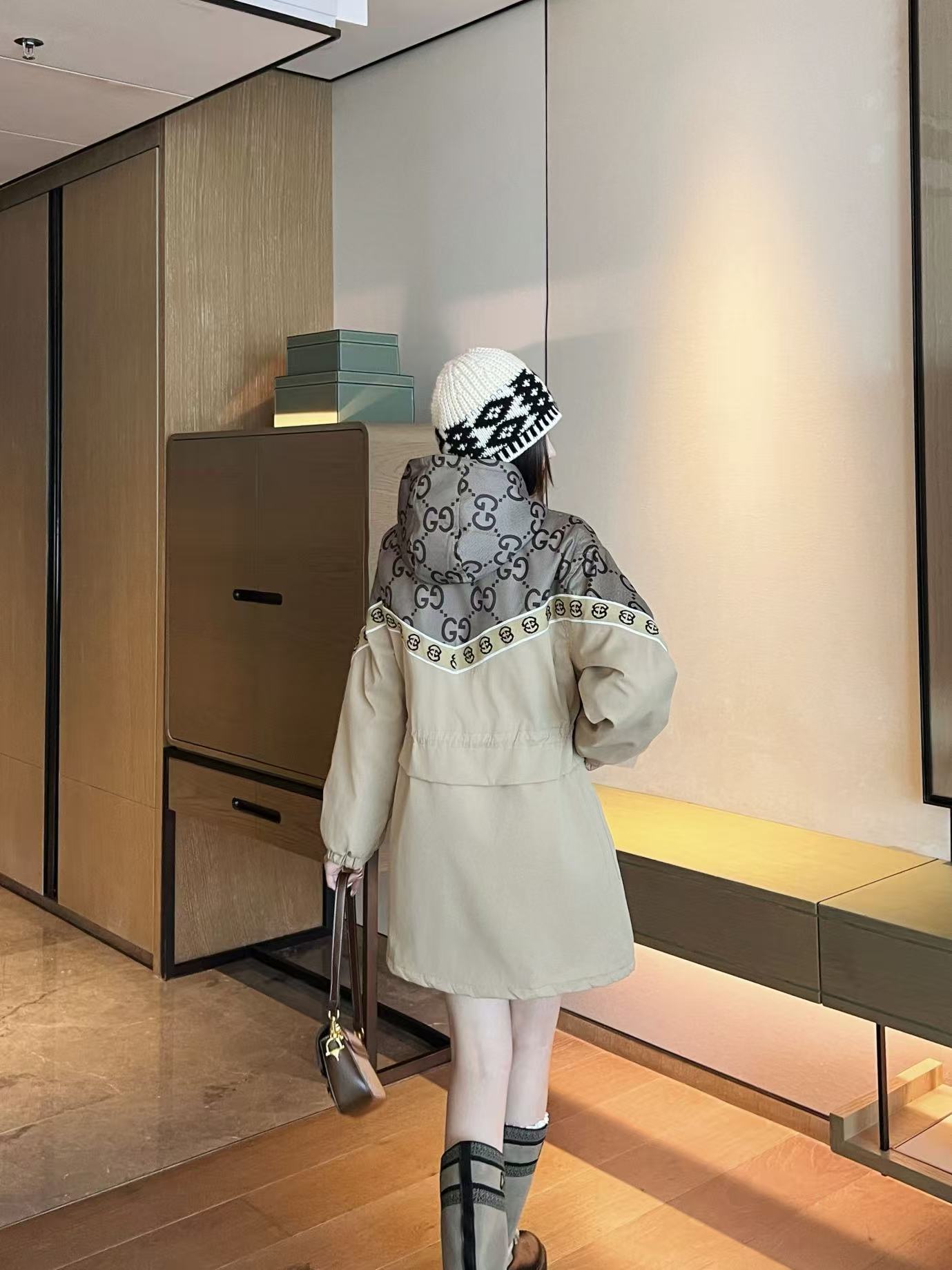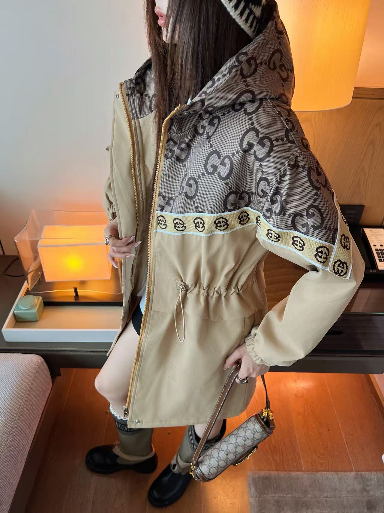 This Gucci monogram hooded jacket is a classic piece that blends high fashion with everyday functionality.