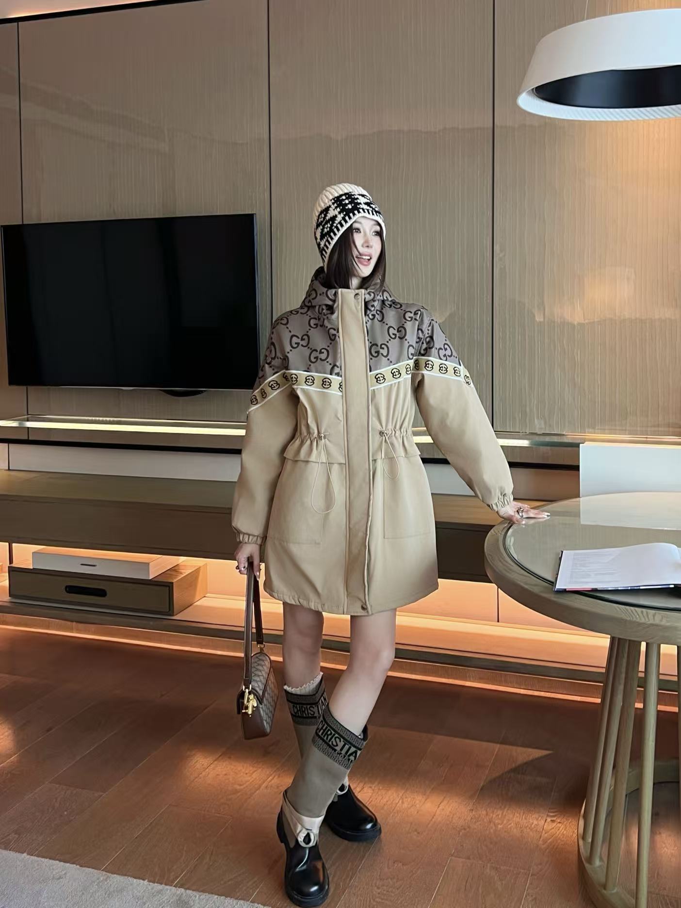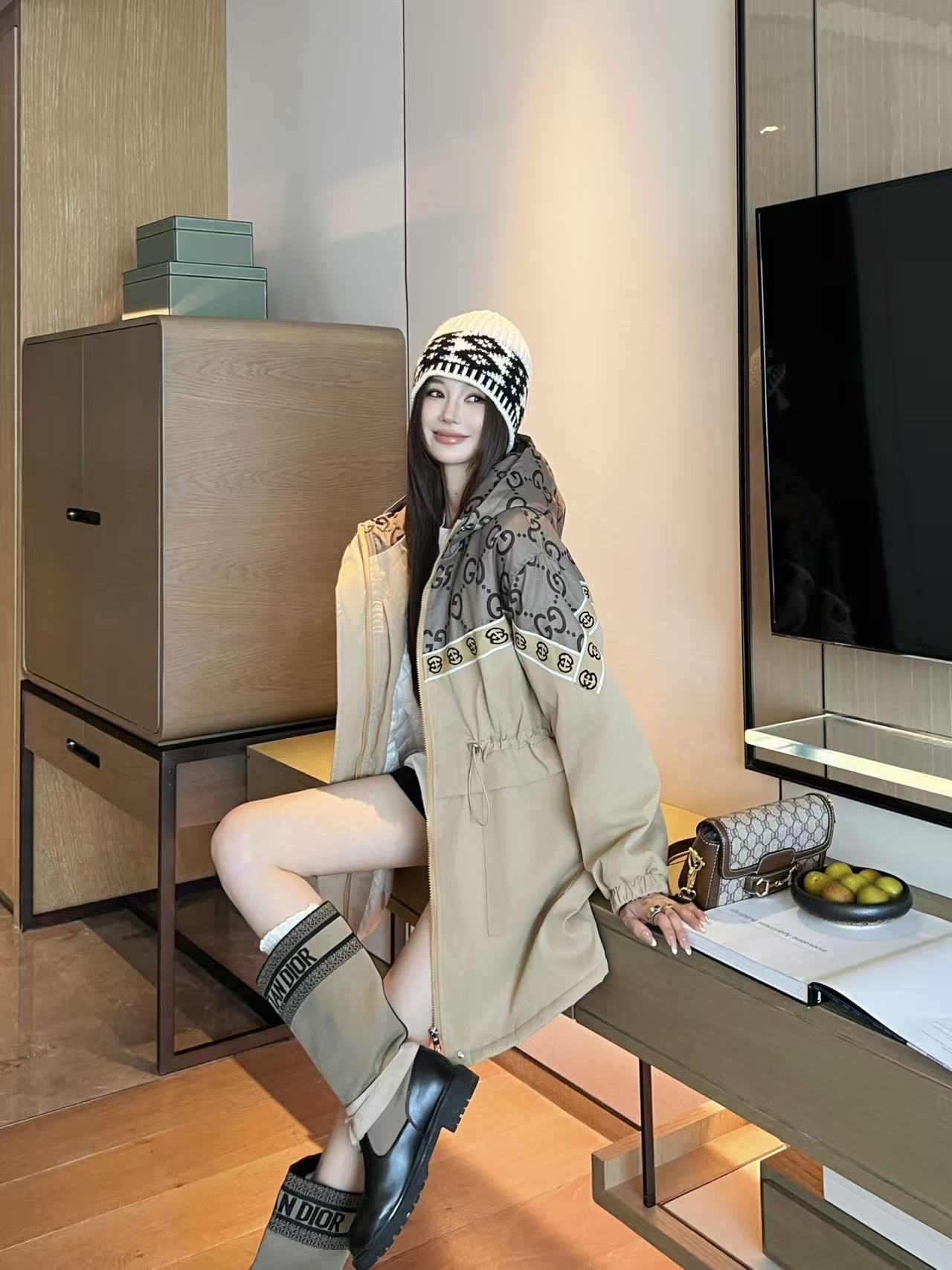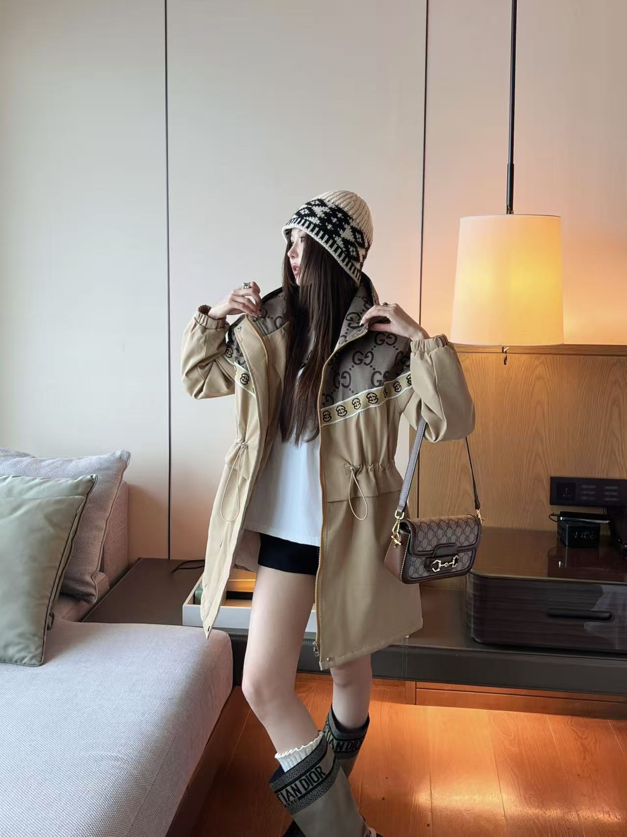This Gucci monogram hooded jacket is a classic piece that blends high fashion with everyday functionality.