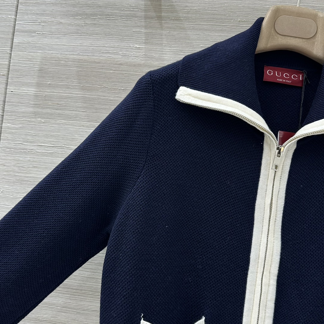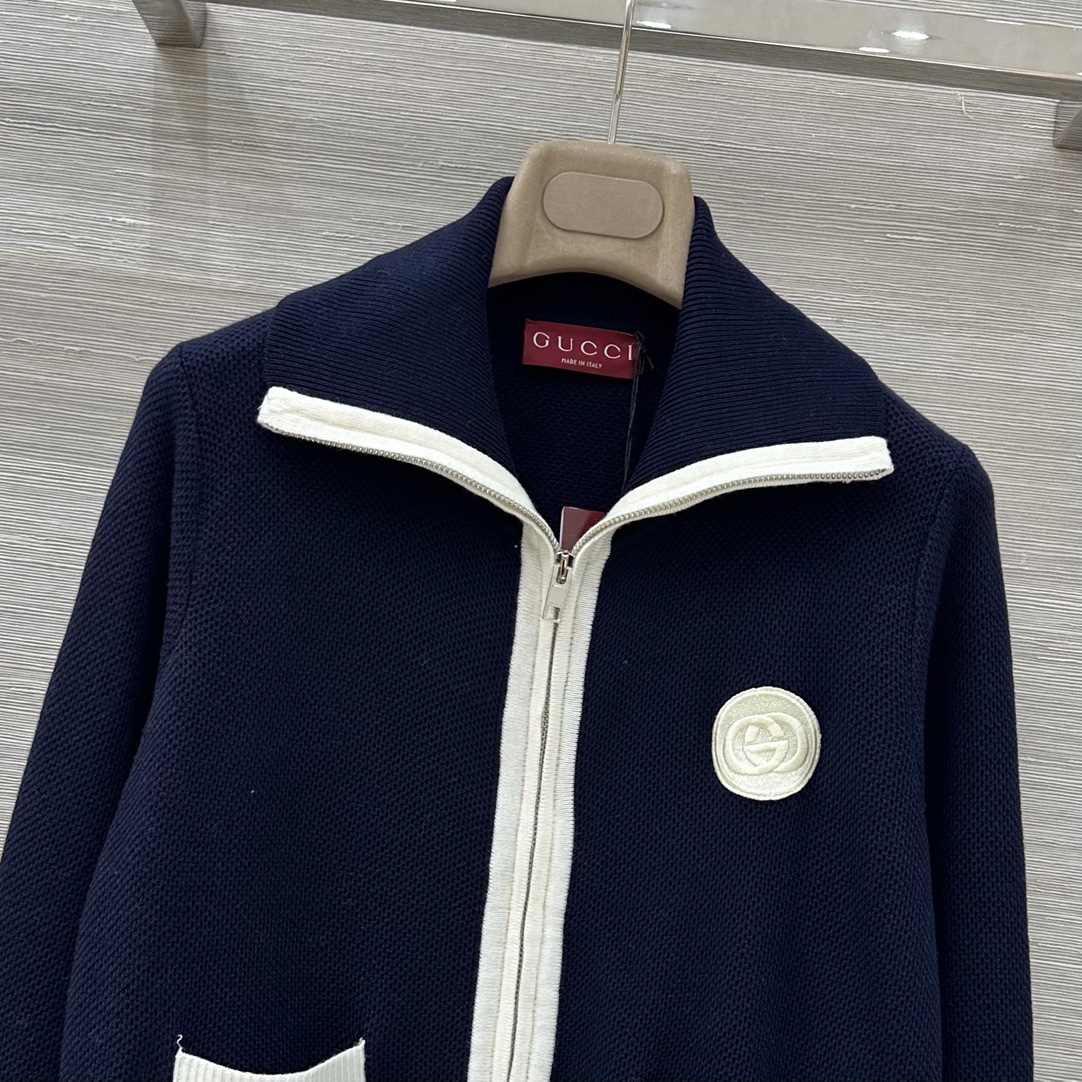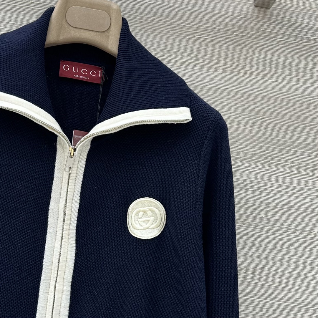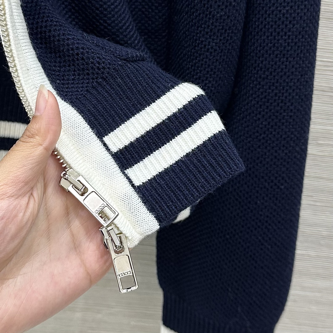 Elevate your style with this Gucci knit cardigan. Crafted from a wool blend, it features a zip-up front, navy and white colorway, and signature Gucci detailing.