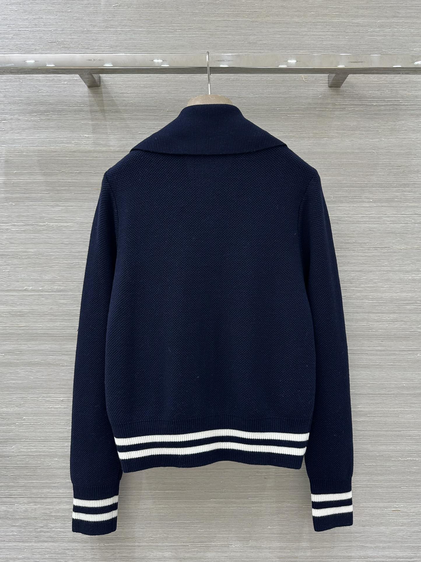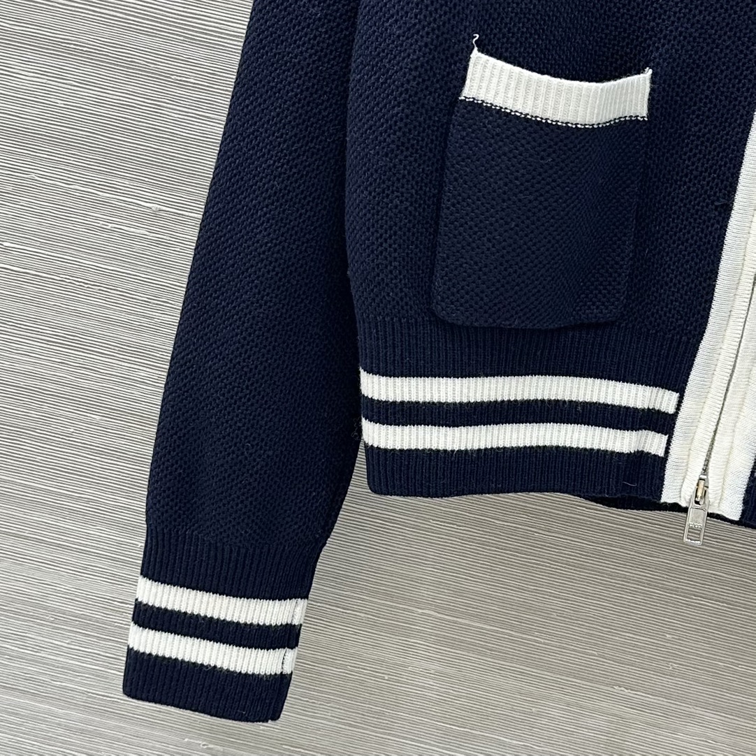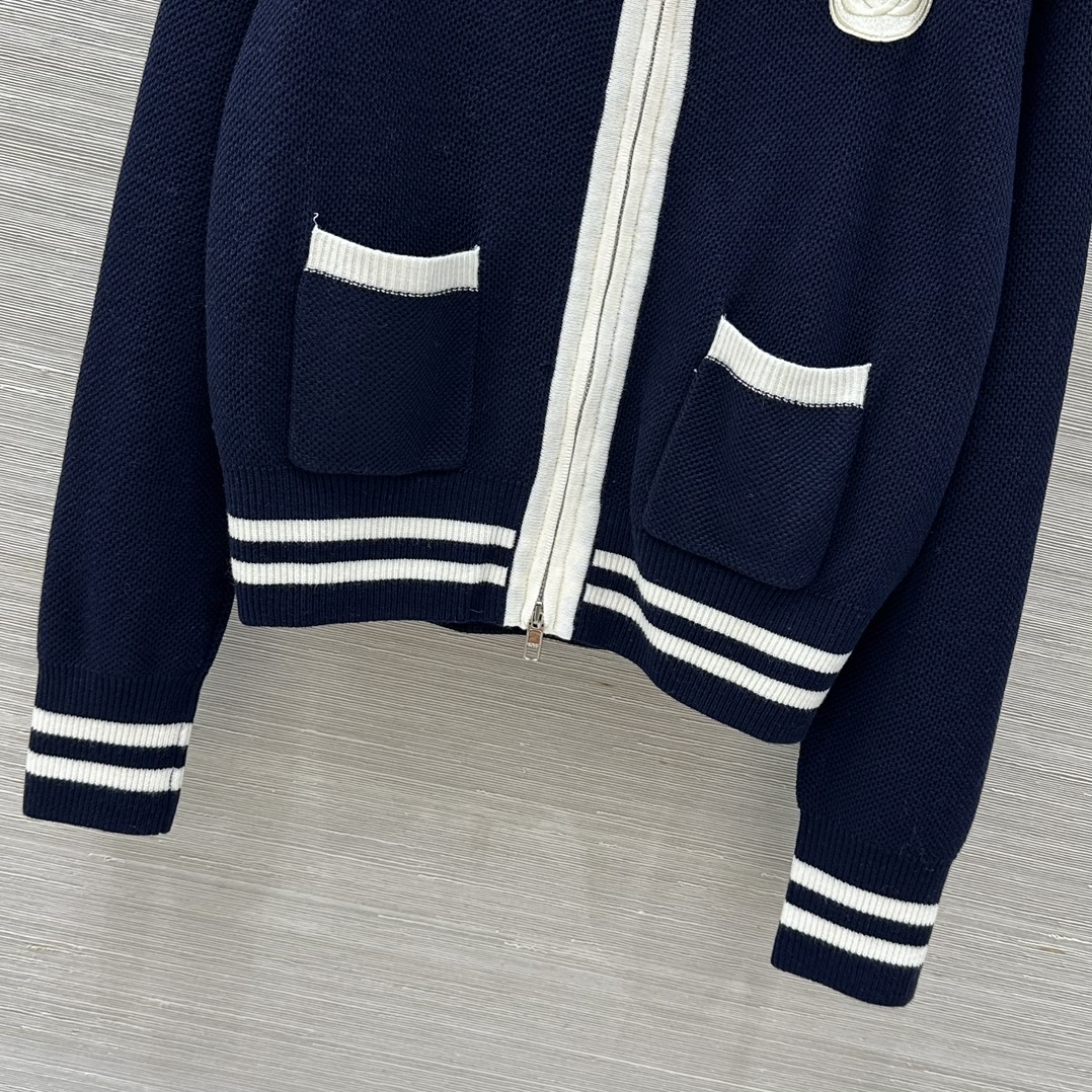 Elevate your style with this Gucci knit cardigan. Crafted from a wool blend, it features a zip-up front, navy and white colorway, and signature Gucci detailing.