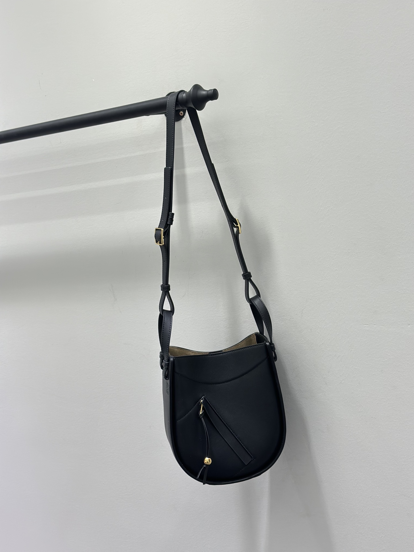 Hammock Bag in Black Leather with Adjustable Strap and Zipper Detail