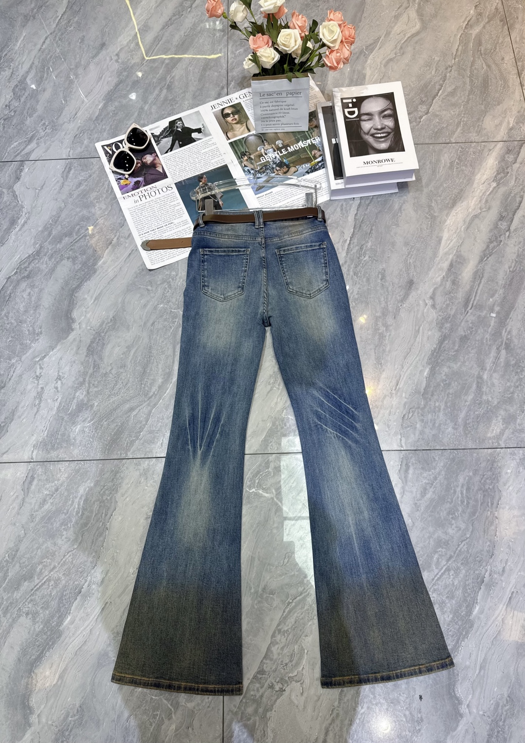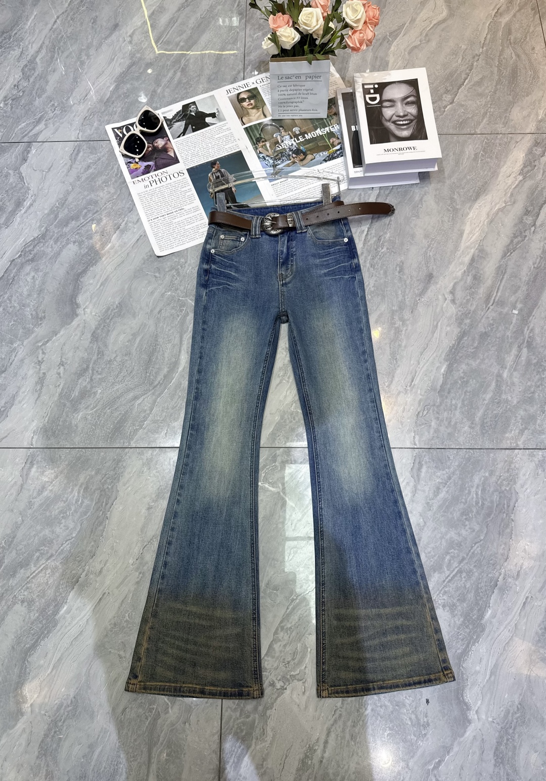These high-waisted flare jeans are a must-have for any fashion-forward woman. The vintage blue denim and bell bottom design offer a unique retro look that's sure to turn heads.
