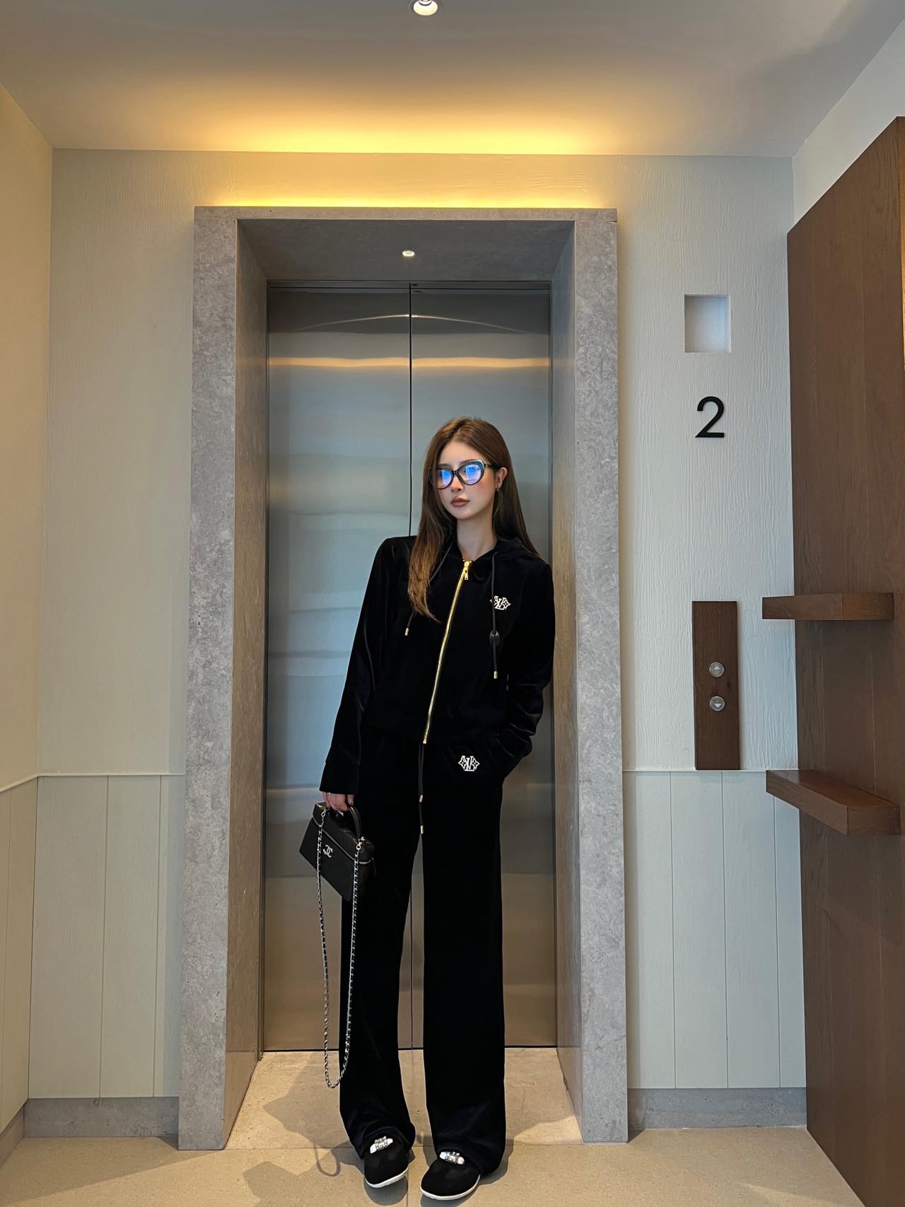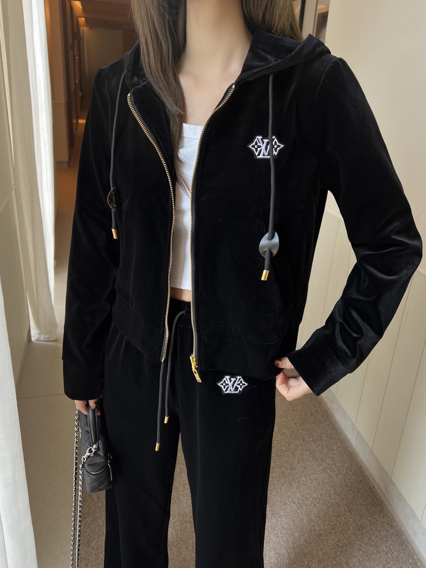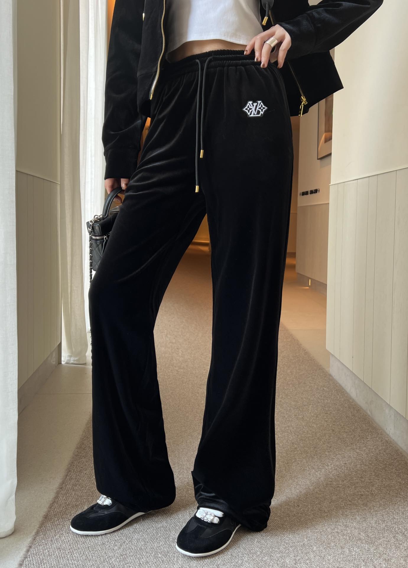Elevate your loungewear with this L/V velvet tracksuit! Features a hooded jacket with logo & wide-leg pants. Available in black. Comfort meets chic!