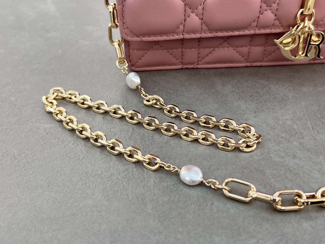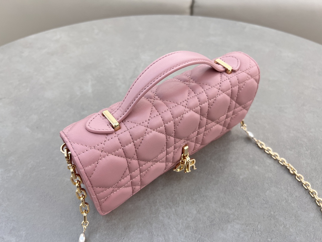 Elevate your style with this Lady Dior clutch. Crafted in lambskin with the iconic Cannage stitch, featuring pearl chain & D.I.O.R. charm.