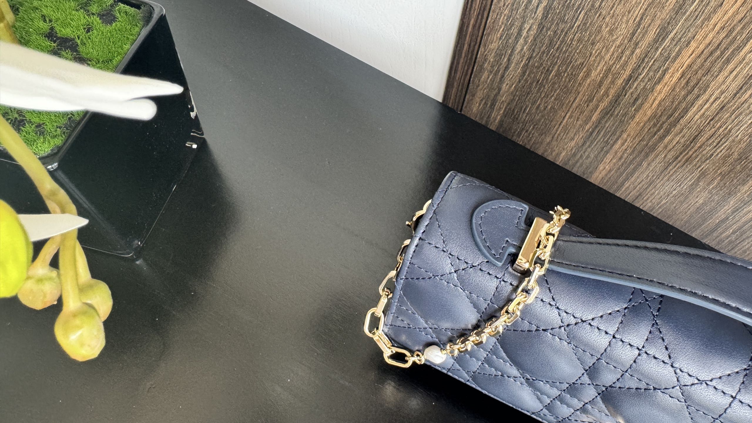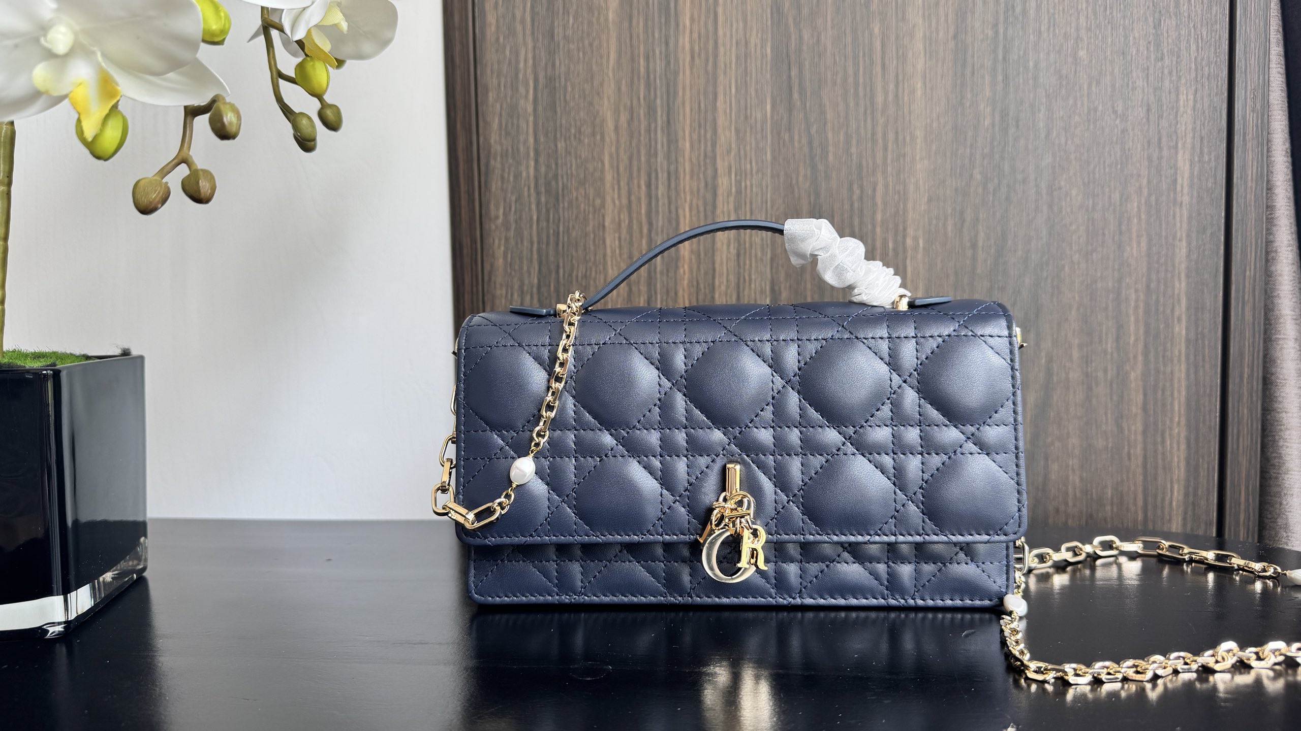 Tags: Blue Lambskin Bag, Cannage Stitch Bag, Chain Strap Handbag, Lady Dior Handbag, Luxury Designer Bag, Pearl Embellished Bag