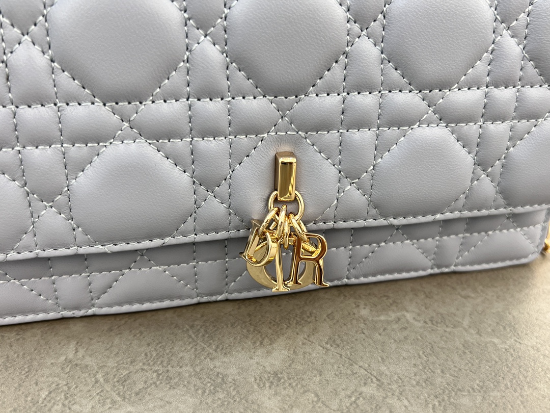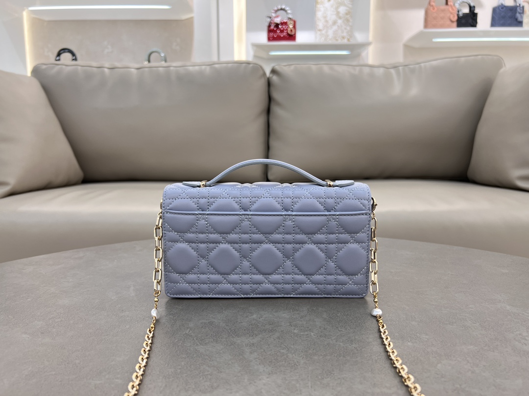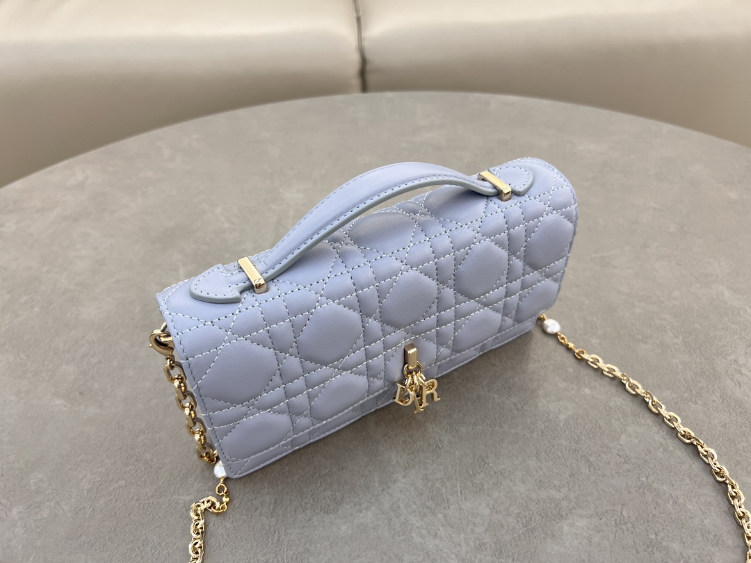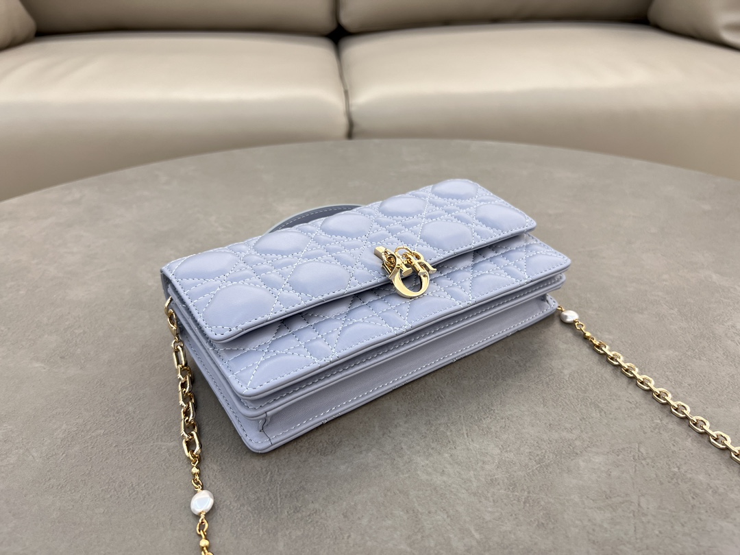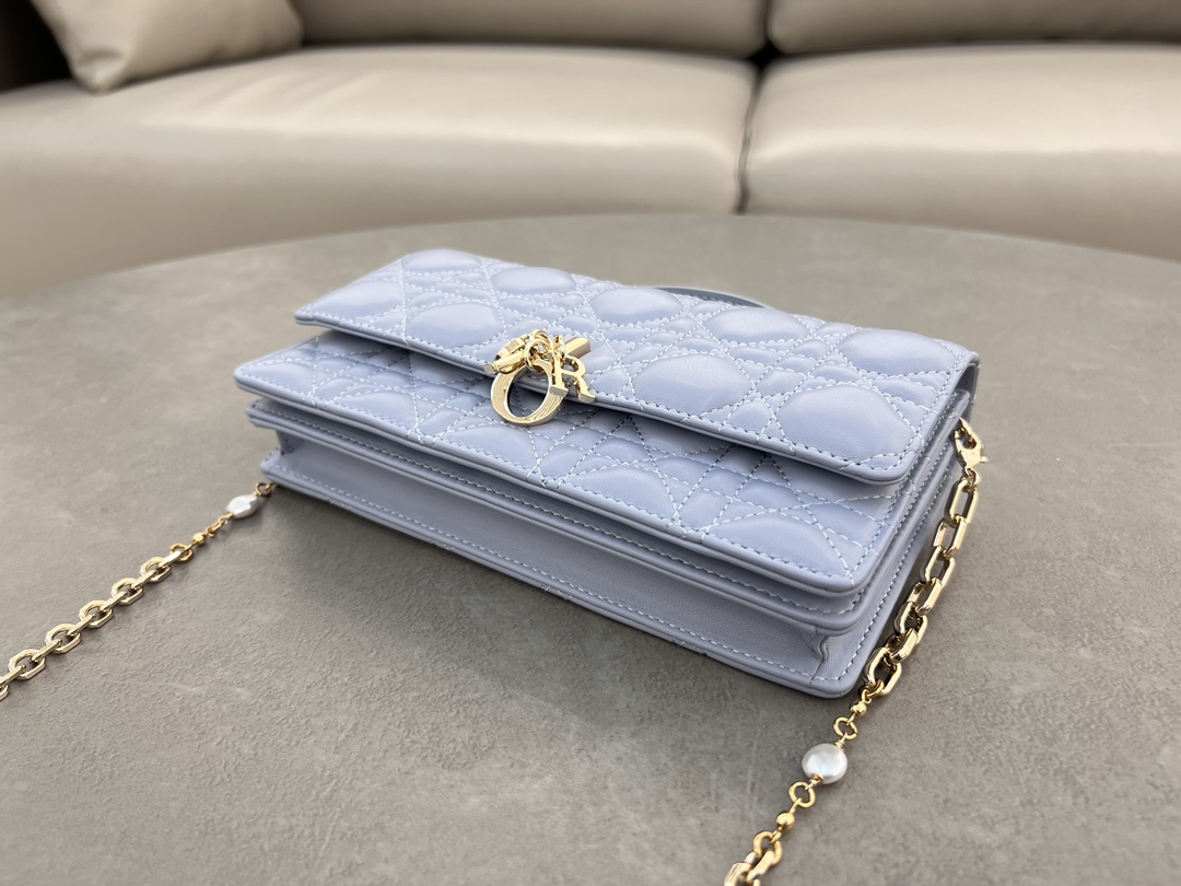 Elevate your style with the Lady Dior clutch. Crafted in pale blue lambskin with pearl chain, it's the perfect day-to-night accessory.