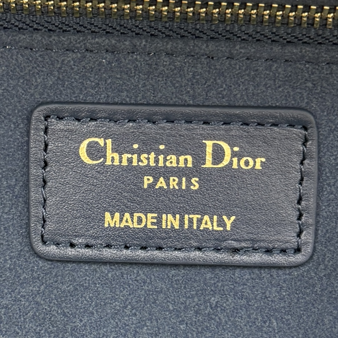 The Lady Dior bag embodies Dior's vision of elegance and beauty. Crafted in blue lambskin with iconic Cannage stitching and D.I.O.R. charms. Can be carried by hand or crossbody.