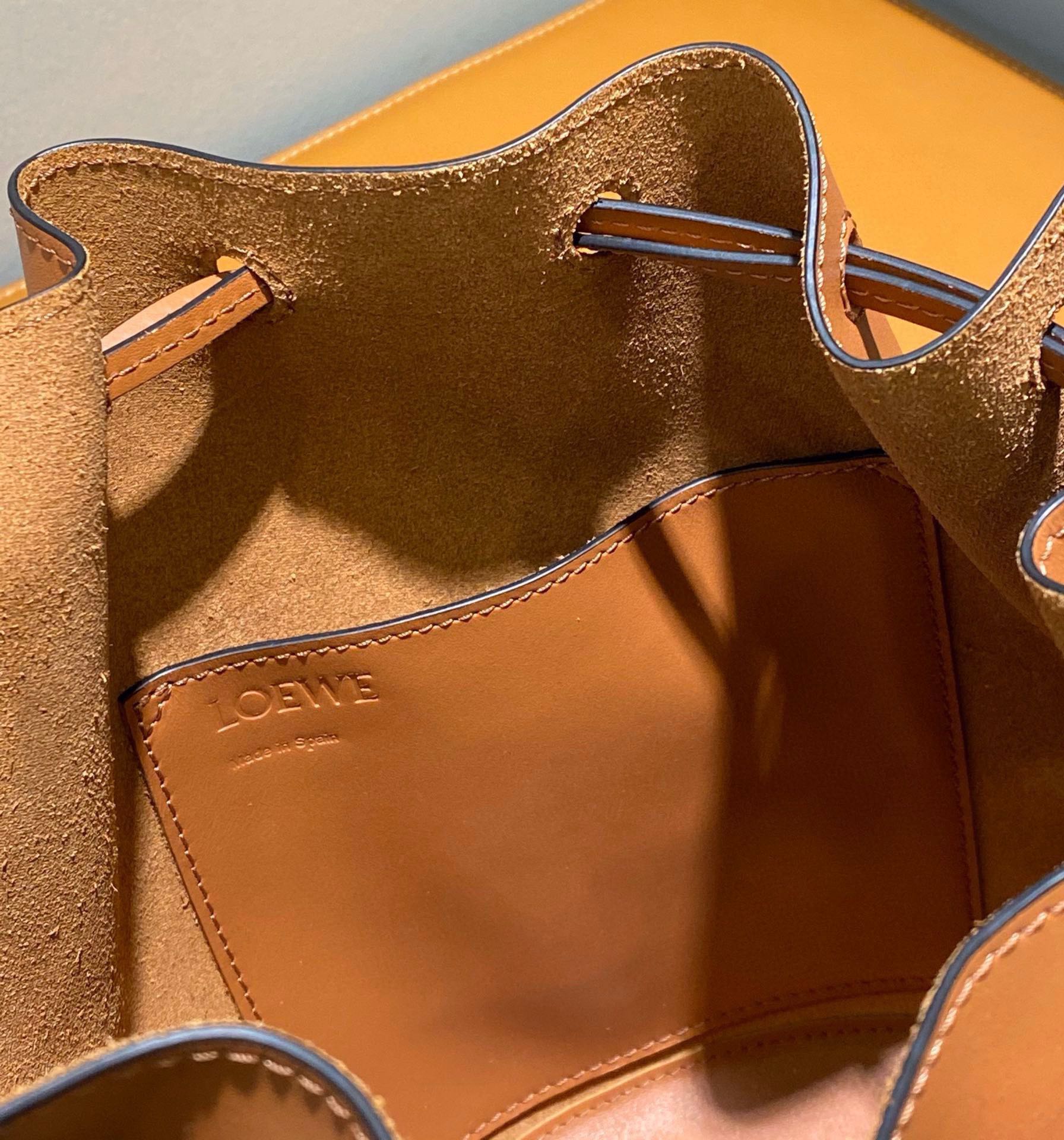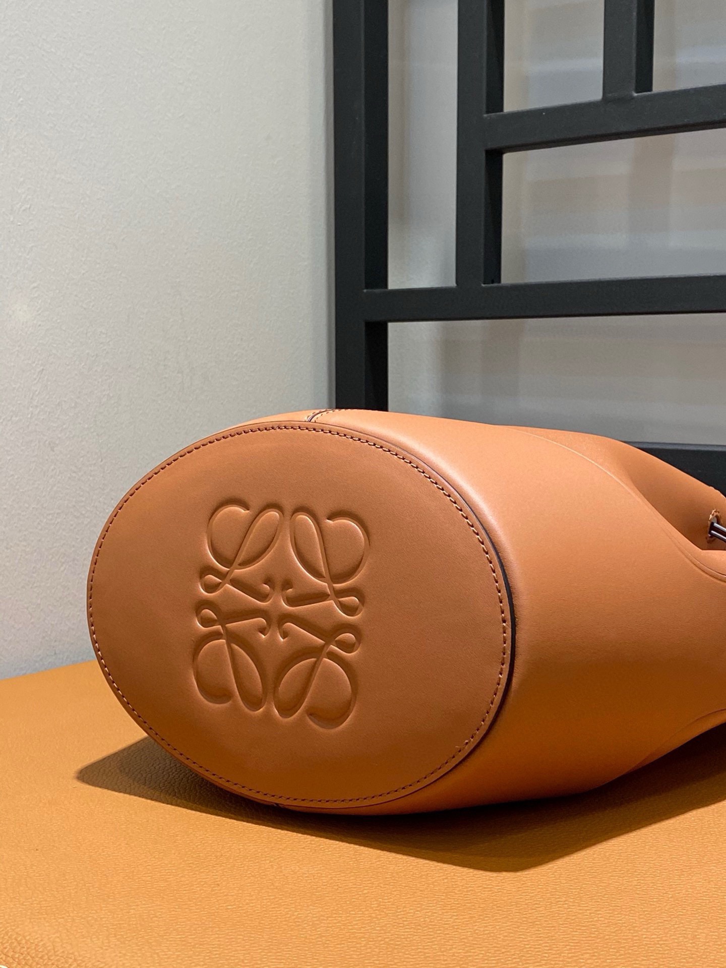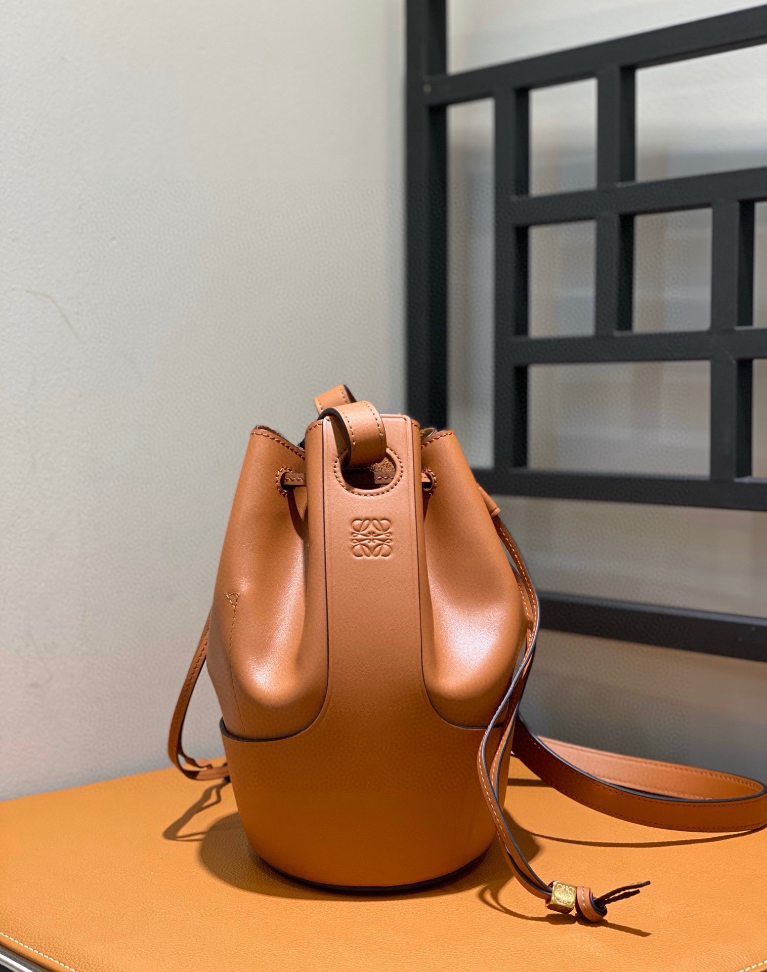 The Loewe Balloon Bucket Bag features a drawstring closure, leather construction, and versatile carrying options. Size: 21.5*31*16cm.