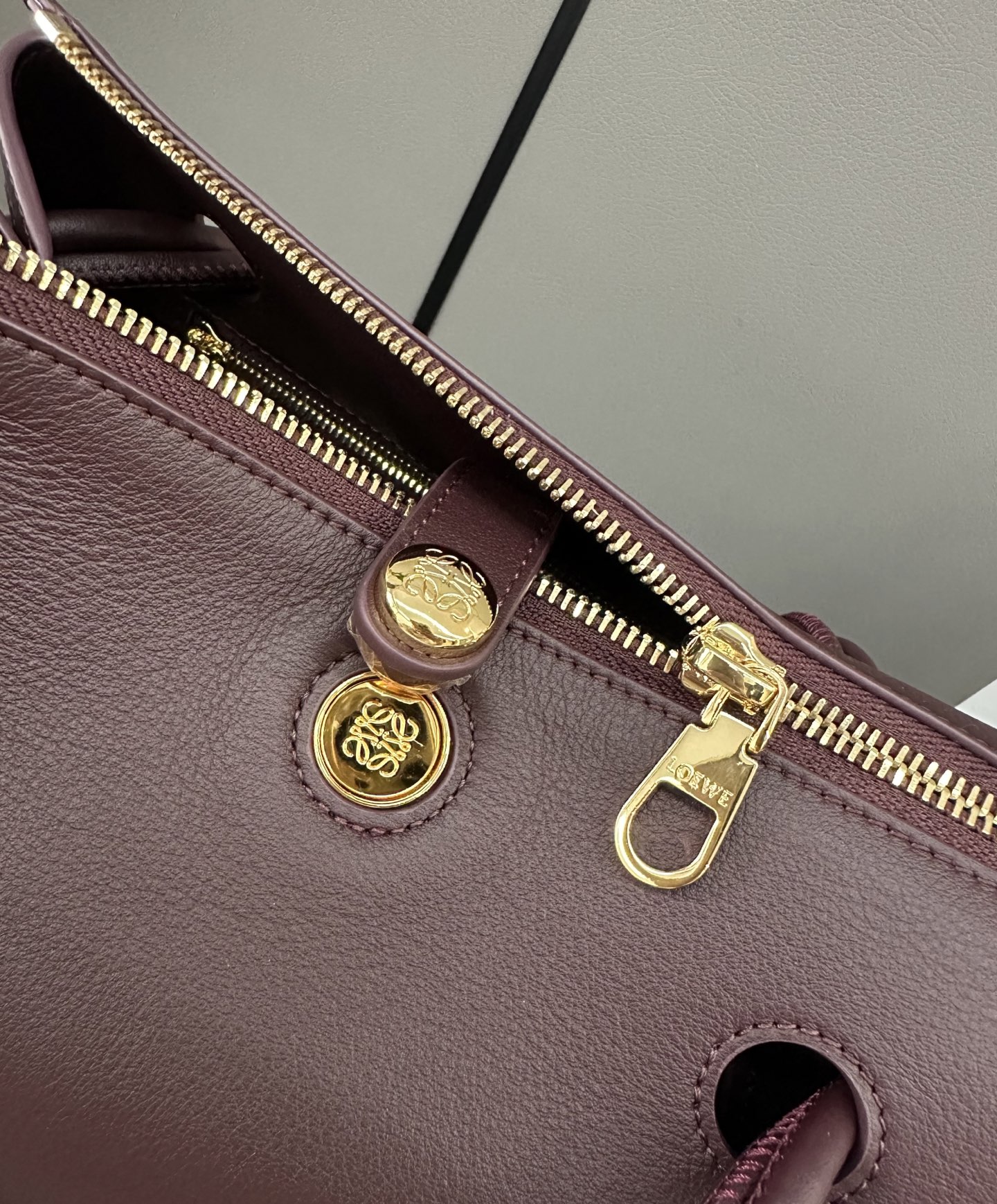The Loewe Madrid handbag presents a blend of structured design and soft, luxurious materials. Its unique trapezoid shape and functional features make it a versatile accessory for various occasions.