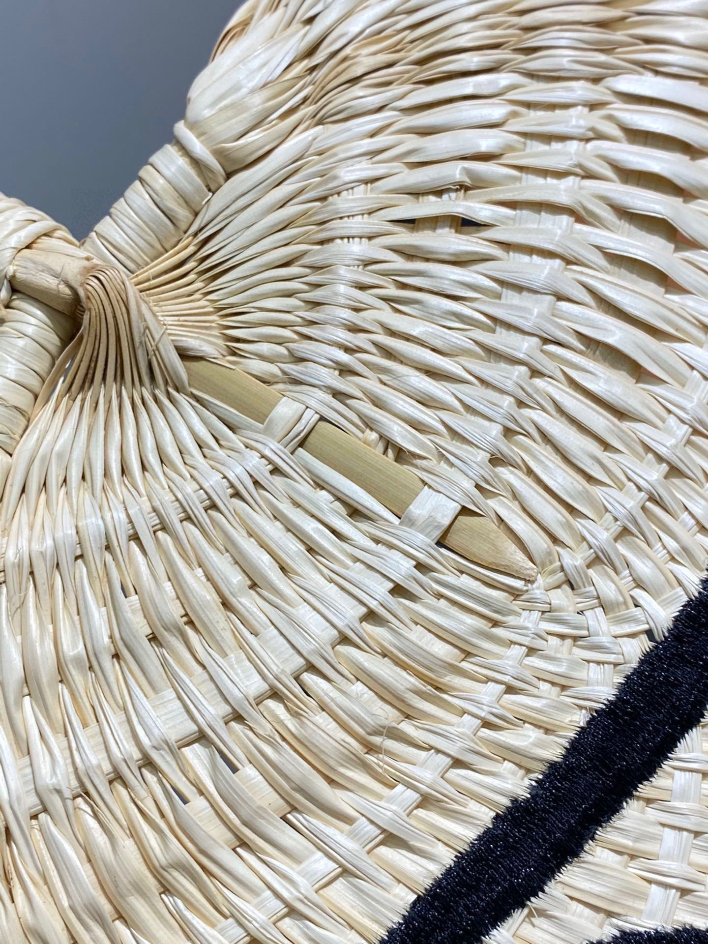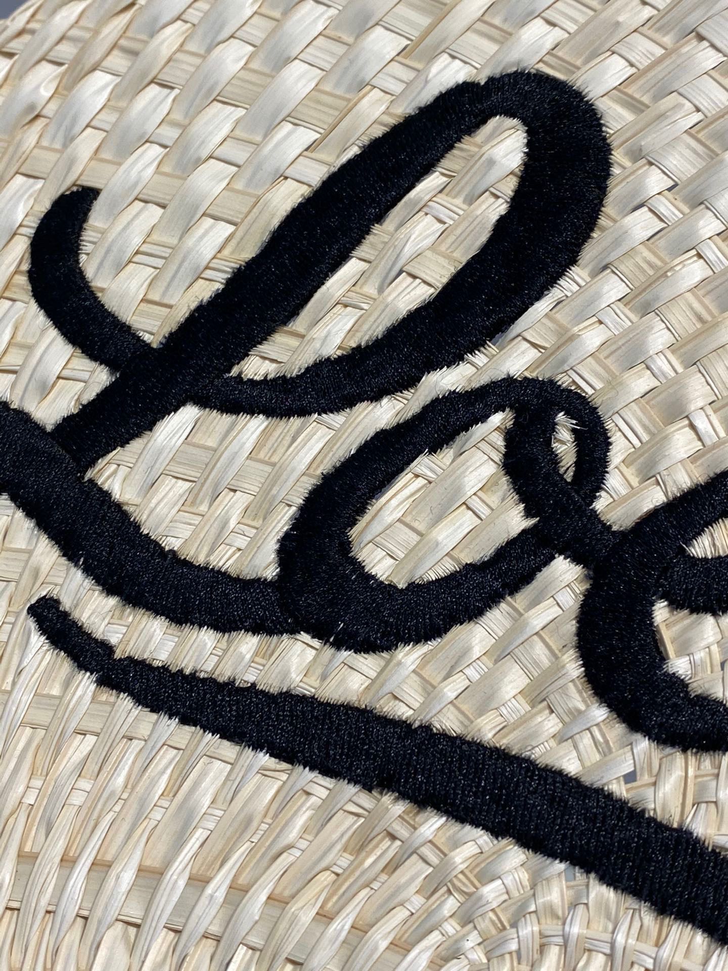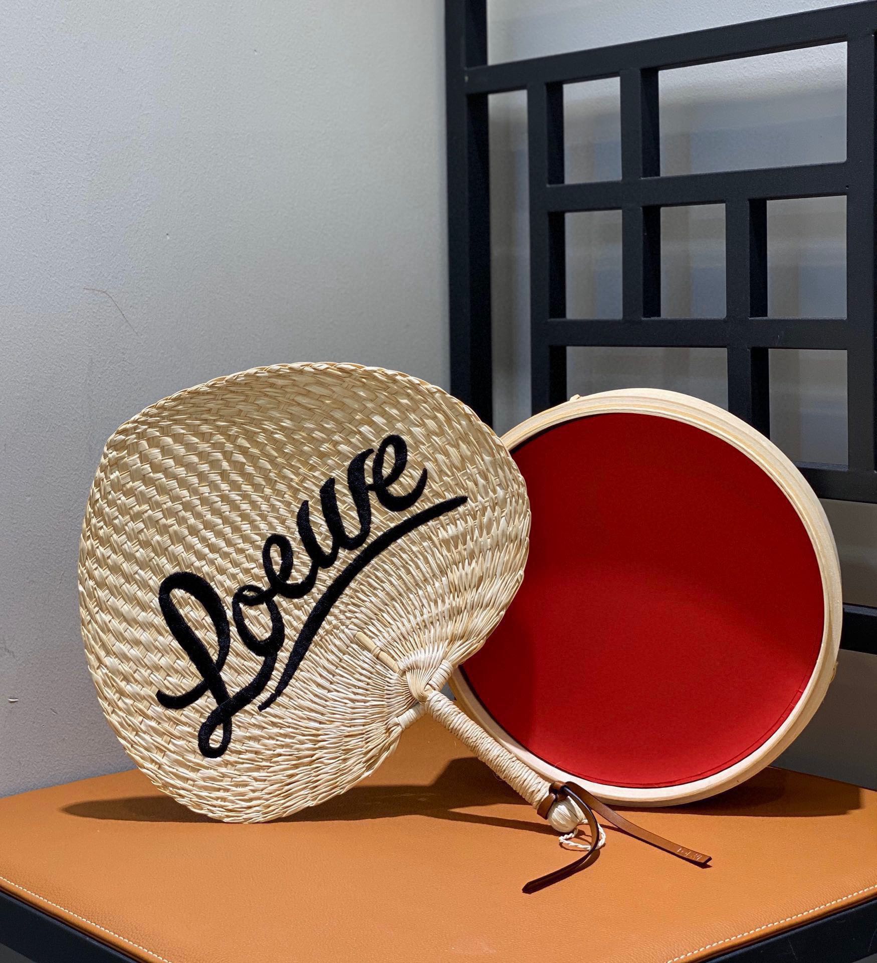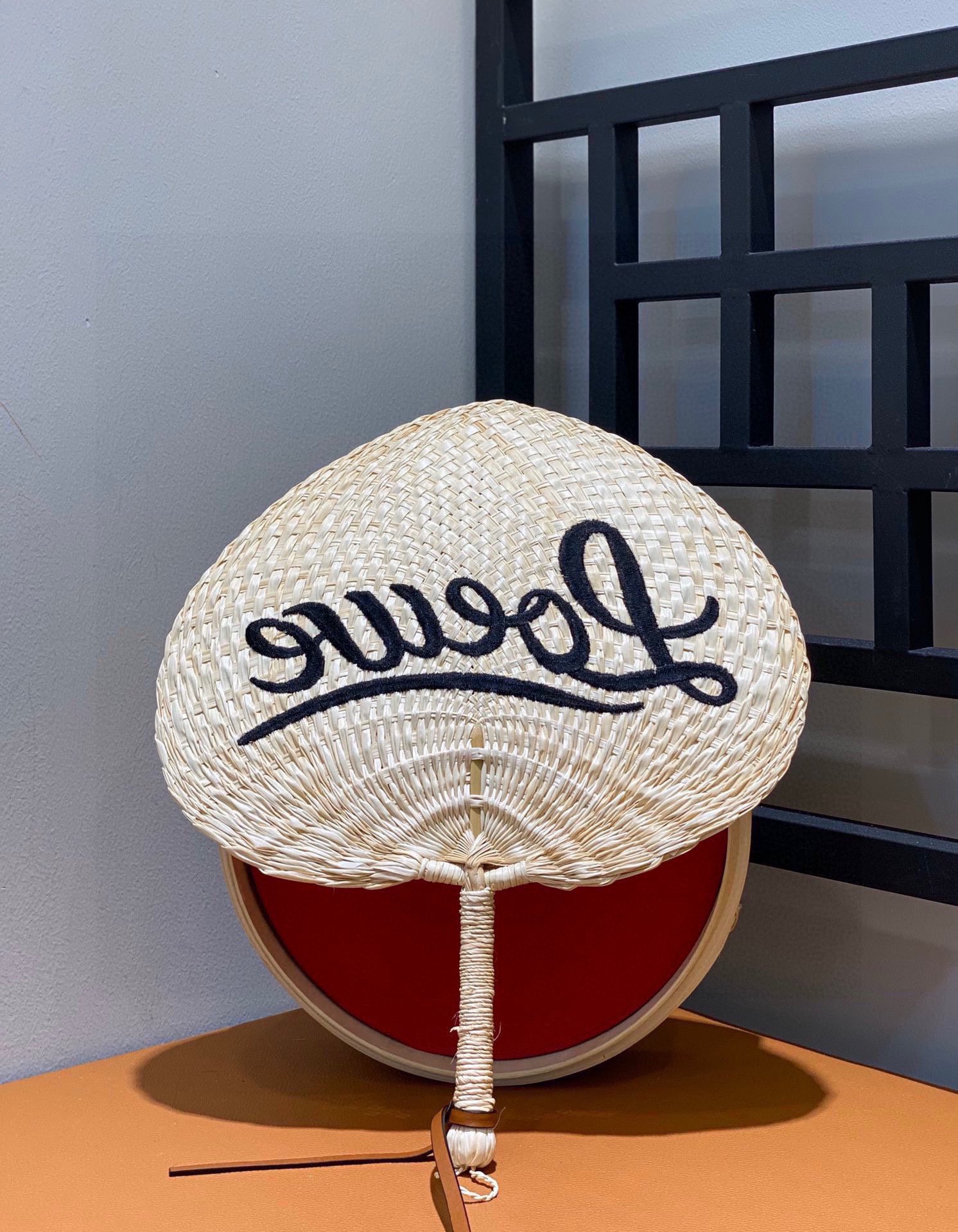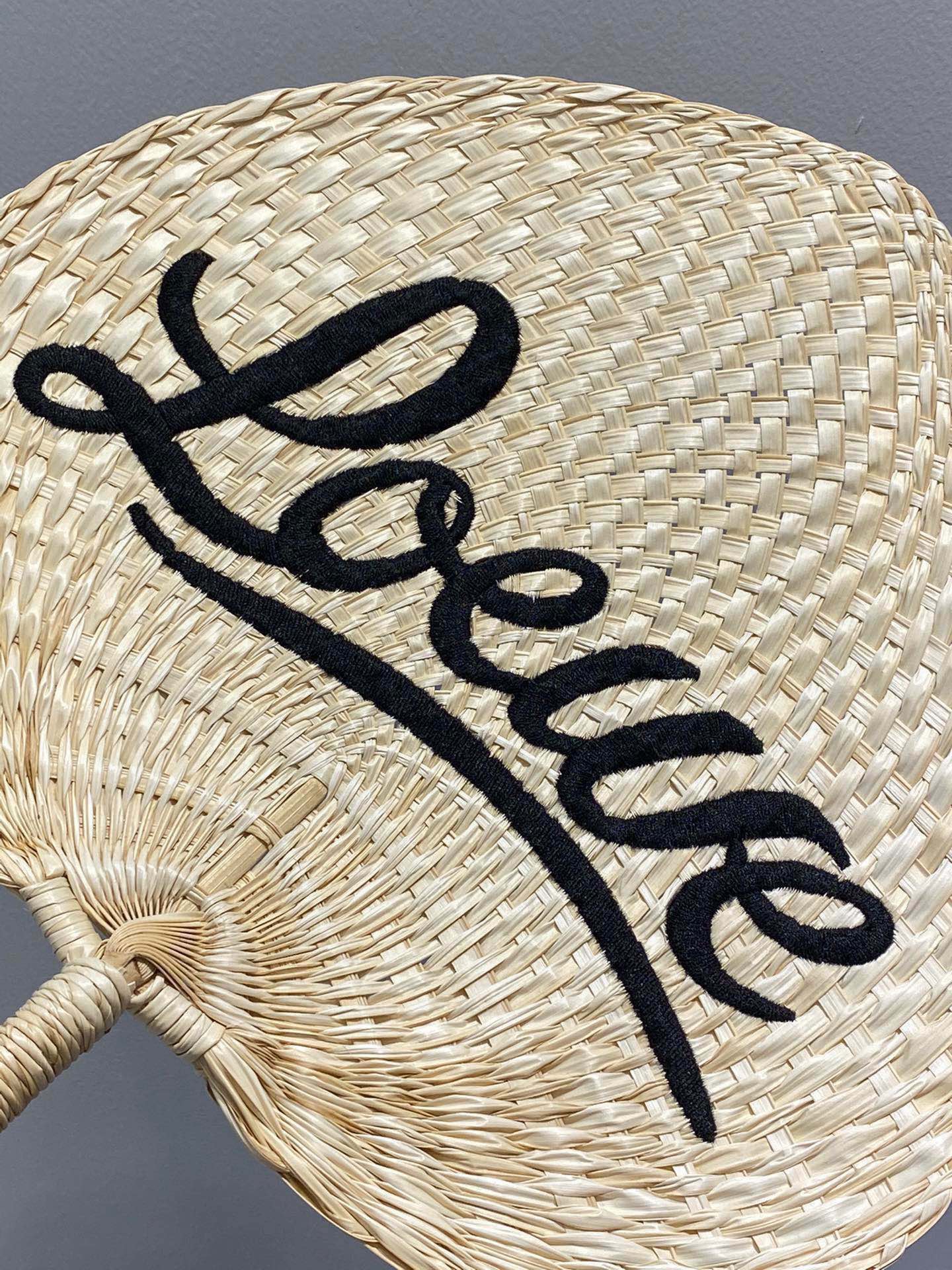Elevate your style with the Loewe Paula's Ibiza fan. Handwoven straw with an embroidered logo, perfect for staying cool and making a statement.