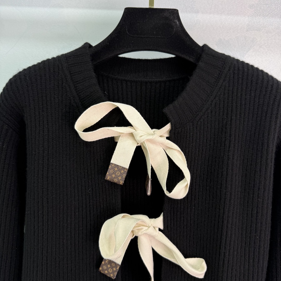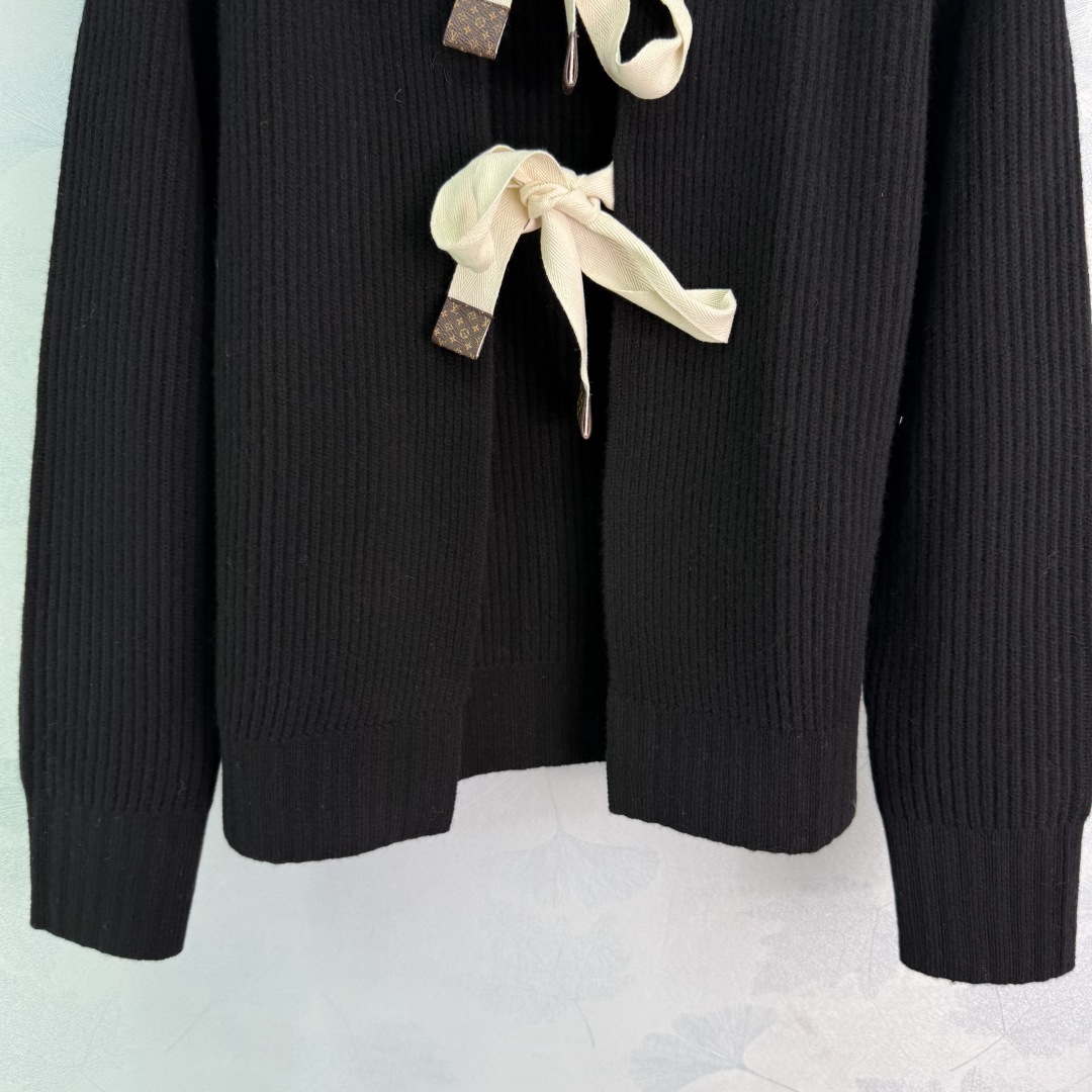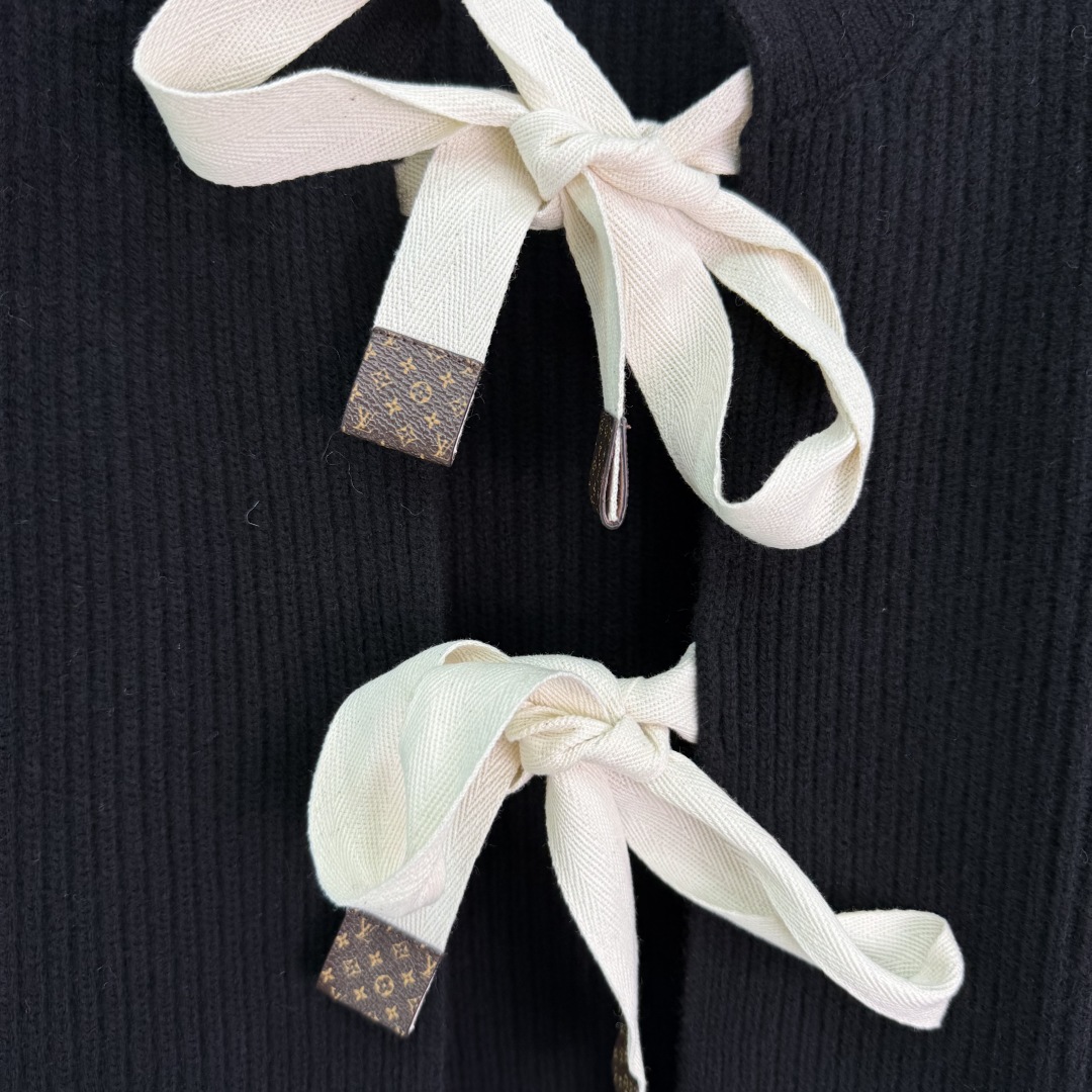 Elegant Louis Vuitton black cashmere cardigan featuring delicate bow accents for a touch of sophistication and timeless style. Perfect for layering.